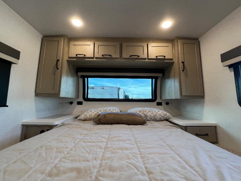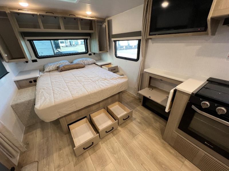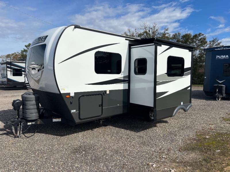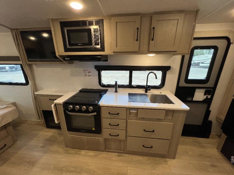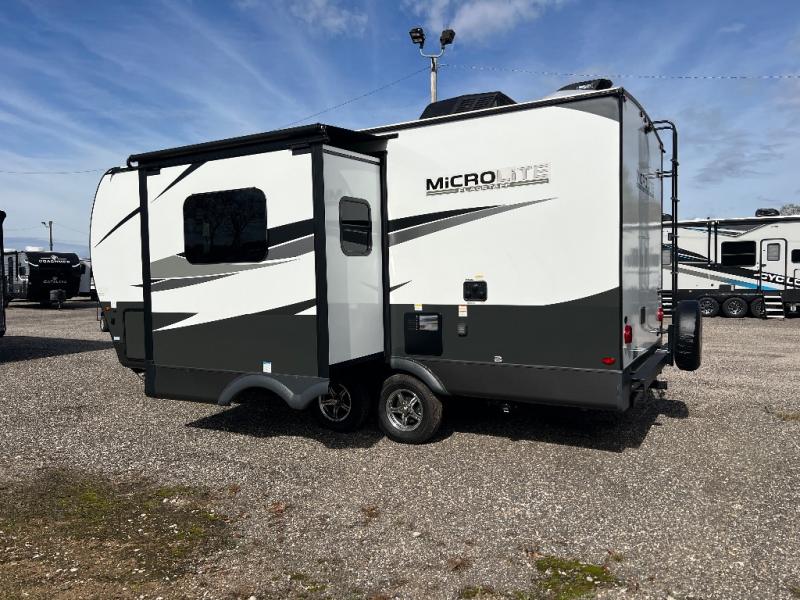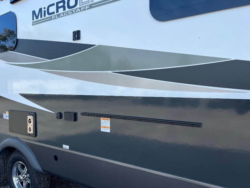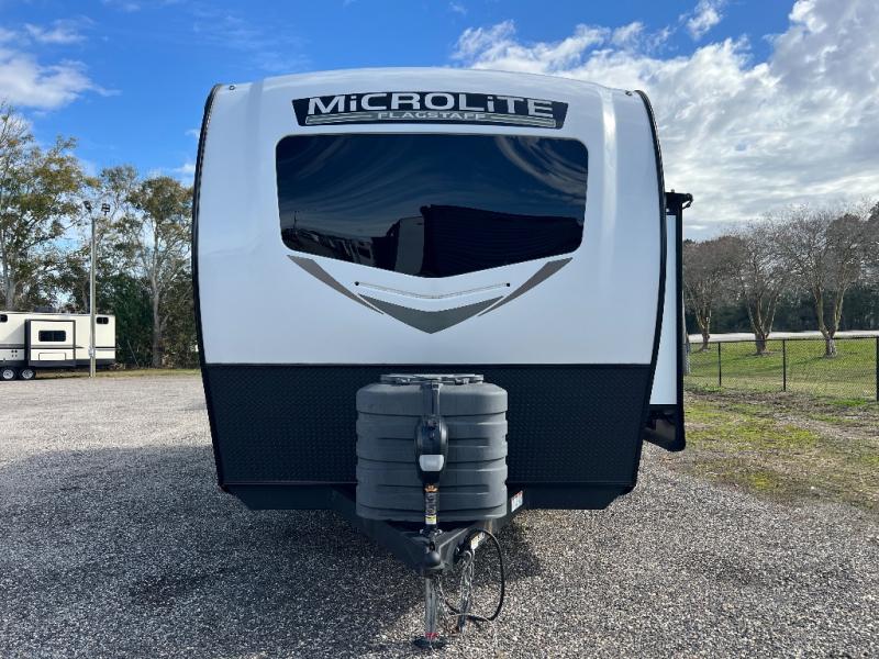 With any Flagstaff Micro Lite travel trailer by Forest River you will enjoy lightweight towing, durable construction, and added interior comforts to make each trip memorable! Each model features a torsion axle, Rubber-Ryde suspension, nitrogen filled, Goodyear Endurance tires, and easy lube axles with Nev-R-Adjust brakes for smooth towing from home to campground. The 6-sided aluminum framed construction provides a strong foundation so you can enjoy your RV for years to come, plus electronically controlled heated holding tanks and an enclosed underbelly will let you camp all year long. Head inside to find hybrid woven flooring in the slide outs, Sedona wood cabinetry, solid surface kitchen countertops, and many more amenities. These travel trailers also include exterior conveniences for hassle-free camping, like the power tongue jack, magnetic compartment door catches, Keyed Alike locks, and rear ladder to name a few!