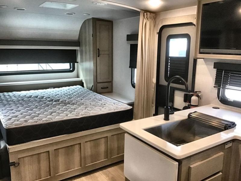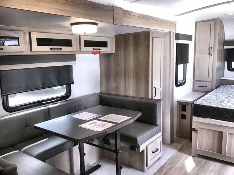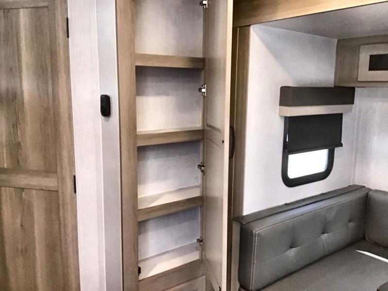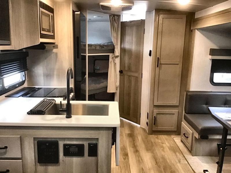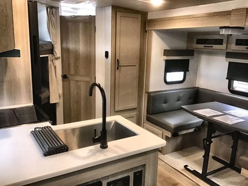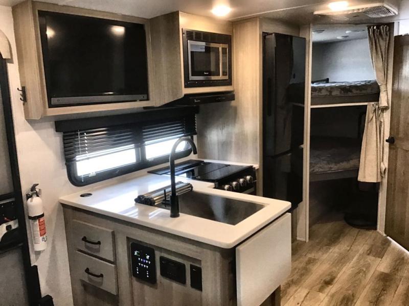 With any Flagstaff Micro Lite travel trailer by Forest River you will enjoy lightweight towing, durable construction, and added interior comforts to make each trip memorable! Each model features a torsion axle, Rubber-Ryde suspension, nitrogen filled, Goodyear Endurance tires, and easy lube axles with Nev-R-Adjust brakes for smooth towing from home to campground. The 6-sided aluminum framed construction provides a strong foundation so you can enjoy your RV for years to come, plus electronically controlled heated holding tanks and an enclosed underbelly will let you camp all year long. Head inside to find hybrid woven flooring in the slide outs, Sedona wood cabinetry, solid surface kitchen countertops, and many more amenities. These travel trailers also include exterior conveniences for hassle-free camping, like the power tongue jack, magnetic compartment door catches, Keyed Alike locks, and rear ladder to name a few!