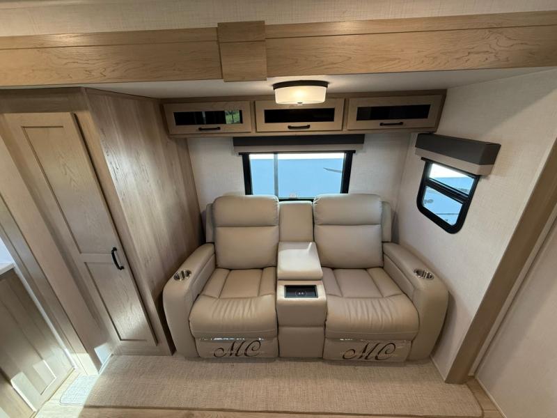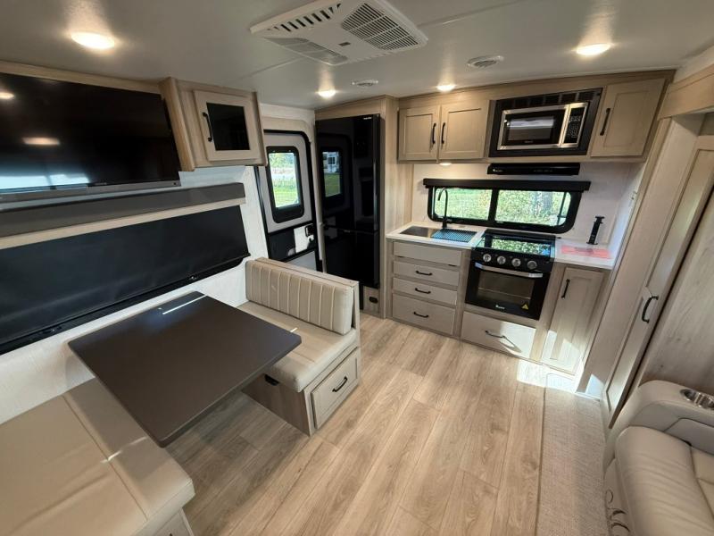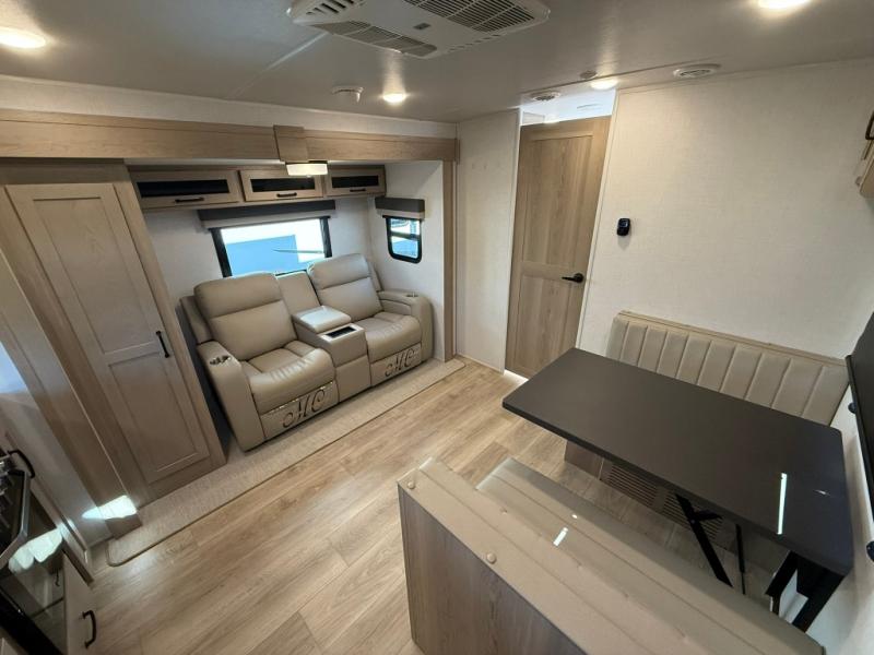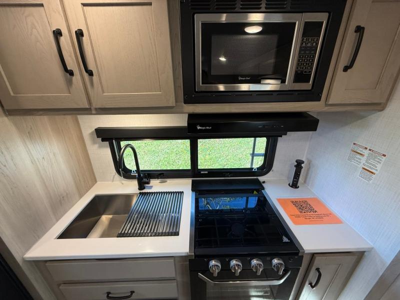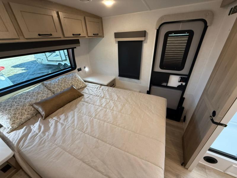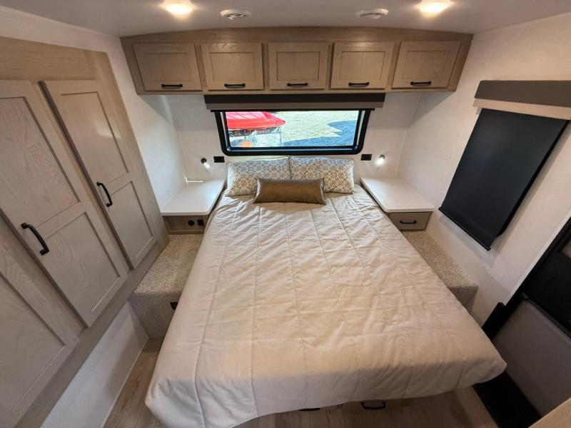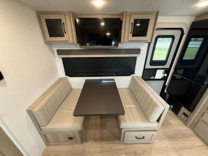 Trips to your favorite campground are made complete with this dual slide out, dual entry trailer! One entry goes straight into the front master bedroom where you'll find an RV queen bed with flip-up storage, a wardrobe slide out, and easy access into the walk-through bath. Once you're through the bath, you'll find the main living area, rear kitchen, and the second entry door at the back. Your crew can play a game at the 39" booth dinette or relax on the theater seat across from the TV. The kitchen includes everything you need to prepare meals in the morning, including a three burner cooktop and microwave oven, plus a 12V refrigerator and a pantry for food storage.