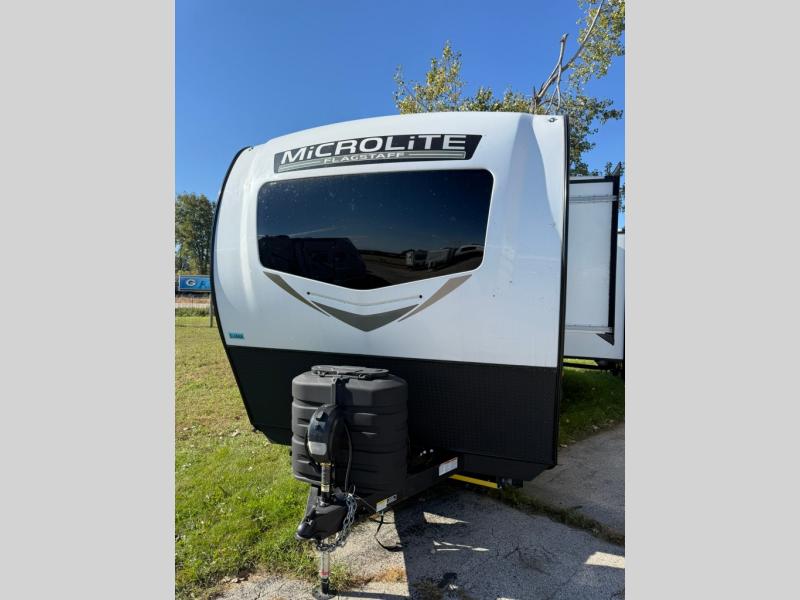 With any Flagstaff Micro Lite travel trailer by Forest River you will enjoy lightweight towing, durable construction, and added interior comforts to make each trip memorable! Each model features a torsion axle, Rubber-Ryde suspension, nitrogen filled, Goodyear Endurance tires, and easy lube axles with Nev-R-Adjust brakes for smooth towing from home to campground. The 6-sided aluminum framed construction provides a strong foundation so you can enjoy your RV for years to come, plus electronically controlled heated holding tanks and an enclosed underbelly will let you camp all year long. Head inside to find hybrid woven flooring in the slide outs, Sedona wood cabinetry, solid surface kitchen countertops, and many more amenities. These travel trailers also include exterior conveniences for hassle-free camping, like the power tongue jack, magnetic compartment door catches, Keyed Alike locks, and rear ladder to name a few!