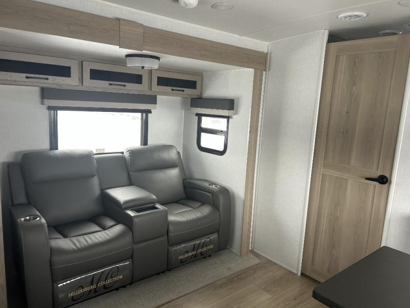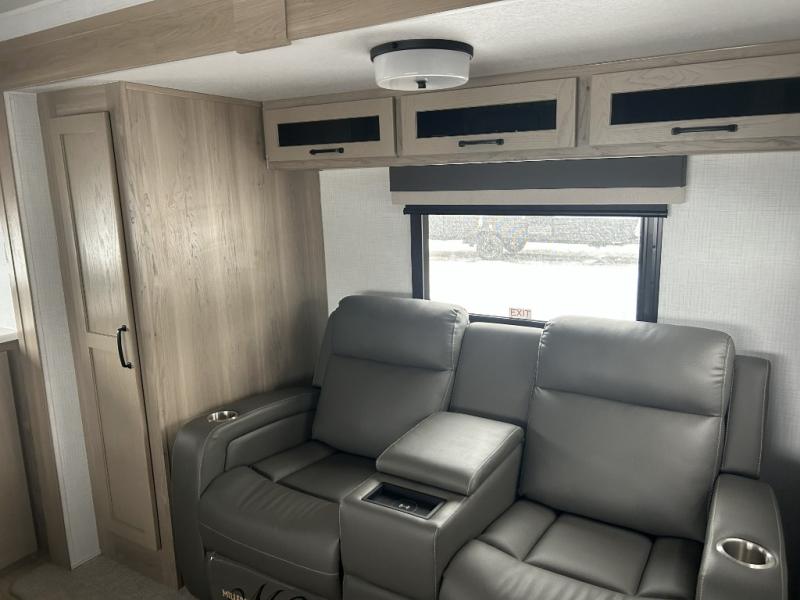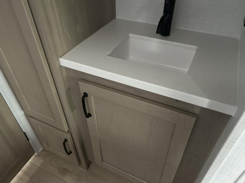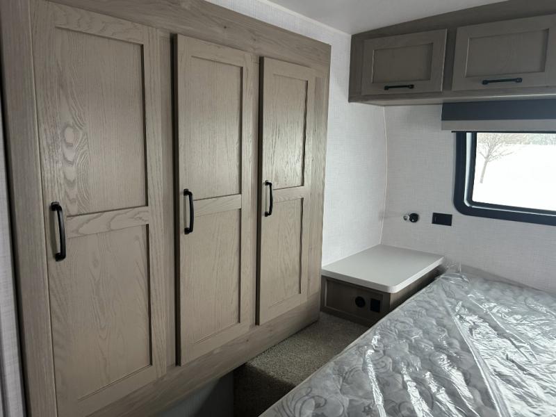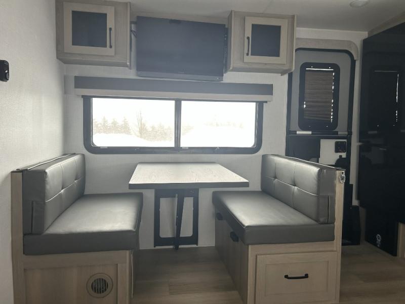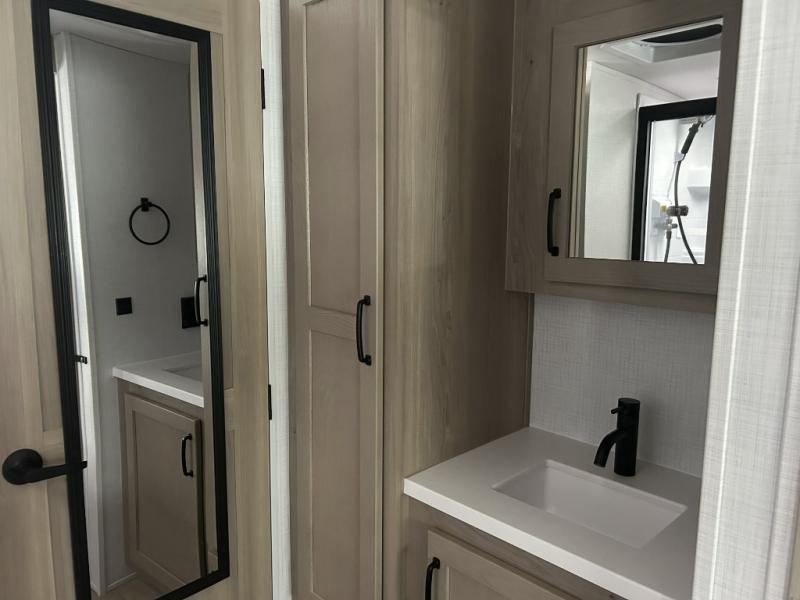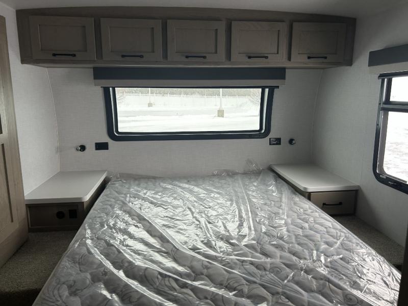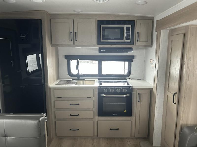 Trips to your favorite campground are made complete with this dual slide out, dual entry trailer! One entry goes straight into the front master bedroom where you'll find an RV queen bed with flip-up storage, a wardrobe slide out, and easy access into the walk-through bath. Once you're through the bath, you'll find the main living area, rear kitchen, and the second entry door at the back. Your crew can play a game at the 39" booth dinette or relax on the theater seat across from the TV. The kitchen includes everything you need to prepare meals in the morning, including a three burner cooktop and microwave oven, plus a 12V refrigerator and a pantry for food storage.