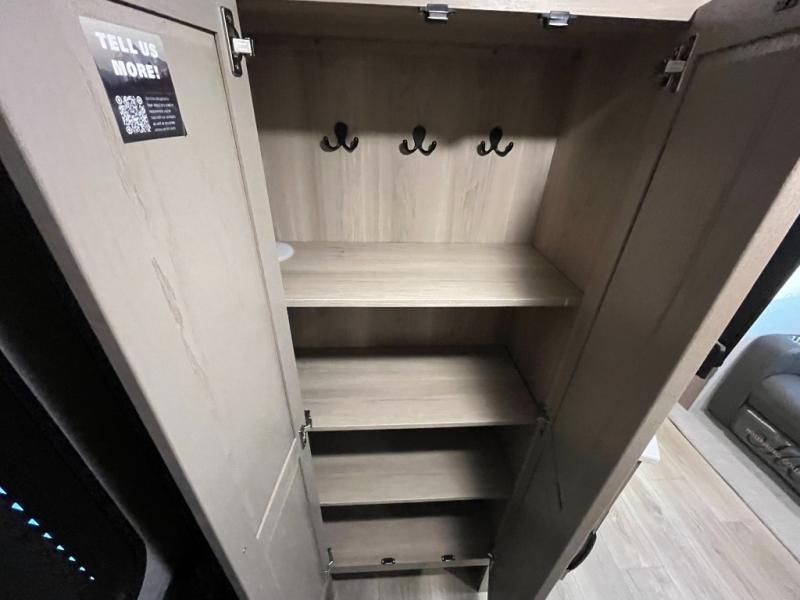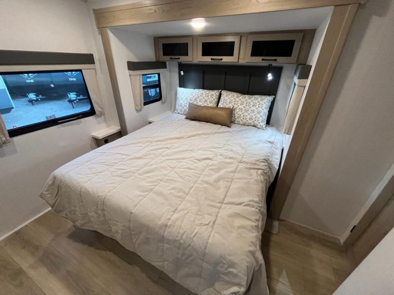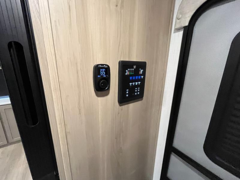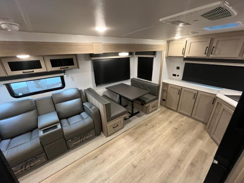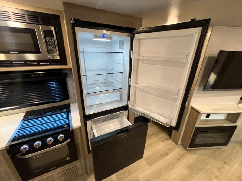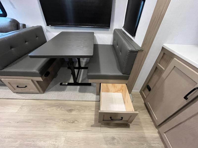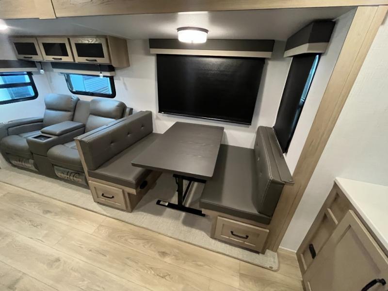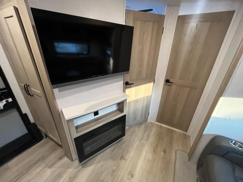 This is the perfect couples trailer with a spacious living and kitchen area and a rear bedroom which includes the second exterior entry/exit door! The bedroom also provides a slide out queen bed, a wardrobe and an optional TV, plus windows for great views and access to the double entry bathroom. The front kitchen gives the cook counter space and cabinetry for dishes and such, plus all the appliances needed to make warm meals and store leftovers. You can dine at the booth dinette, relax on the 67" theater seating and watch the Smart TV while enjoying the fireplace.