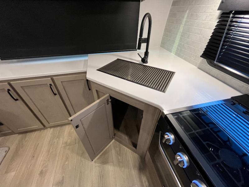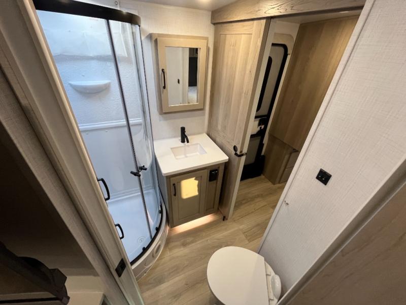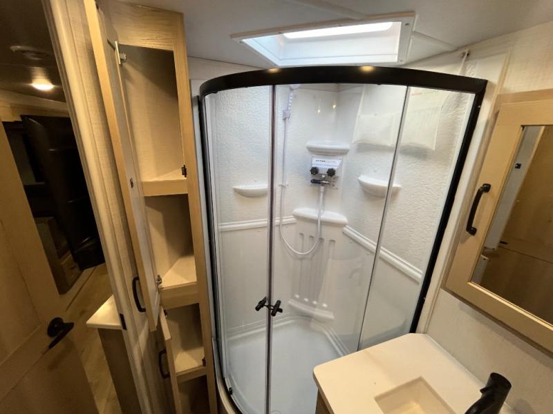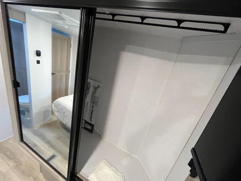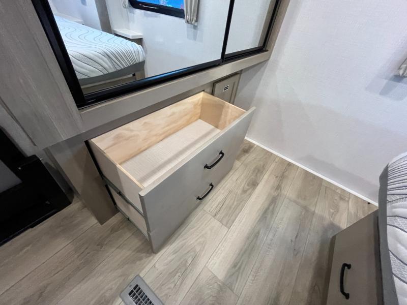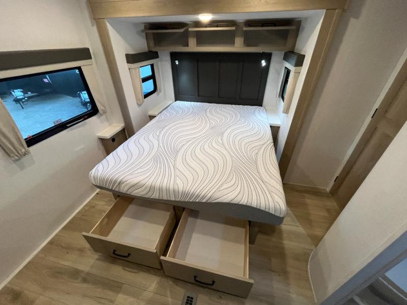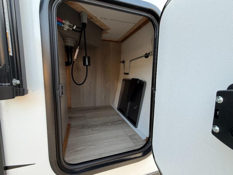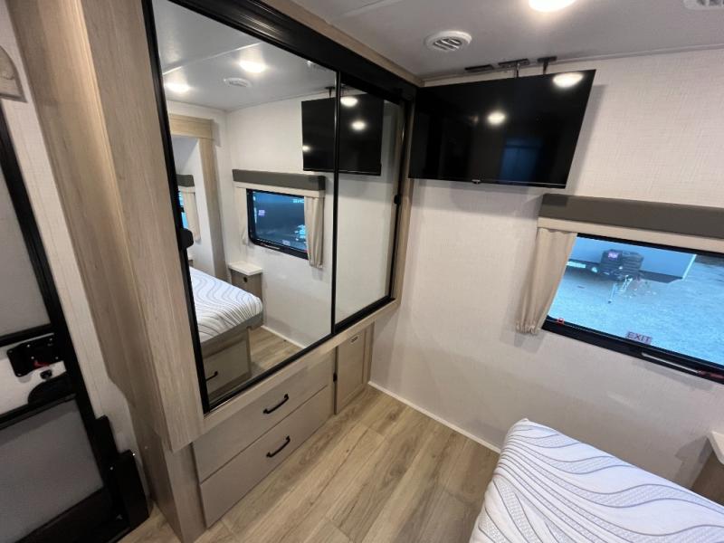This is the perfect couples trailer with a spacious living and kitchen area and a rear bedroom which includes the second exterior entry/exit door! The bedroom also provides a slide out queen bed, a wardrobe and an optional TV, plus windows for great views and access to the double entry bathroom. The front kitchen gives the cook counter space and cabinetry for dishes and such, plus all the appliances needed to make warm meals and store leftovers. You can dine at the booth dinette, relax on the 67" theater seating and watch the Smart TV while enjoying the fireplace.