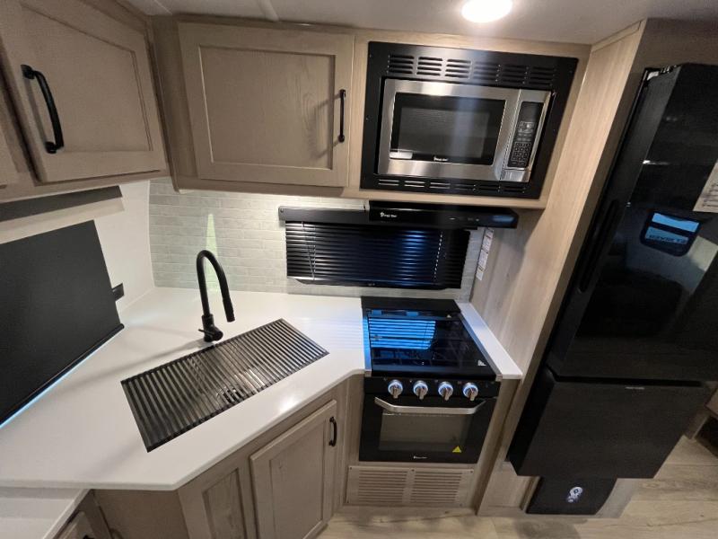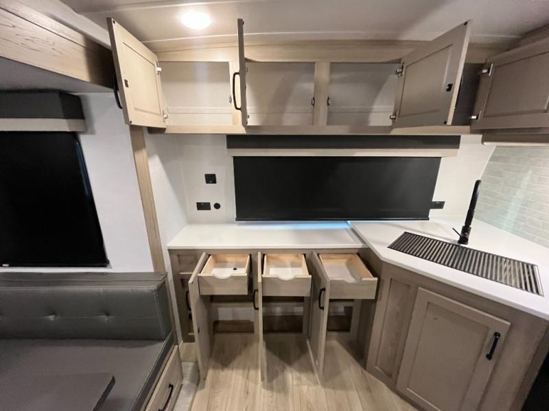 With any Flagstaff Super Lite travel trailer by Forest River the towing features include the TST tire pressure monitor system with a monitor providing safety on the road, Easy Lube axles and Nev-R adjust brakes, a power tongue jack for easy setup, and rear observation camera prep. Each is built with 6 sided aluminum framed side walls, end wall, front, floor and a roof, a plywood tongue and groove subfloor, electronically controlled heated holding tanks and an enclosed underbelly allowing you to travel during any season. The interior includes designer kitchen backsplash, solid surface kitchen countertops, Sedonwood cabinetry, and solid wood cabinet doors and drawers to make you feel right at home.