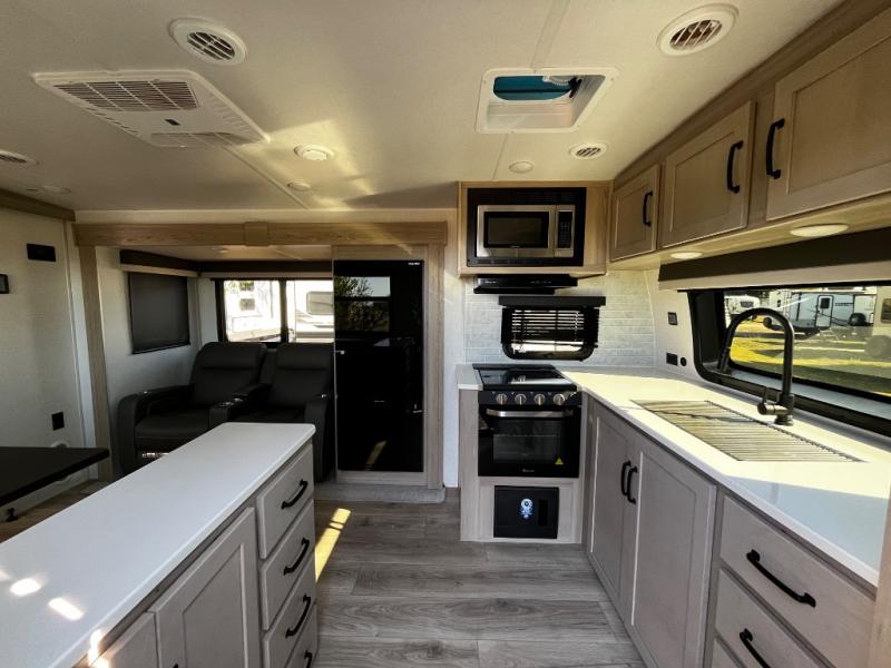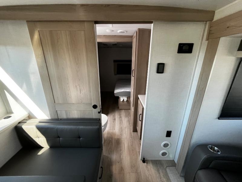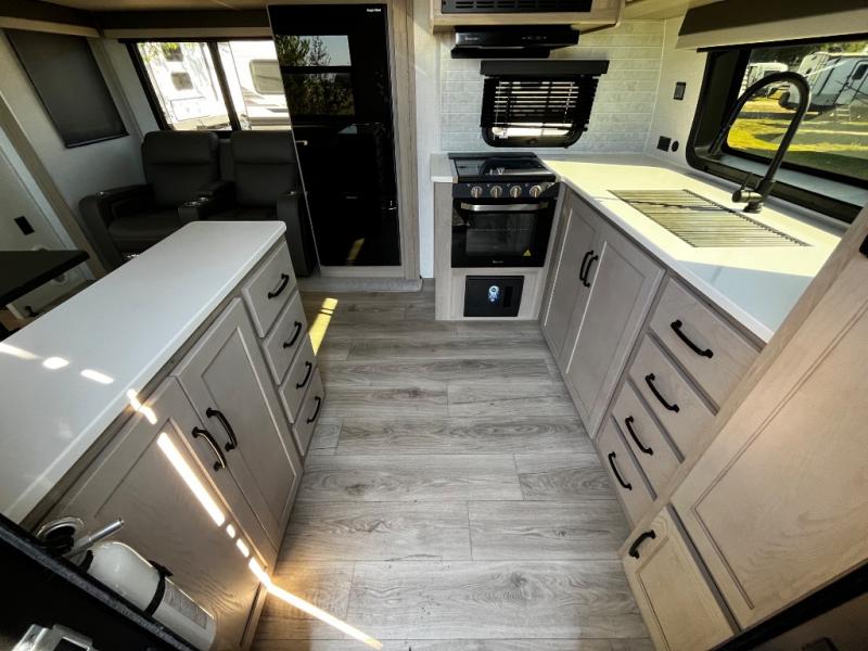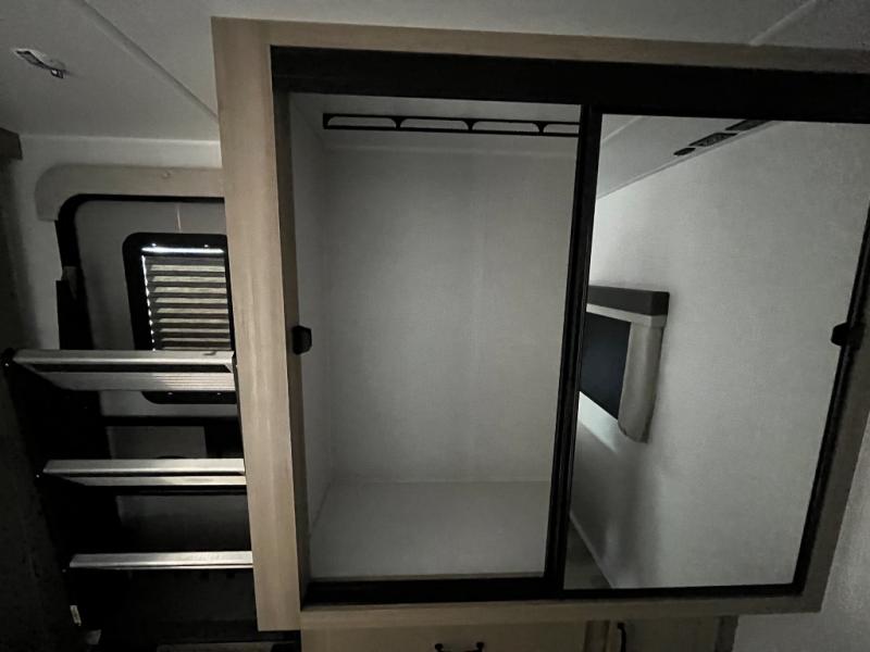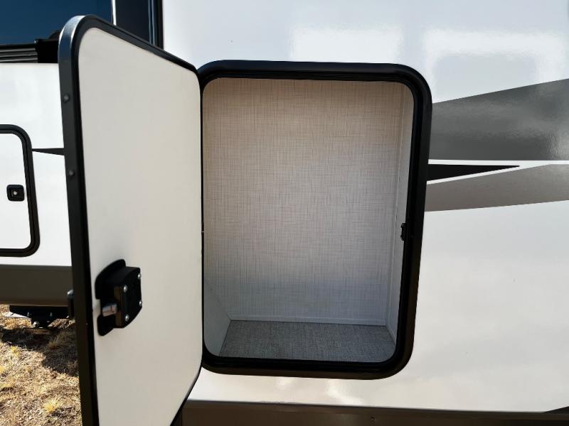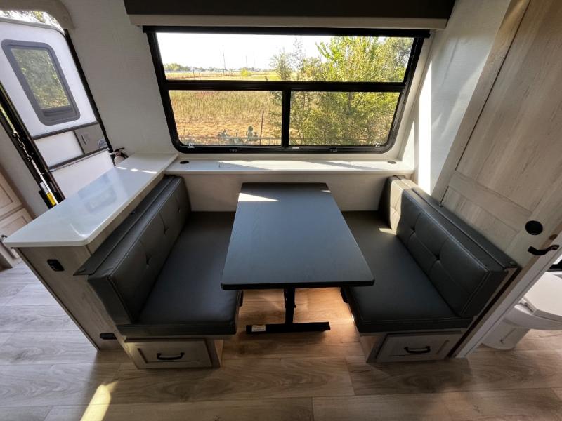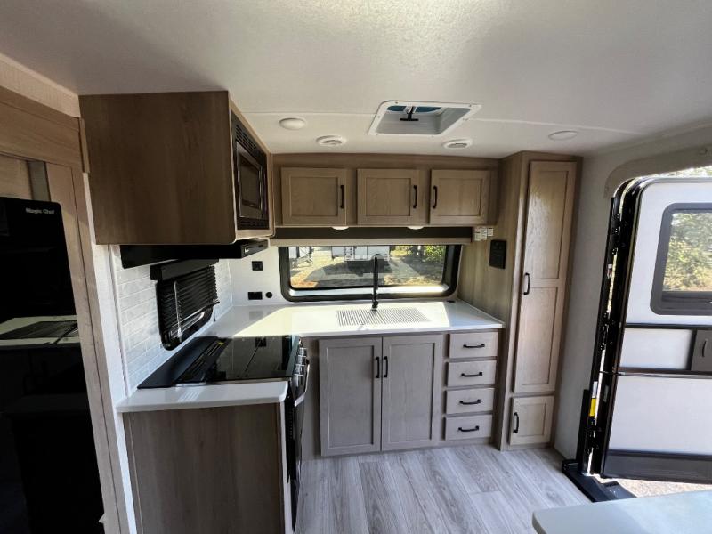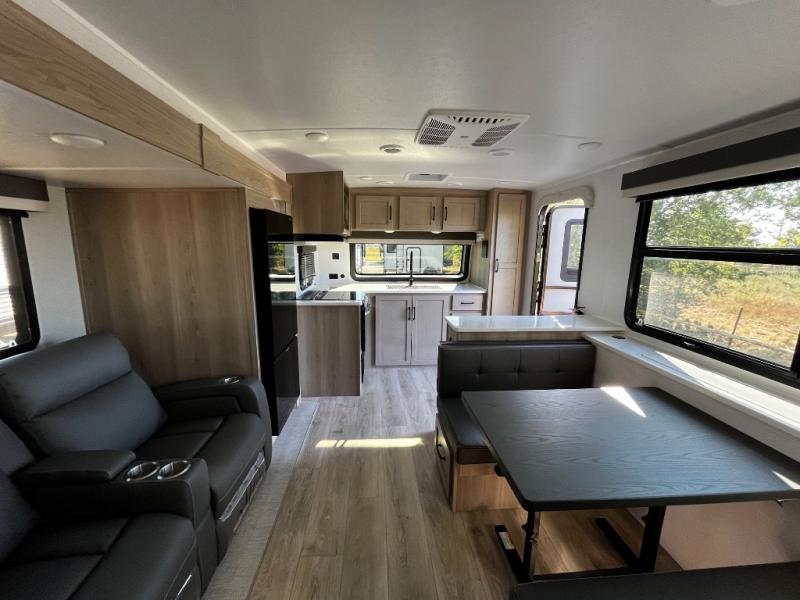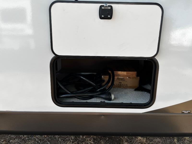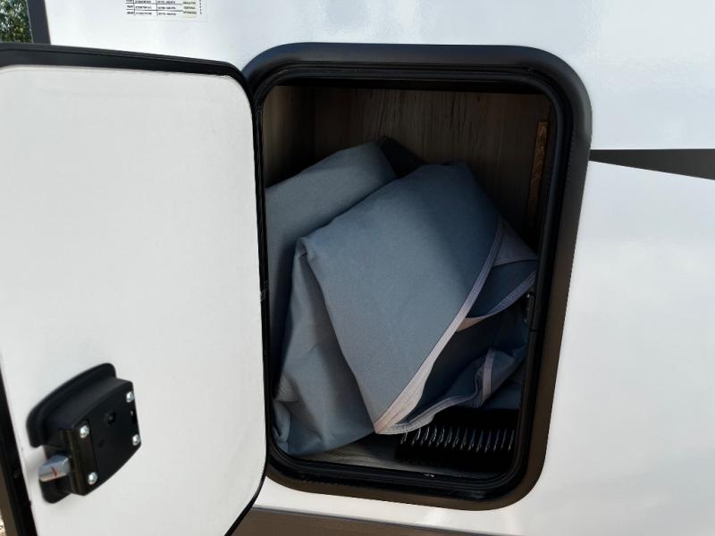 It will be so easy to enjoy time at the campground in this cozy travel trailer. The full kitchen includes a three burner gas oven, a microwave oven, and a 12V refrigerator to cook and store food, and the pantry will let you stock up on snacks. Your crew can get comfortable on the theater seat or play a game at the 39" booth dinette, and there is a 40" TV with a lift here to make it a movie night. The walk-thru bath will let you freshen up each day, and the queen bed in the rear bedroom is sure to bring comfort. You will also find one of the dual entry doors here for convenience plus a wardrobe for clothes storage and an optional TV if you want to add a television. The exterior is just as accommodating with its pass-thru storage, exterior griddle, and 21' awning!