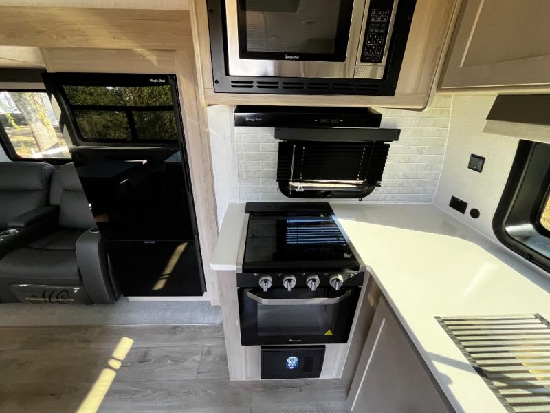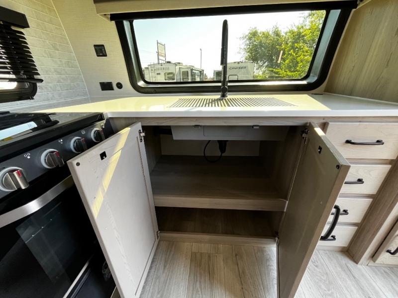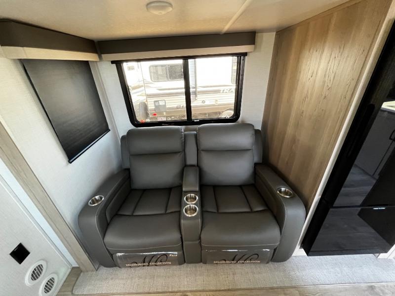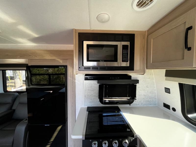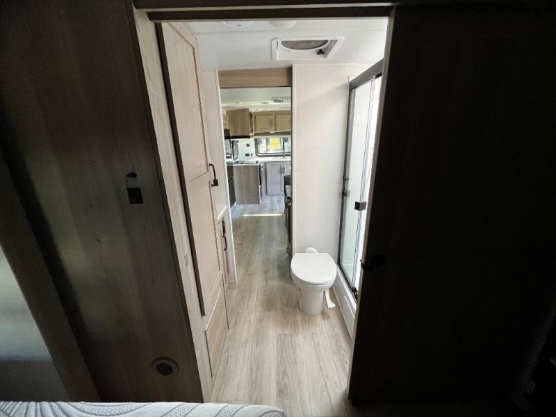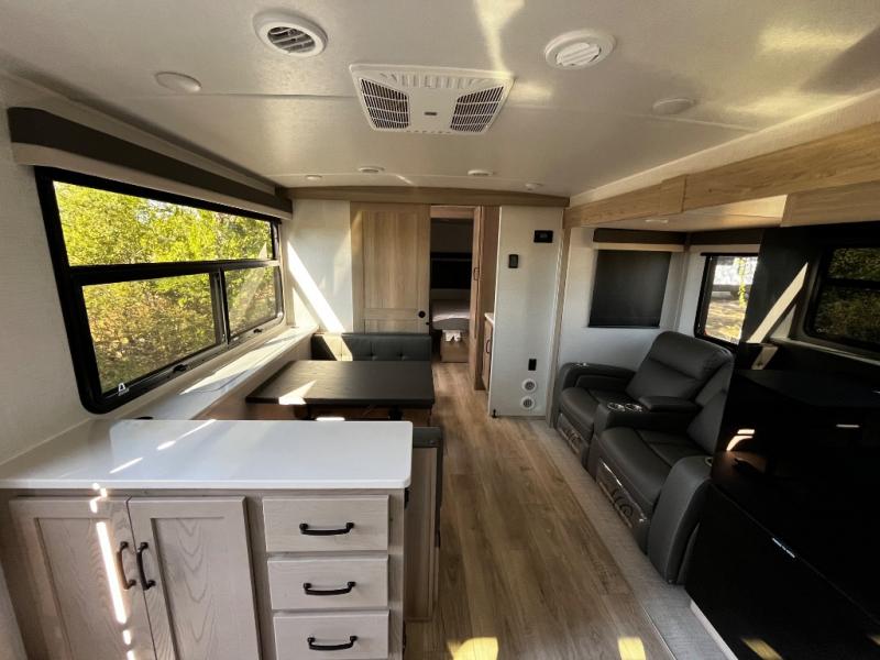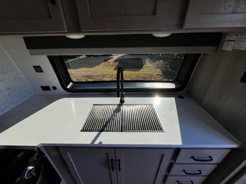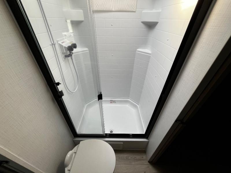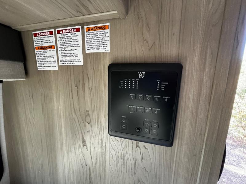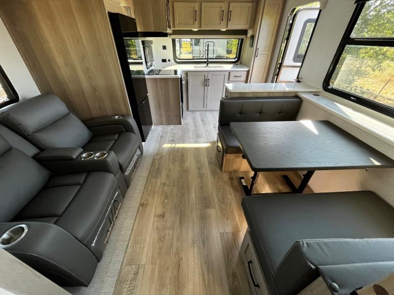 It will be so easy to enjoy time at the campground in this cozy travel trailer. The full kitchen includes a three burner gas oven, a microwave oven, and a 12V refrigerator to cook and store food, and the pantry will let you stock up on snacks. Your crew can get comfortable on the theater seat or play a game at the 39" booth dinette, and there is a 40" TV with a lift here to make it a movie night. The walk-thru bath will let you freshen up each day, and the queen bed in the rear bedroom is sure to bring comfort. You will also find one of the dual entry doors here for convenience plus a wardrobe for clothes storage and an optional TV if you want to add a television. The exterior is just as accommodating with its pass-thru storage, exterior griddle, and 21' awning!