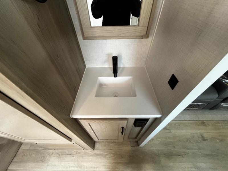 With any Flagstaff Super Lite travel trailer by Forest River the towing features include the TST tire pressure monitor system with a monitor providing safety on the road, Easy Lube axles and Nev-R adjust brakes, a power tongue jack for easy setup, and rear observation camera prep. Each is built with 6 sided aluminum framed side walls, end wall, front, floor and a roof, a plywood tongue and groove subfloor, electronically controlled heated holding tanks and an enclosed underbelly allowing you to travel during any season. The interior includes designer kitchen backsplash, solid surface kitchen countertops, Sedonwood cabinetry, and solid wood cabinet doors and drawers to make you feel right at home.