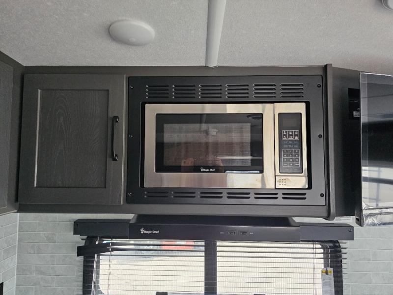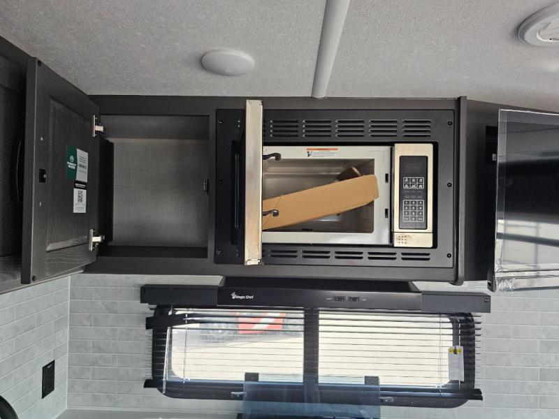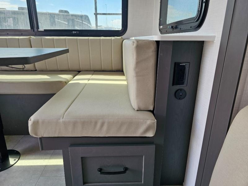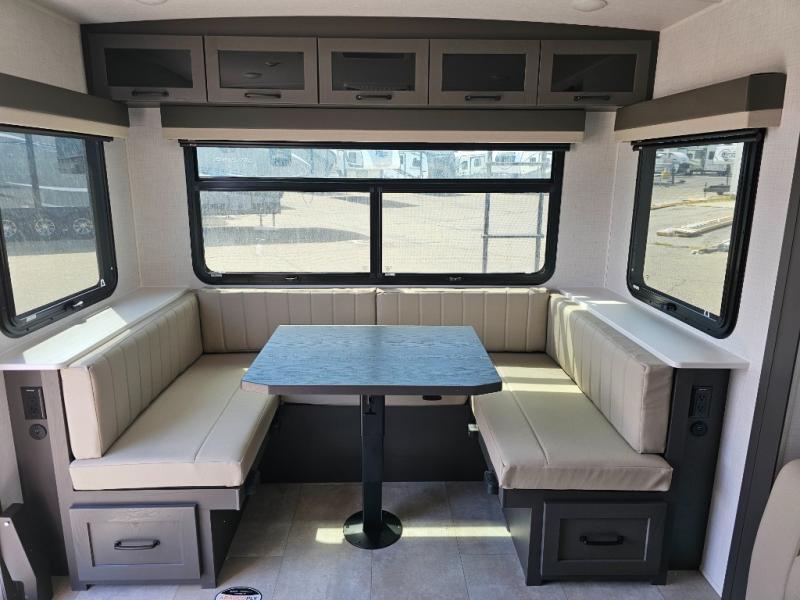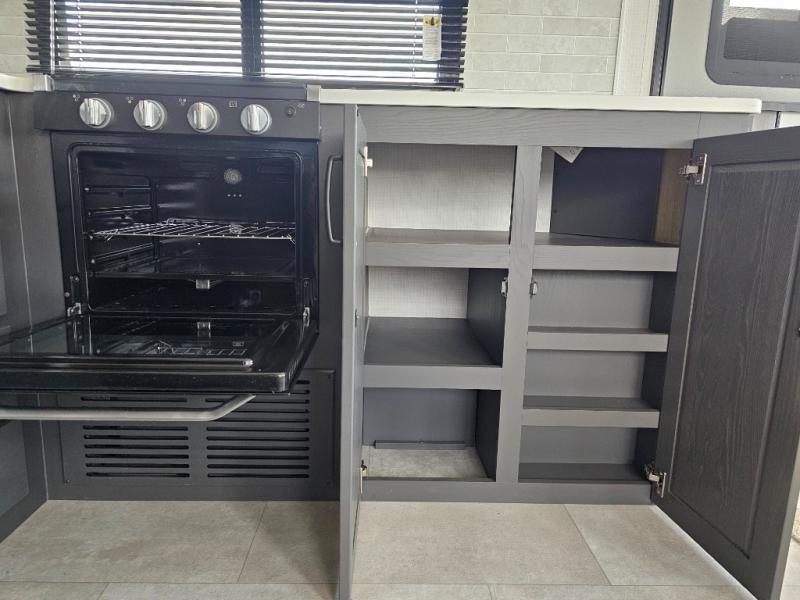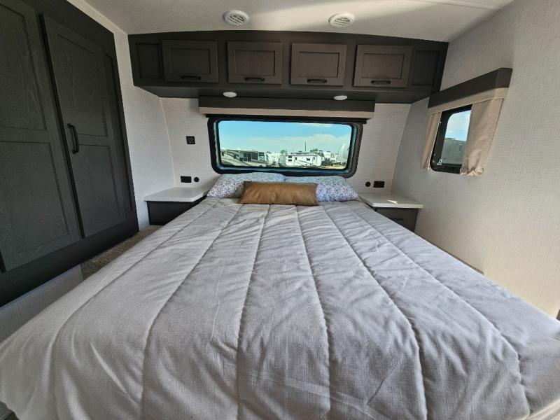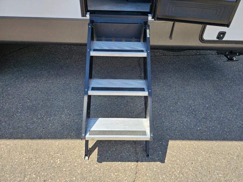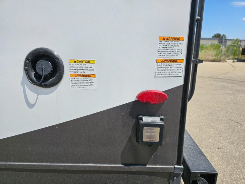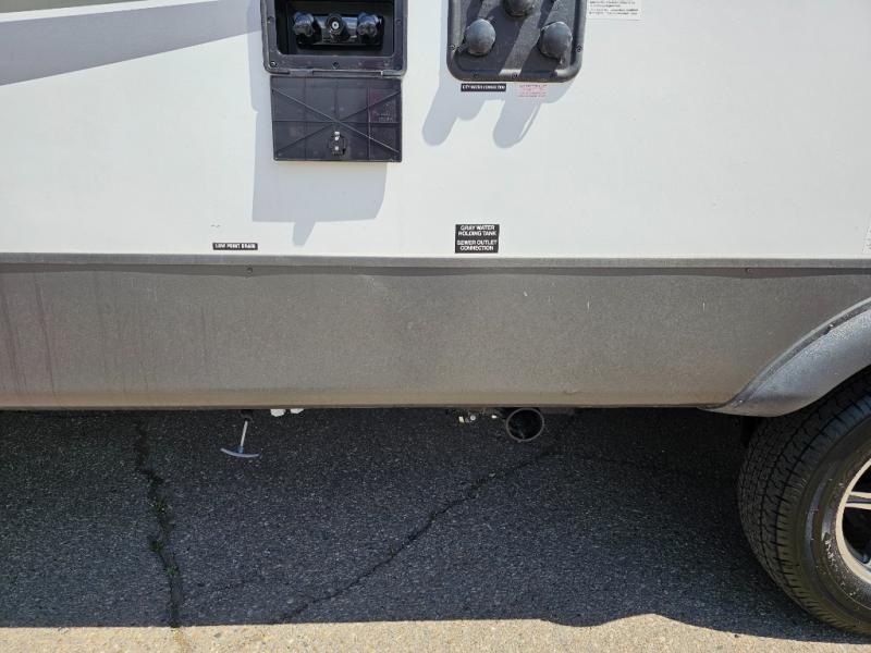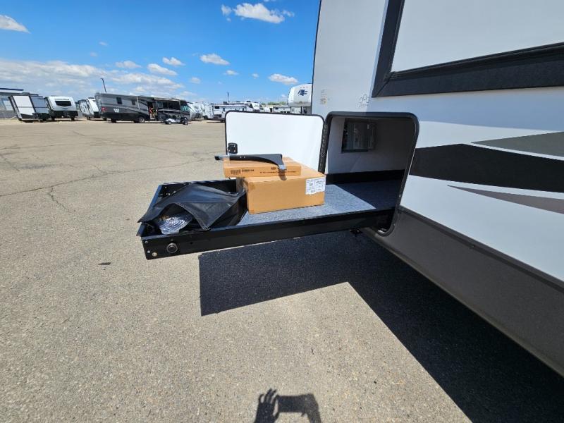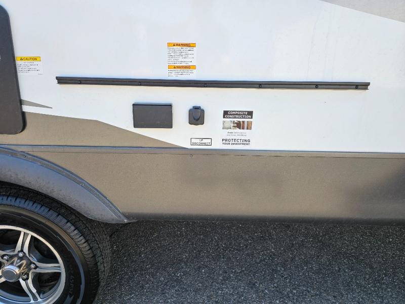 It will be so easy to enjoy time at the campground in this cozy travel trailer. The full kitchen includes a three burner gas oven, a microwave oven, and a 12V refrigerator to cook and store food, and the pantry will let you stock up on snacks. Your crew can get comfortable on the theater seat or around the rear U-shaped dinette, and there is a 12V smart entertainment TV here to make it a movie night. The walk-thru bath will let you freshen up each day, and the queen bed in the front bedroom is sure to bring comfort. You will also find one of the dual entry doors here for convenience plus a wardrobe slide out for more storage and floor space. The exterior is just as accommodating with its pass-thru storage, exterior griddle, and 21' awning!