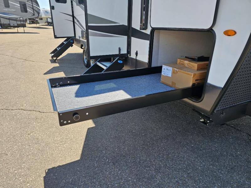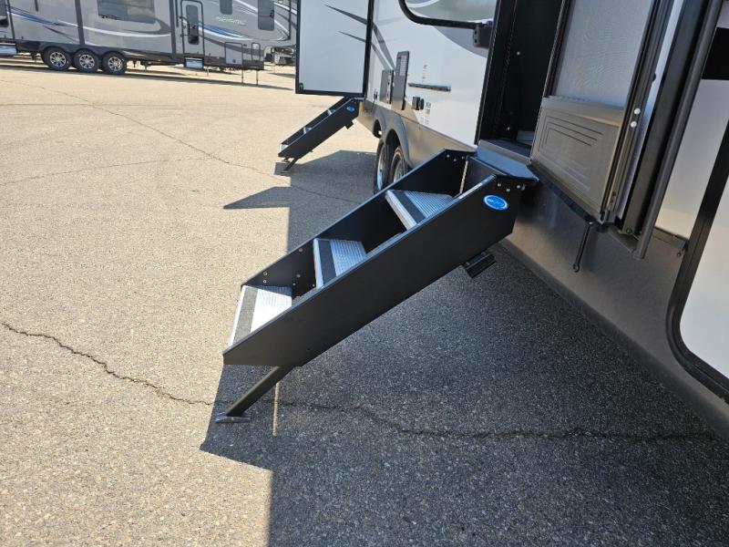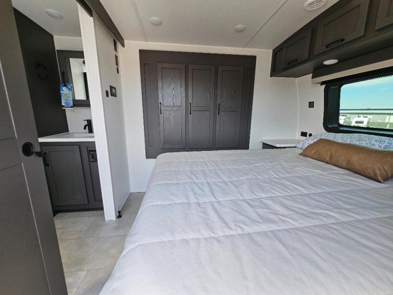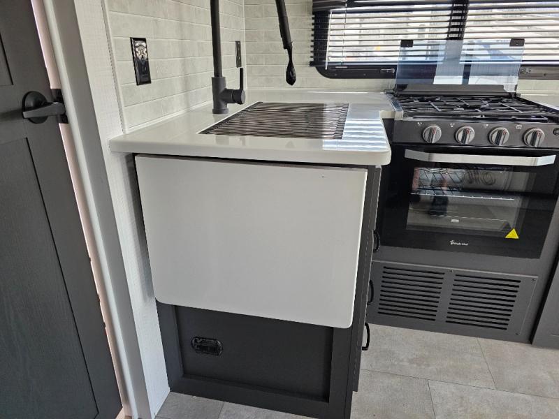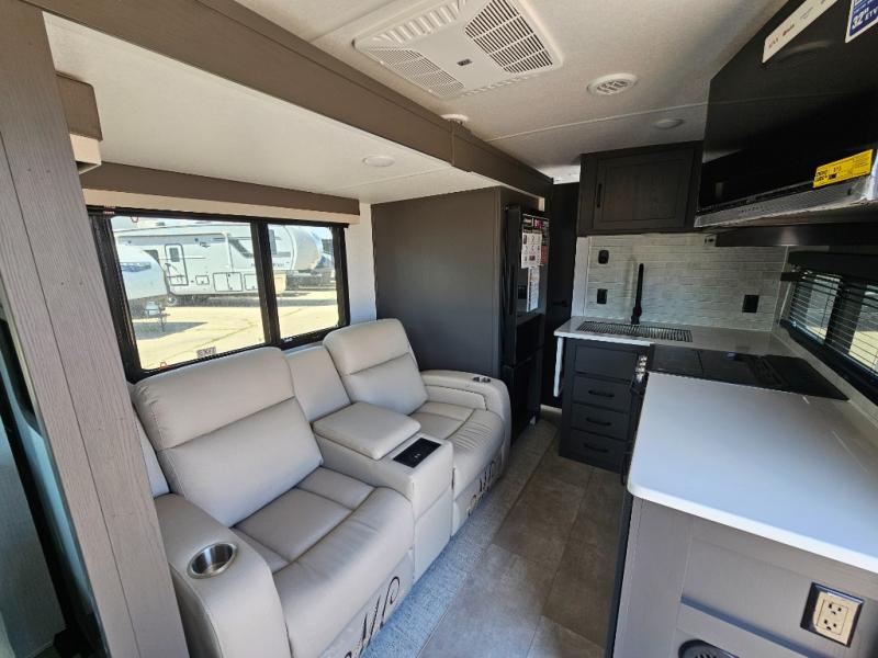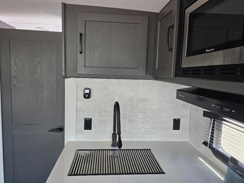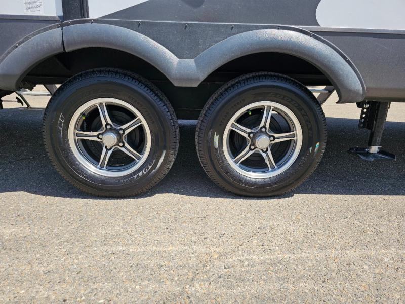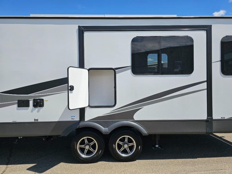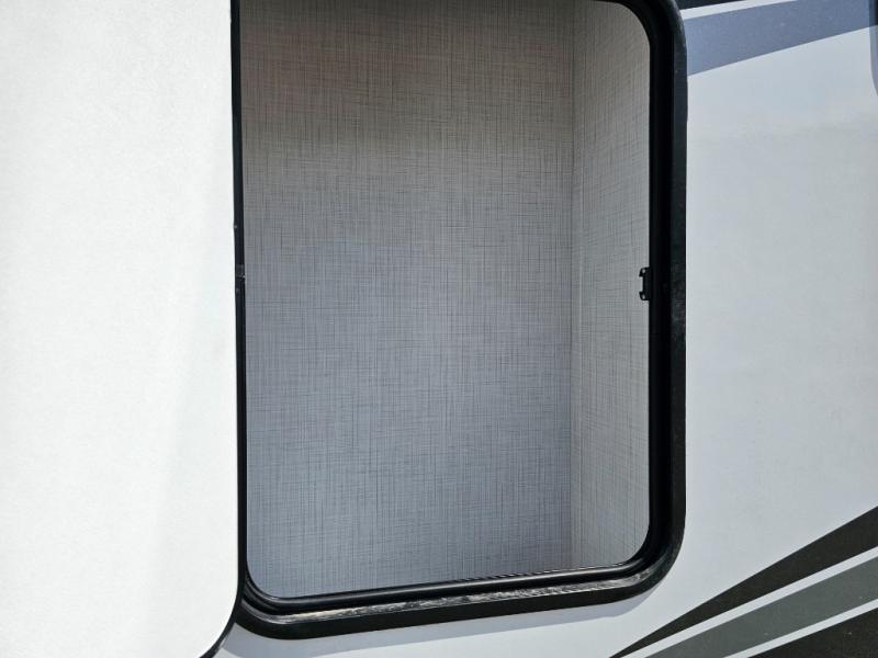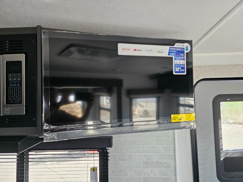 It will be so easy to enjoy time at the campground in this cozy travel trailer. The full kitchen includes a three burner gas oven, a microwave oven, and a 12V refrigerator to cook and store food, and the pantry will let you stock up on snacks. Your crew can get comfortable on the theater seat or around the rear U-shaped dinette, and there is a 12V smart entertainment TV here to make it a movie night. The walk-thru bath will let you freshen up each day, and the queen bed in the front bedroom is sure to bring comfort. You will also find one of the dual entry doors here for convenience plus a wardrobe slide out for more storage and floor space. The exterior is just as accommodating with its pass-thru storage, exterior griddle, and 21' awning!