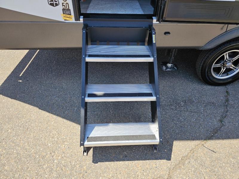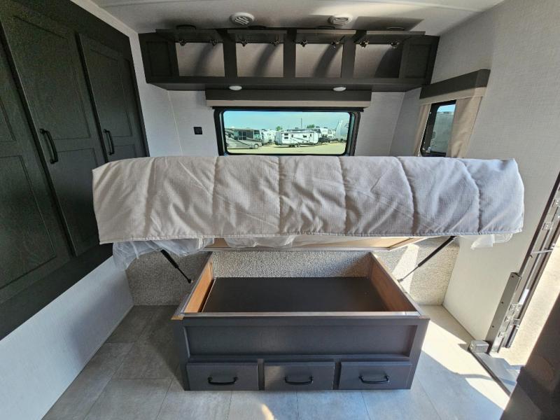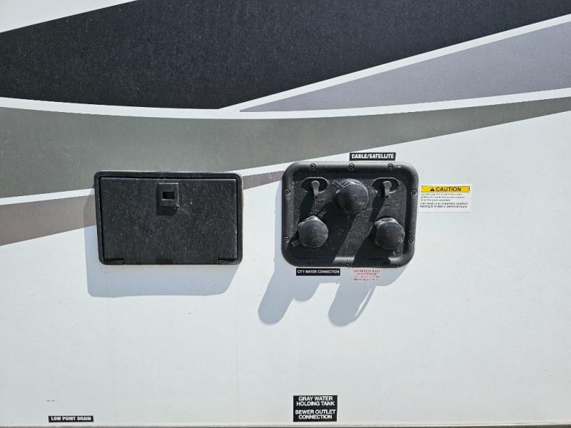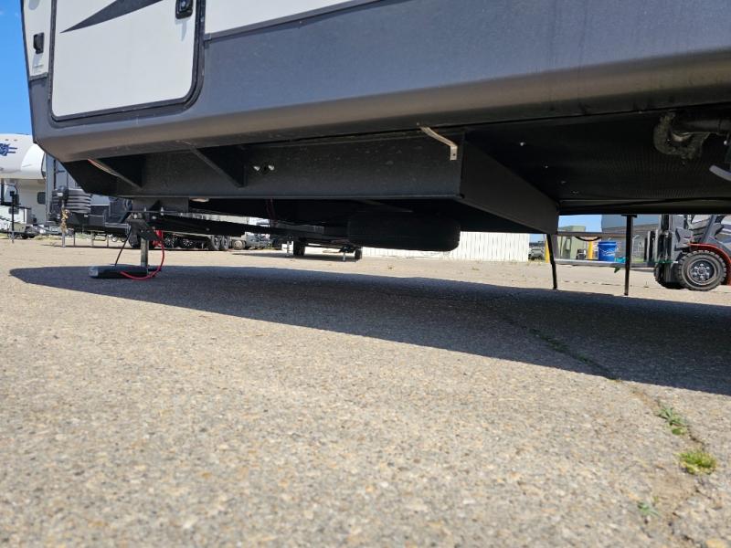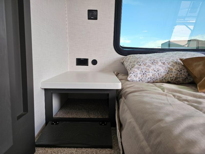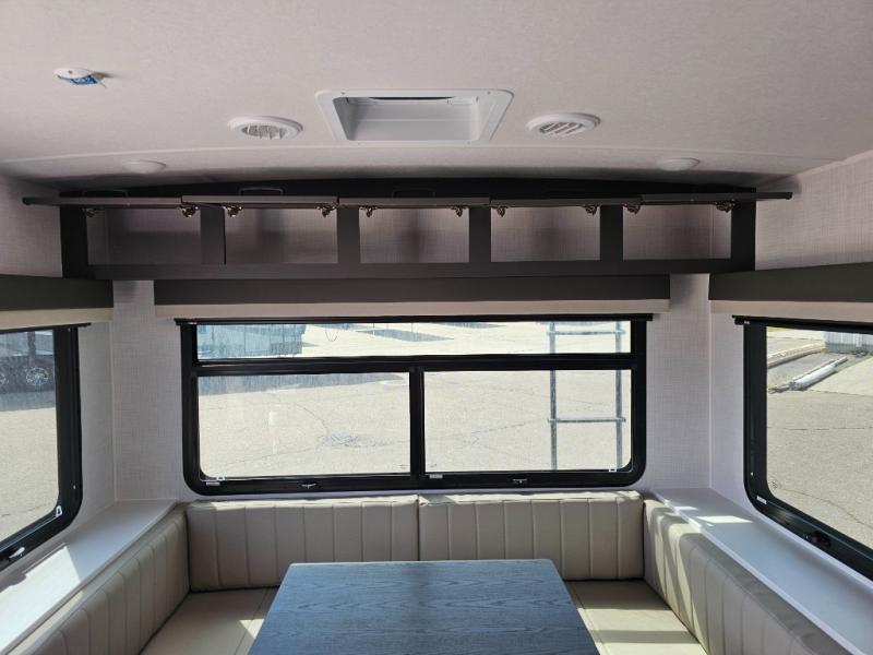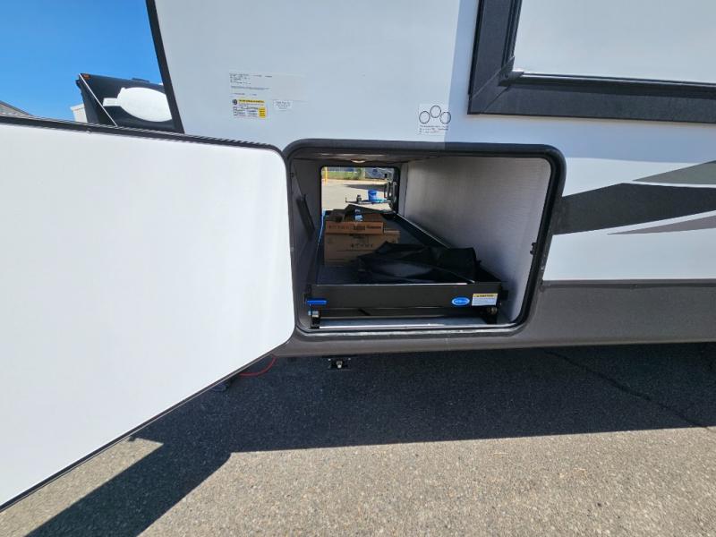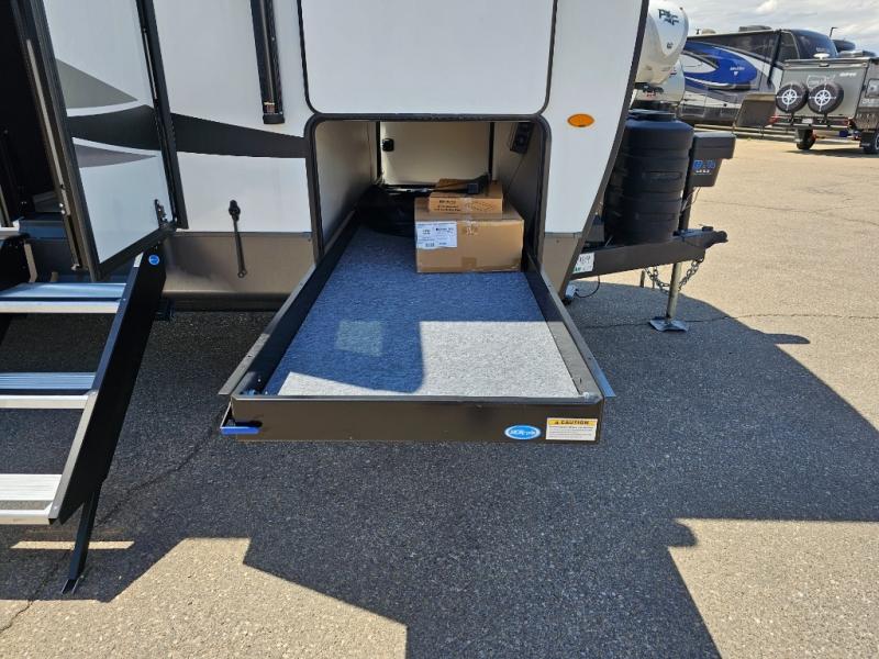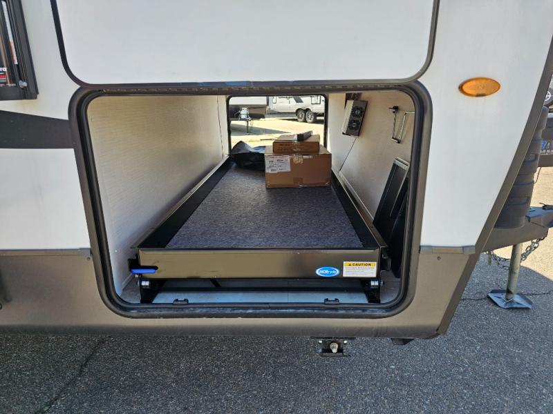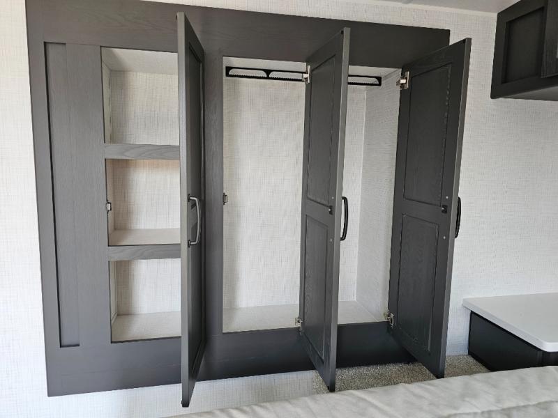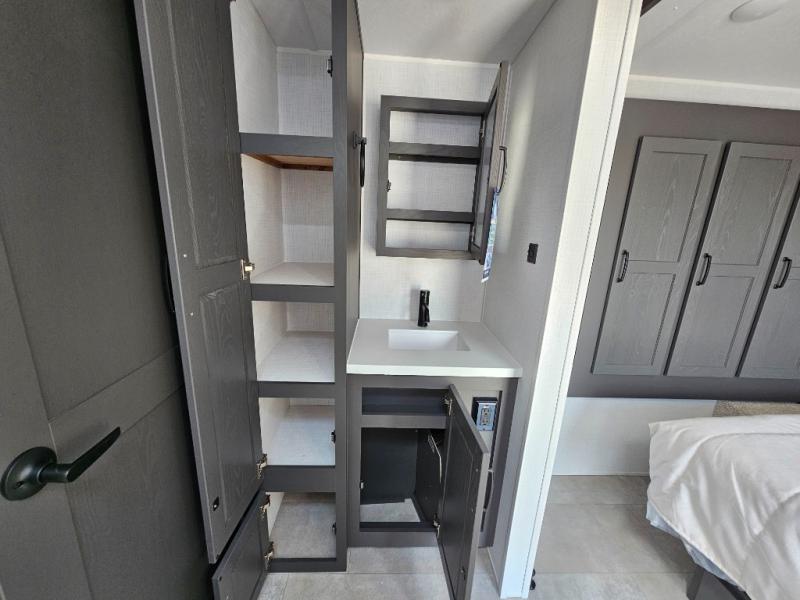 It will be so easy to enjoy time at the campground in this cozy travel trailer. The full kitchen includes a three burner gas oven, a microwave oven, and a 12V refrigerator to cook and store food, and the pantry will let you stock up on snacks. Your crew can get comfortable on the theater seat or around the rear U-shaped dinette, and there is a 12V smart entertainment TV here to make it a movie night. The walk-thru bath will let you freshen up each day, and the queen bed in the front bedroom is sure to bring comfort. You will also find one of the dual entry doors here for convenience plus a wardrobe slide out for more storage and floor space. The exterior is just as accommodating with its pass-thru storage, exterior griddle, and 21' awning!