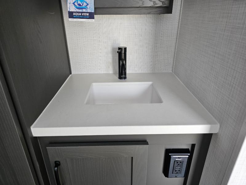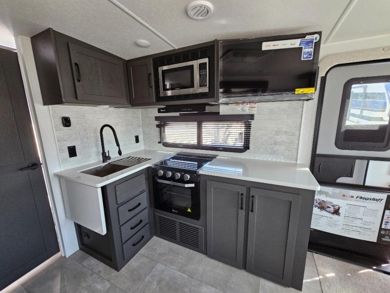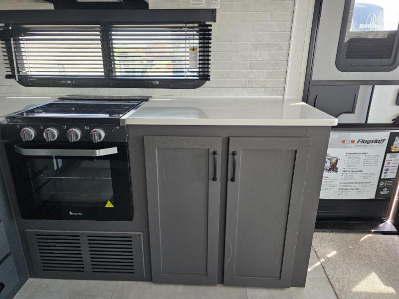 With any Flagstaff Super Lite travel trailer by Forest River the towing features include the TST tire pressure monitor system with a monitor providing safety on the road, Easy Lube axles and Nev-R adjust brakes, a power tongue jack for easy setup, and rear observation camera prep. Each is built with 6 sided aluminum framed side walls, end wall, front, floor and a roof, a plywood tongue and groove subfloor, electronically controlled heated holding tanks and an enclosed underbelly allowing you to travel during any season. The interior includes designer kitchen backsplash, solid surface kitchen countertops, Sedonwood cabinetry, and solid wood cabinet doors and drawers to make you feel right at home.