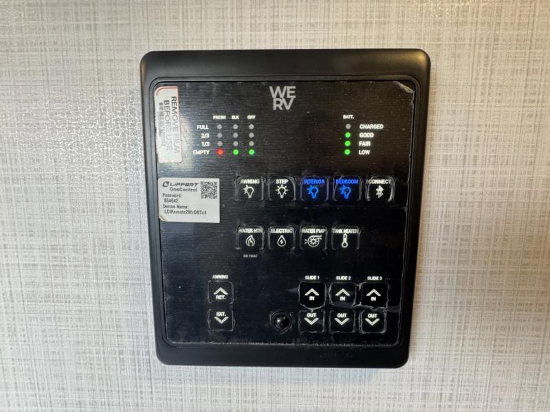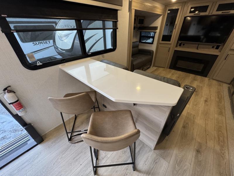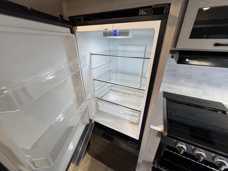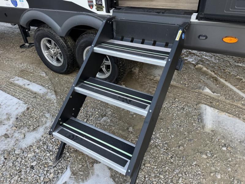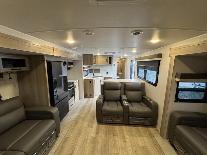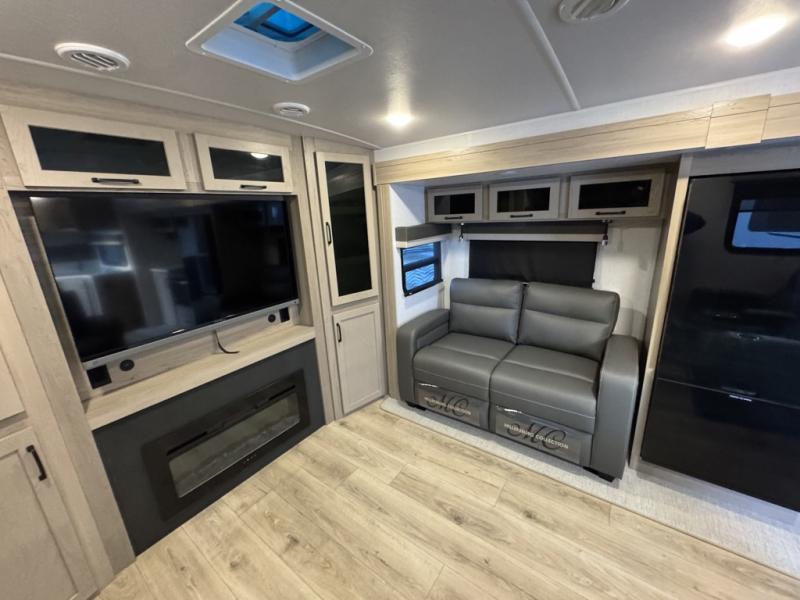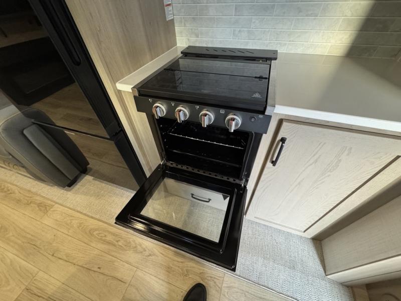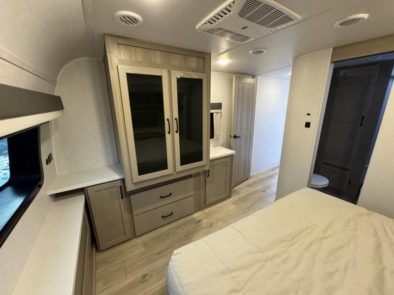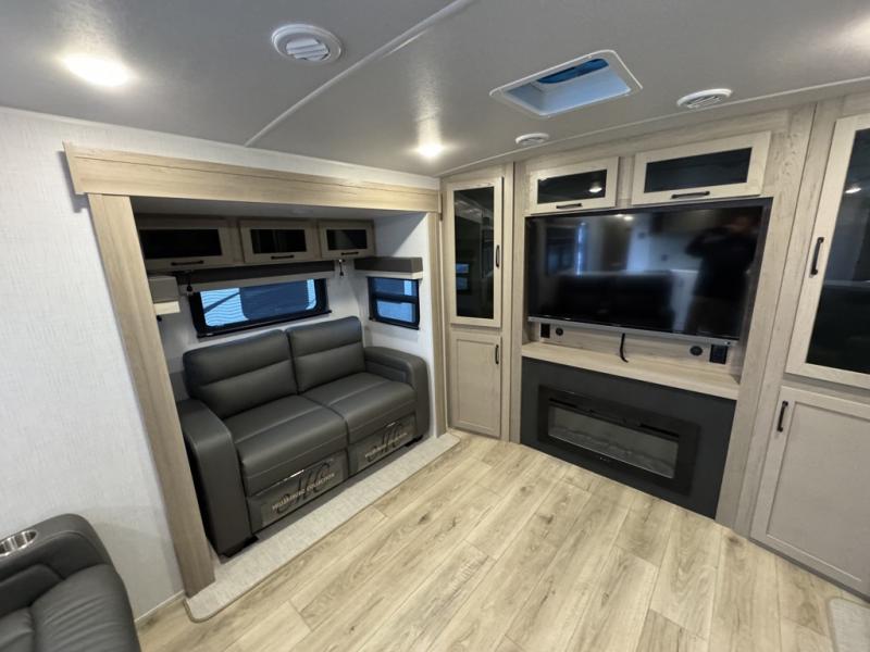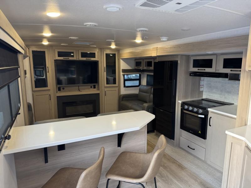 Weekends at the lake are made easy in this spacious travel trailer that can sleep six each night. Once you arrive at the campsite, unload your things from the exterior storage, set up the 21' awning, then head out on a trail to stretch your legs. You can freshen up in the dual entry bath when you return before preparing lunch for everyone. A three burner range comes standard, along with a 21" gas oven and microwave oven, and there is a table with bar stools that overlooks the rear living area for those who want to relax. Your guests can convert the rear living area into their bedroom at night since there are dual hide-a-bed sofas, and the rear entertainment center includes a Smart TV so they can watch a movie in bed. And check out the front master bedroom with its queen bed slide out, wardrobe, front shelf, and optional TV!