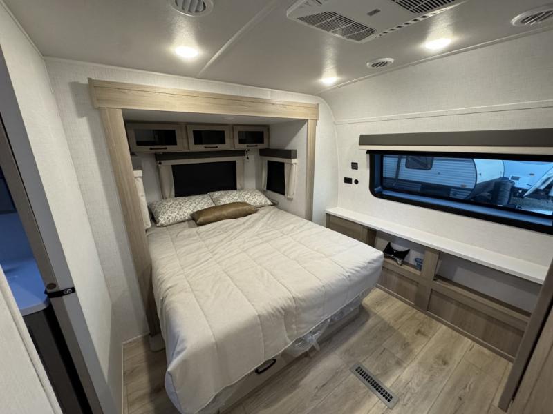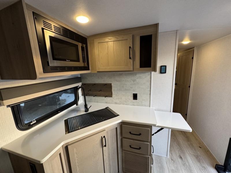 With any Flagstaff Super Lite travel trailer by Forest River the towing features include the TST tire pressure monitor system with a monitor providing safety on the road, Easy Lube axles and Nev-R adjust brakes, a power tongue jack for easy setup, and rear observation camera prep. Each is built with 6 sided aluminum framed side walls, end wall, front, floor and a roof, a plywood tongue and groove subfloor, electronically controlled heated holding tanks and an enclosed underbelly allowing you to travel during any season. The interior includes designer kitchen backsplash, solid surface kitchen countertops, Sedonwood cabinetry, and solid wood cabinet doors and drawers to make you feel right at home.