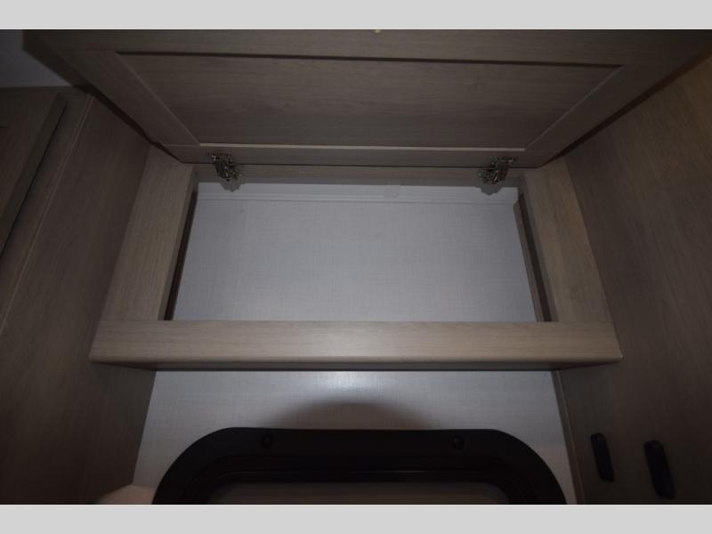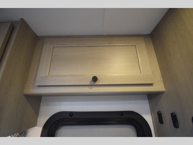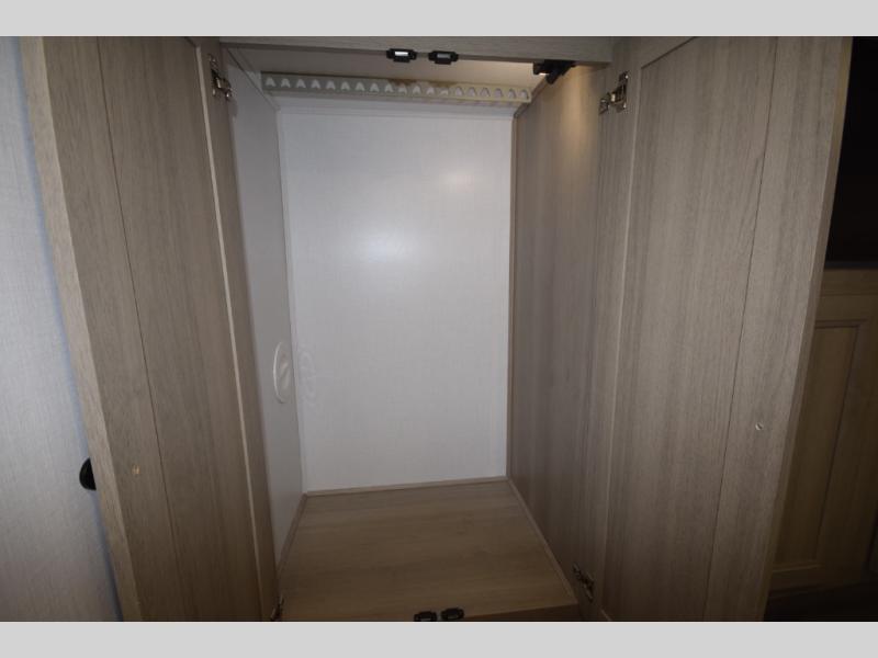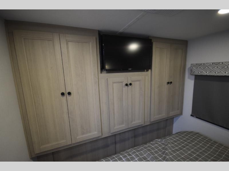 Stretch out on a cozy queen bed with dual wardrobes, overhead storage, and a 12V TV for nighttime entertainment. -