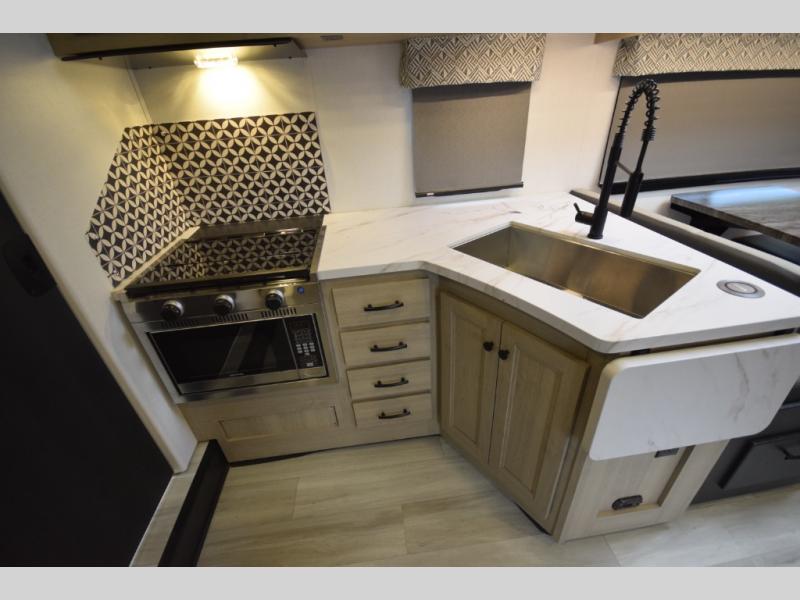 Sleep up to six with a full 60" x 80" bunk that’s perfect for guests or kids—or upgrade to the optional Trekker cap with built-in entertainment center for extra flair. -