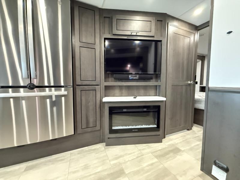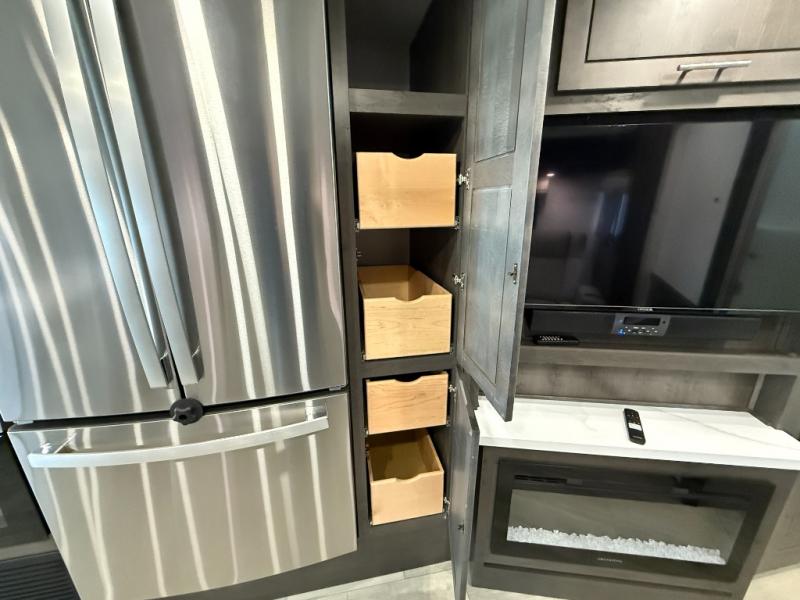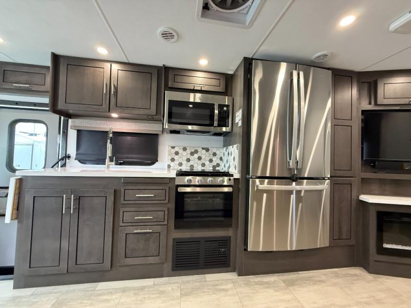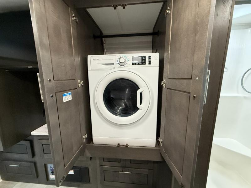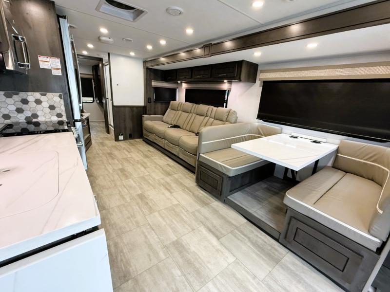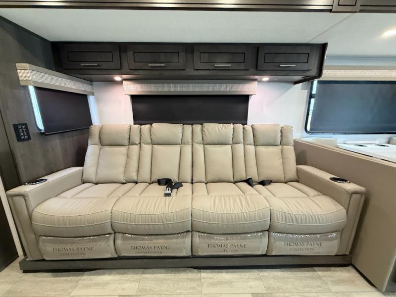 You will love the spacious living entertainment in this motorhome! There is a Thomas Payne 4-person theater seating that reclines with adjustable headrests, heat, massage and has pop-up 110V outlets. There is also a 5,000 BTU fireplace with a 40" LED TV to watch your favorite movies in true comfort. The kitchen has everything you need to prepare your best home cooked meals including a brush nickel designer faucet with a pull out spray wand for easy clean up, and you can enjoy all of your meals at the Dream Dinette. You will appreciate having your own private retreat with the rear bedroom which has a 72" x 80" king bed slide across from a dresser with a 32" LED TV, a wardrobe on one side, and another wardrobe on the other with an optional combo washer and dryer. There is also a power front overhead bunk for more sleeping space!