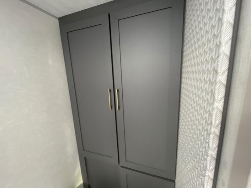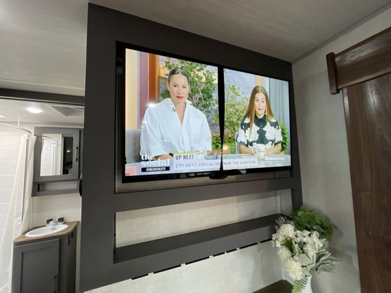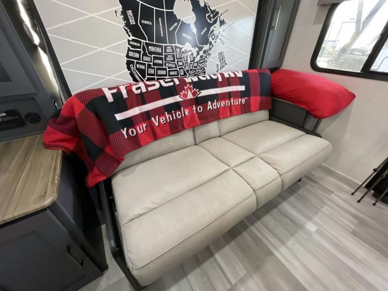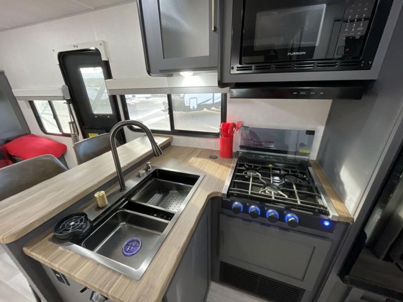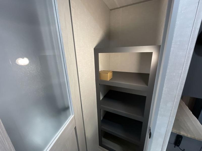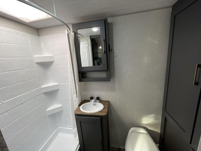 This Forest River IBEX travel trailer has a clever use of space that gives you a lot of options. The kitchen features an L-shaped countertop with bar stool seats, or you can eat at the booth dinette that is tucked into its own slide out so there's plenty of floor space. The sofa is across from the entertainment center and fireplace so you can relax in the evenings. When it's time for bed, there's a 60" x 80" Murphy bed which will be super comfortable for a good night's sleep! The rear bath has a roomy shower plus a wardrobe and linen closet to store all your things.