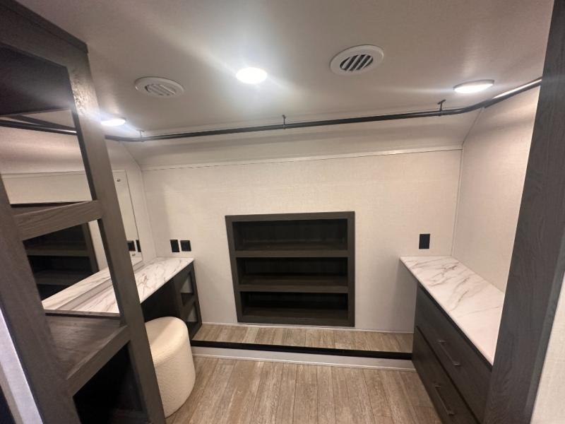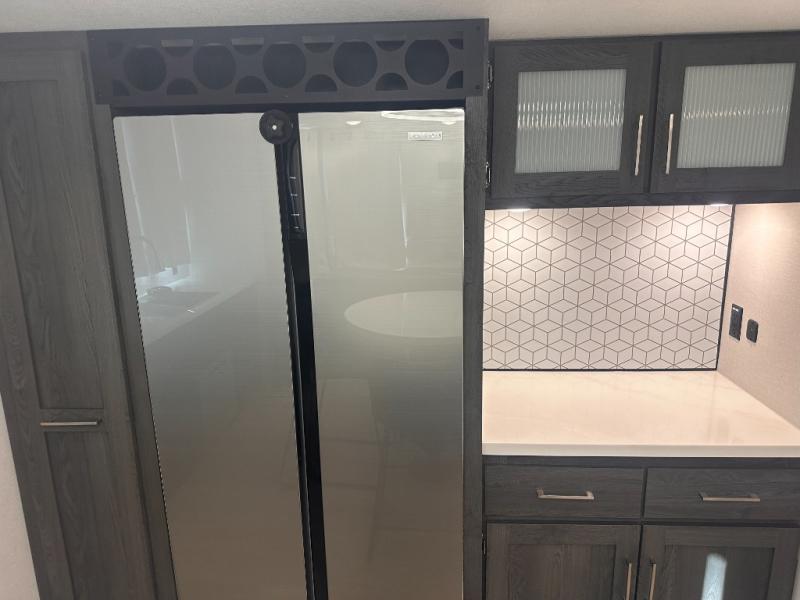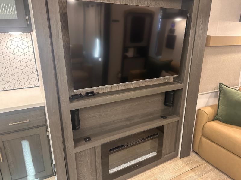 It's easy to see why this fifth wheel was voted Best New Model for 2025 by RV Pro! There are many residential features, such as a middle table with four seats, dual recliners, a desk to get some work done, and a master bedroom you are sure to love. You'll find a king bed with Versa Tilt technology, a dresser, and TV prep. A front master bath includes a walk-in shower with a skylight, dual bath sinks with a back-lit mirror, and a closet with shelves. The middle mud room includes washer/dryer prep, counter space and a pull-out drying rack to hang up swim clothes, towels, and more. Everyone will enjoy spending time in the main living room that includes dual opposing slides, a tri-fold sofa, and an entertainment center with hidden storage behind. And the chef of your group will love the rear kitchen with its 16 cu. ft. 12V refrigerator and pantry, an oven, and plenty of counter space. Head outdoors to enjoy the two power awnings in the evening!