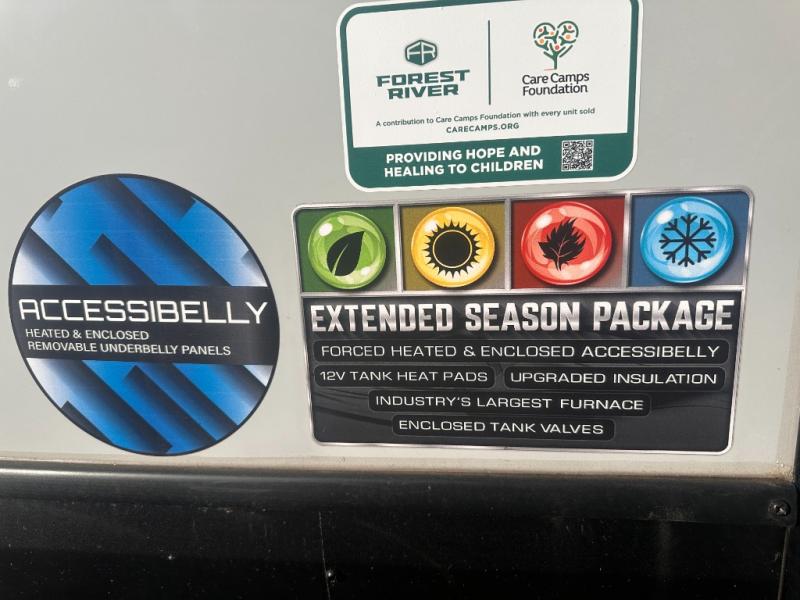 With any Impression mid-profile fifth wheel by Forest River, the focus of the design is comfort and value, built with quality craftsmanship and attention to customer's desires in each Impression! The exterior includes upgraded E-rated MAXXIS tires, custom exterior graphics package, and insulated slam latch baggage doors. There is also an enclosed docking station, an outside shower, and a 100W roof solar panel for off-grid capabilities. The fully heated and enclosed AccessiBelly has removable underbelly panels and offers four seasons of travel, and there is an industry leading 15K A/C plus 35K BTU furnace to keep you comfortable. The interior has lumbercore cabinetry, residential linoleum, residential backsplash in the kitchen, and oversized opening windows in the living area for more natural lighting and good air flow.