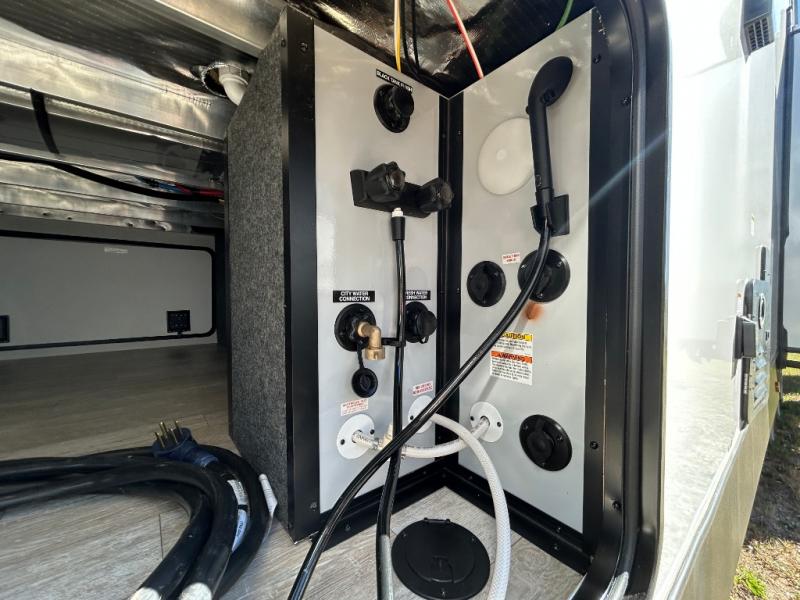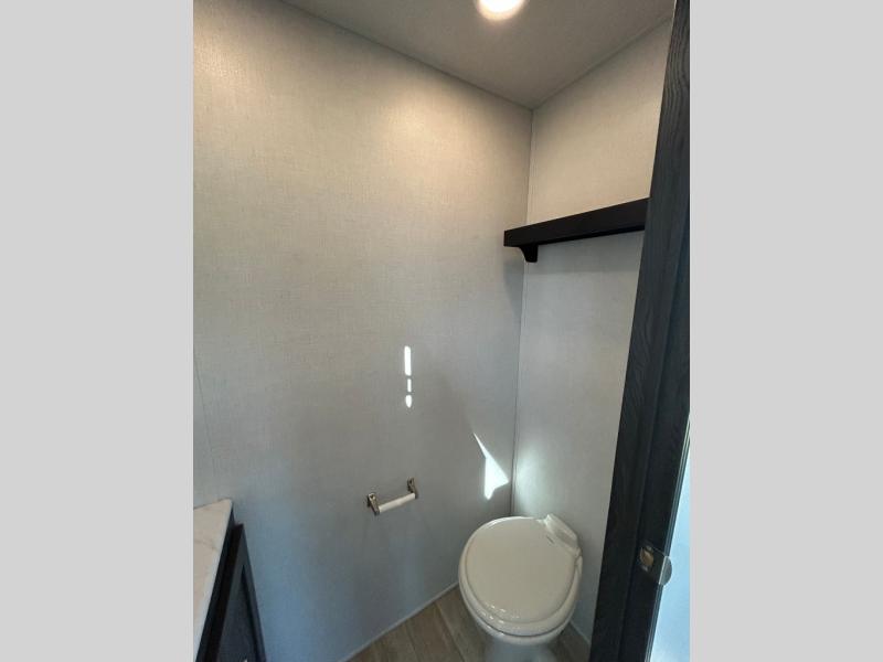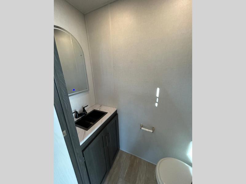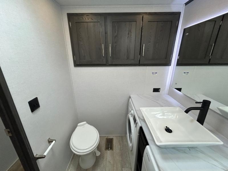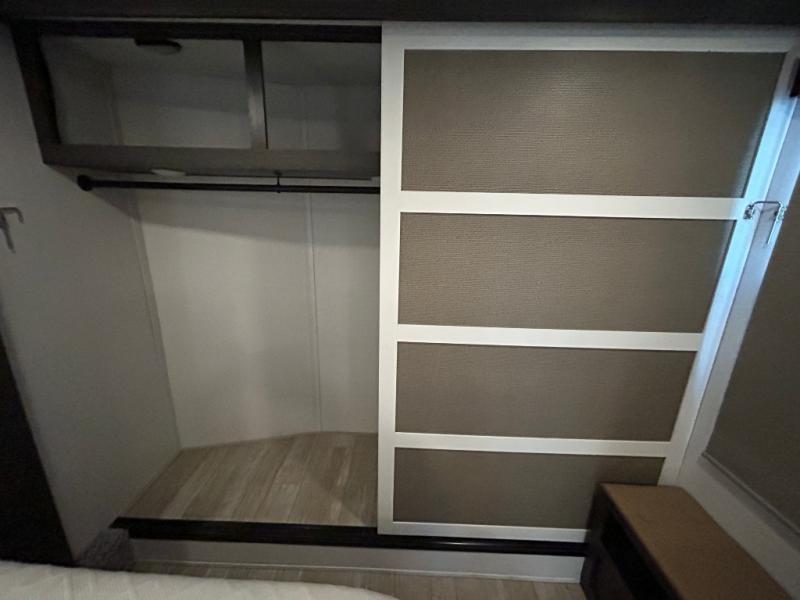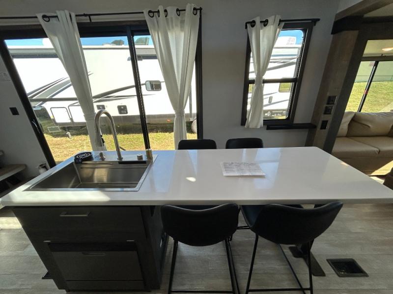 With any Impression mid-profile fifth wheel by Forest River, the focus of the design is comfort and value, built with quality craftsmanship and attention to customer's desires in each Impression! The exterior includes upgraded E-rated MAXXIS tires, custom exterior graphics package, and insulated slam latch baggage doors. There is also an enclosed docking station, an outside shower, and a 100W roof solar panel for off-grid capabilities. The fully heated and enclosed AccessiBelly has removable underbelly panels and offers four seasons of travel, and there is an industry leading 15K A/C plus 35K BTU furnace to keep you comfortable. The interior has lumbercore cabinetry, residential linoleum, residential backsplash in the kitchen, and oversized opening windows in the living area for more natural lighting and good air flow.