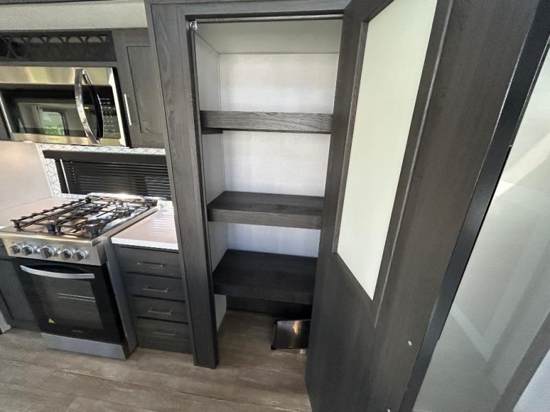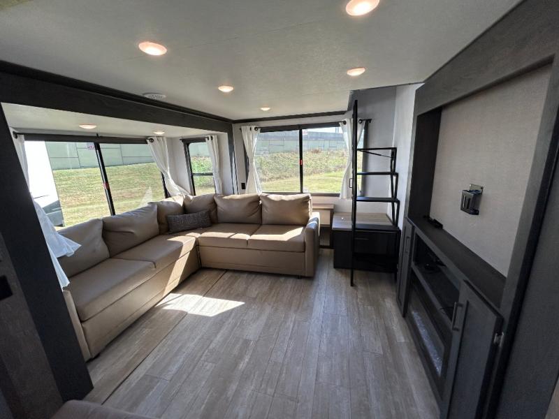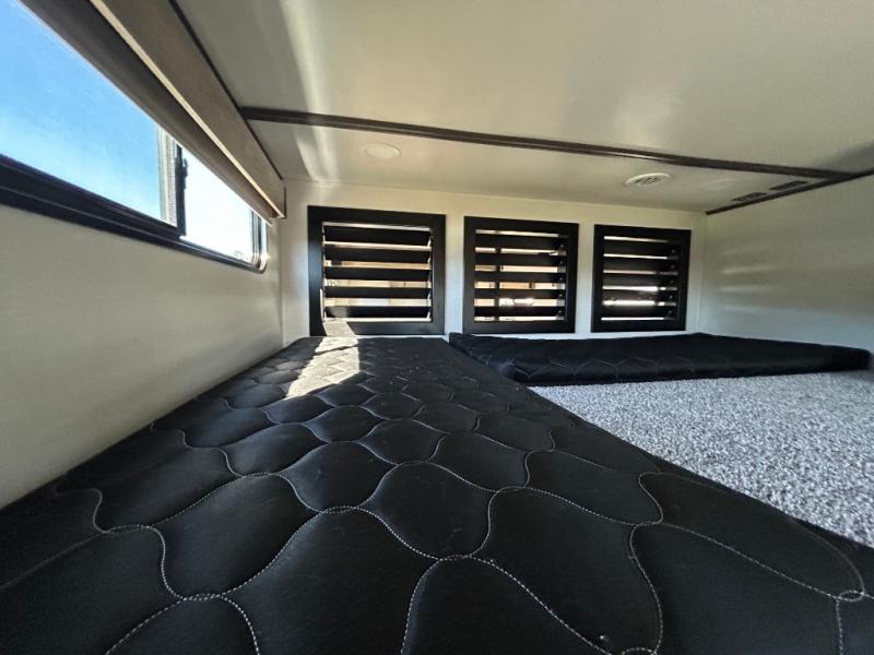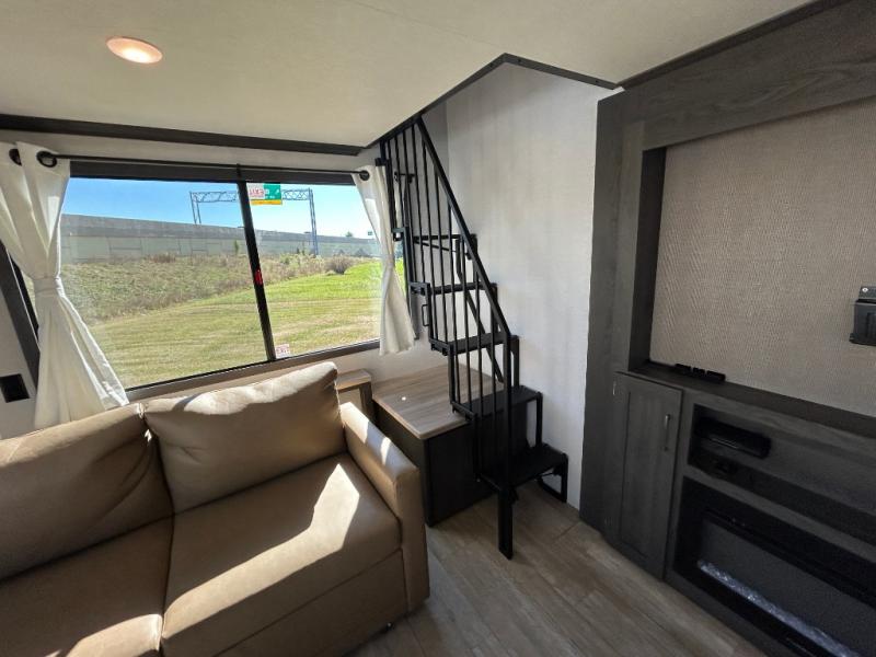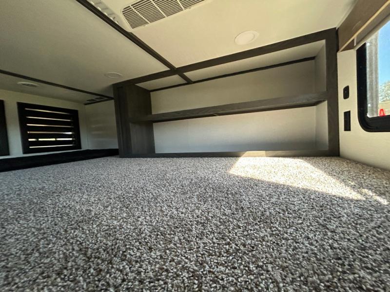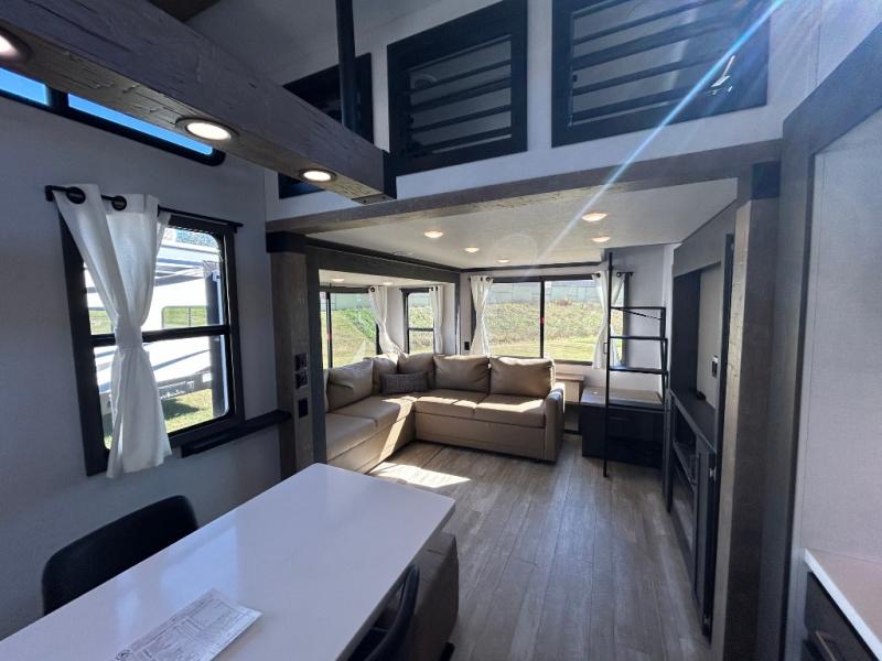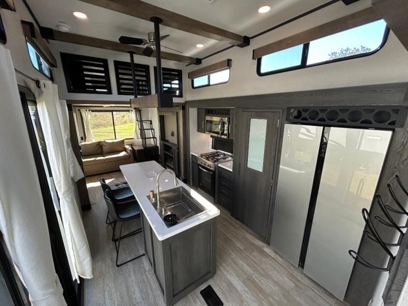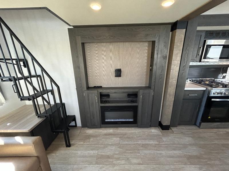 Plan to stay awhile in this four slide out fifth wheel! There is a triple-slide patio door that opens into the kitchen, complete with a kitchen island, walk-in pantry and 16 cu. ft. 12V refrigerator, and a convenient half bath with storage. There are reclining theater seats with a chaise lounge across from an entertainment center and fireplace with hidden storage behind. The fold-up steps lead up to the loft that includes two bunk mats, a wardrobe, cubby storage, plus two windows, which will make this space bright and open. The full bath towards the front includes washer/dryer prep, a walk-in shower with a skylight, and a linen closet to keep towels close by. And you'll love having your own bedroom up front with a king bed with Versa Tilt, a dresser with a bench, and a front wardrobe to keep your clothes wrinkle-free!