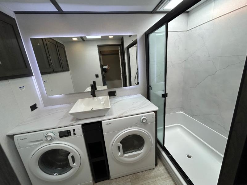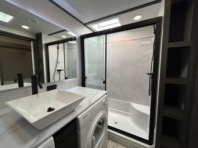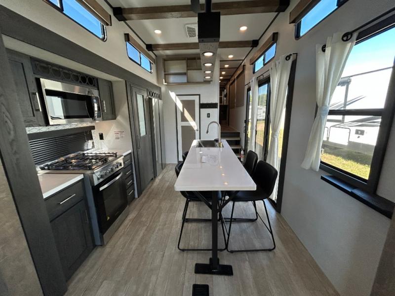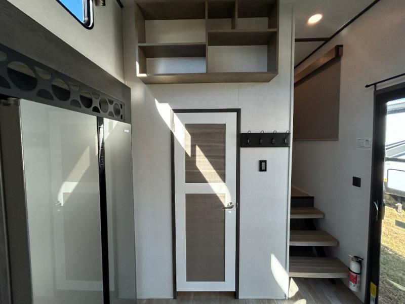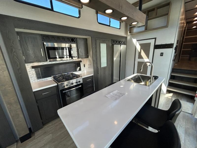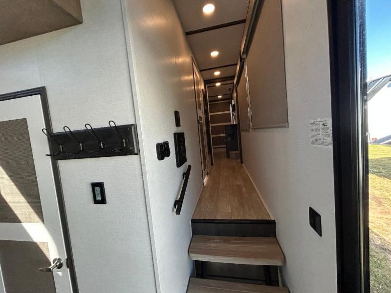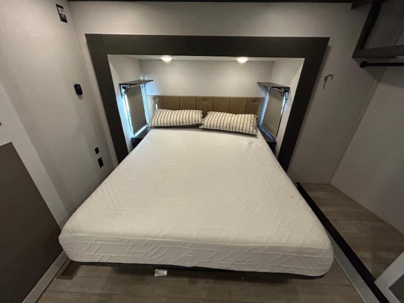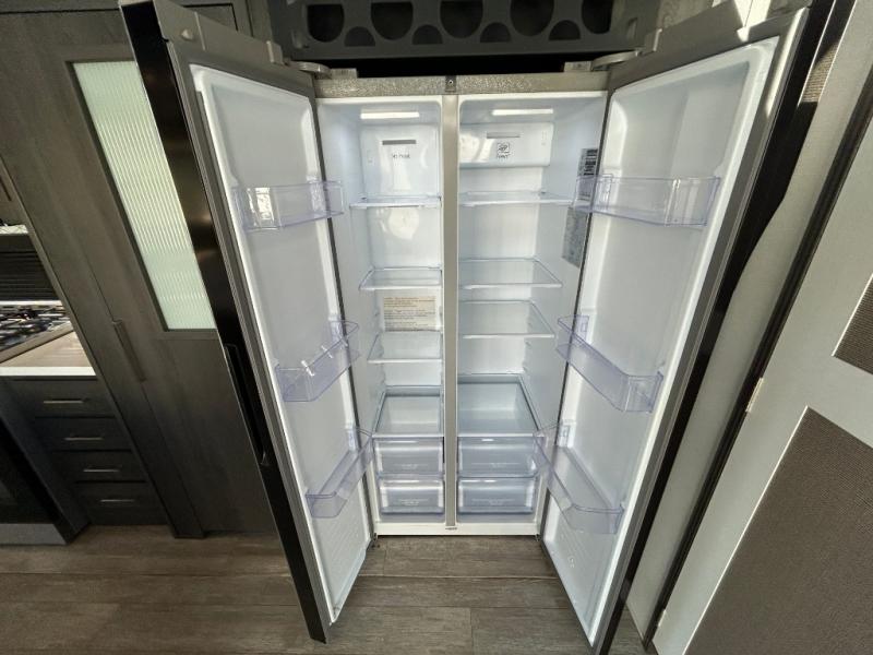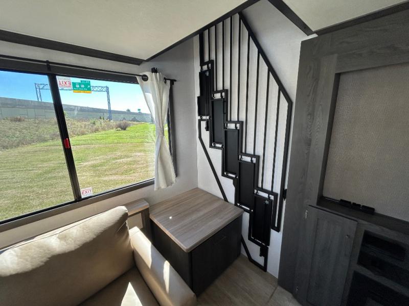 Plan to stay awhile in this four slide out fifth wheel! There is a triple-slide patio door that opens into the kitchen, complete with a kitchen island, walk-in pantry and 16 cu. ft. 12V refrigerator, and a convenient half bath with storage. There are reclining theater seats with a chaise lounge across from an entertainment center and fireplace with hidden storage behind. The fold-up steps lead up to the loft that includes two bunk mats, a wardrobe, cubby storage, plus two windows, which will make this space bright and open. The full bath towards the front includes washer/dryer prep, a walk-in shower with a skylight, and a linen closet to keep towels close by. And you'll love having your own bedroom up front with a king bed with Versa Tilt, a dresser with a bench, and a front wardrobe to keep your clothes wrinkle-free!