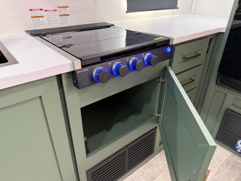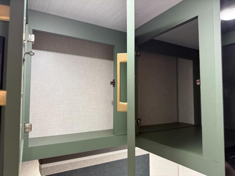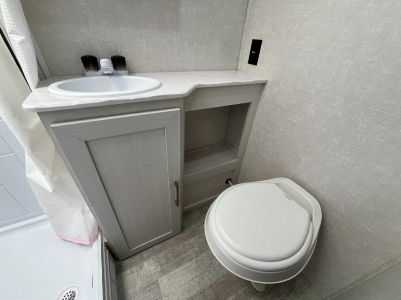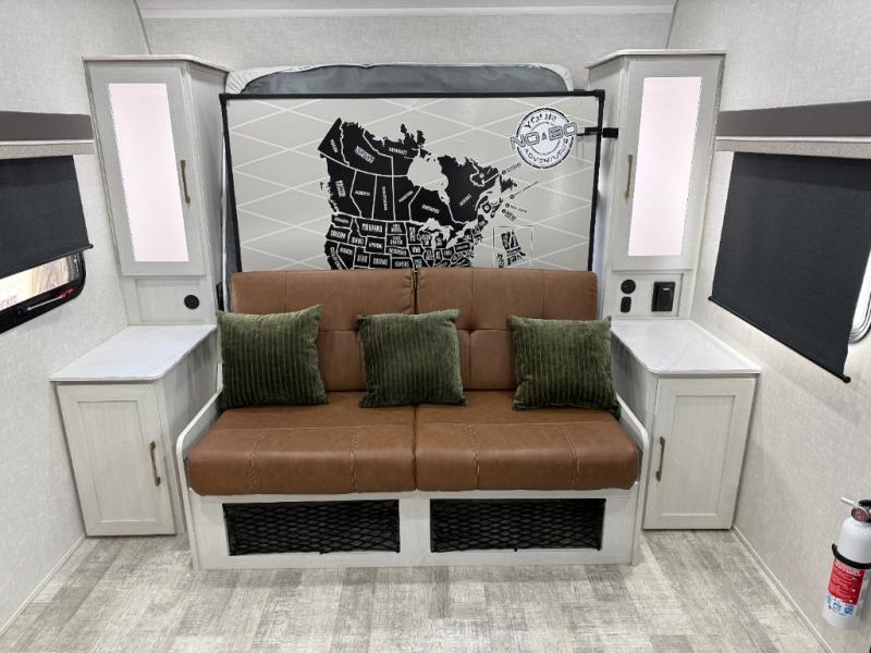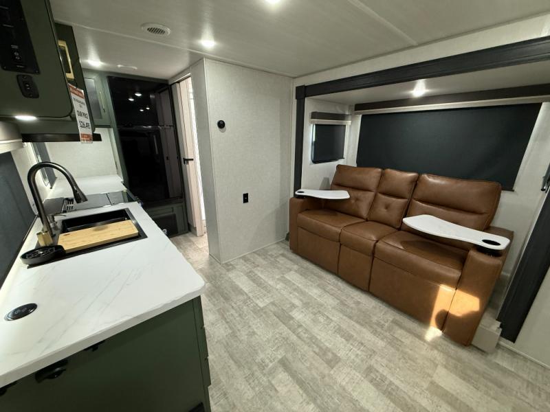 You'll love the versatility and space you'll have in this couple's trailer! The front Murphy bed provides seating and sleeping space, and the wardrobes will help keep your items organized. There is theater seating across from the TV so you can relax each evening, or you may just find yourselves outdoors under the patio awning. A full kitchen lets you cook and store meals while at the campground, and the full bath on board means you won't have to use the camp's facilities!