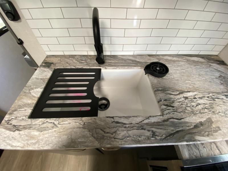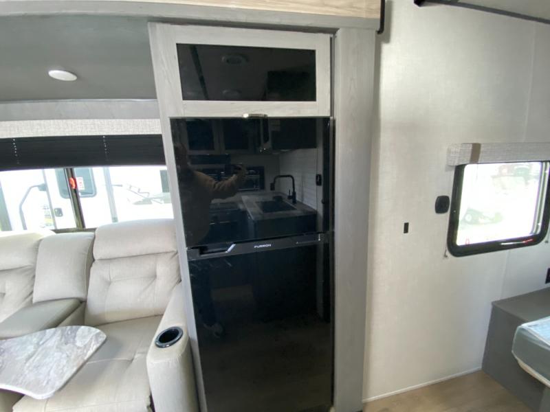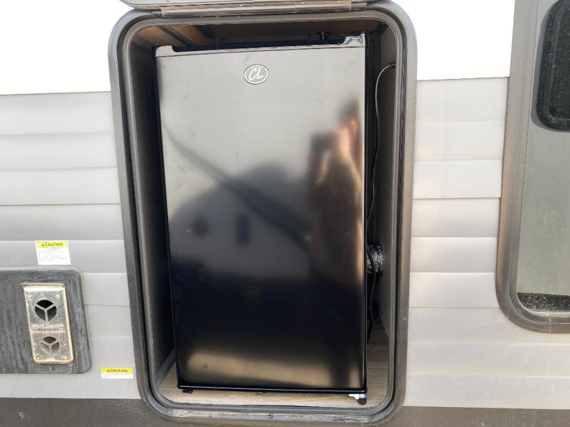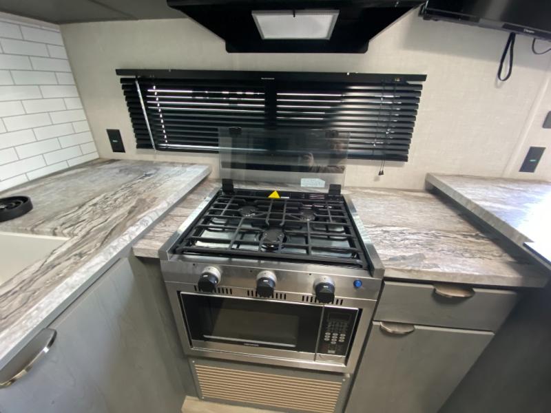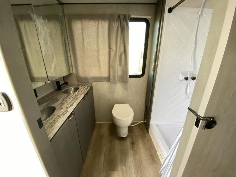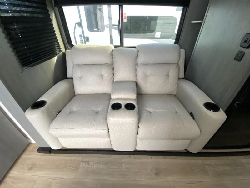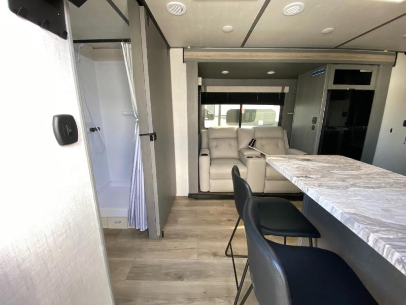 Whether you're camping in your own back yard or across the country, you'll find comfort in this spacious travel trailer. The full rear bath is not only spacious, but it's tucked away in the back for privacy. Your crew can get comfortable on the theater seating or head outdoors to relax under the 18' power awning. There is also a bar top with stools and a fully-equipped kitchen to make meals each day, or you can head outdoors to utilize the outdoor Quick Connect and 2X size camp refrigerator! When you're ready to call it a night, head to the front private bedroom for a great night's rest on the king bed that includes wardrobes on either side for your clothes.