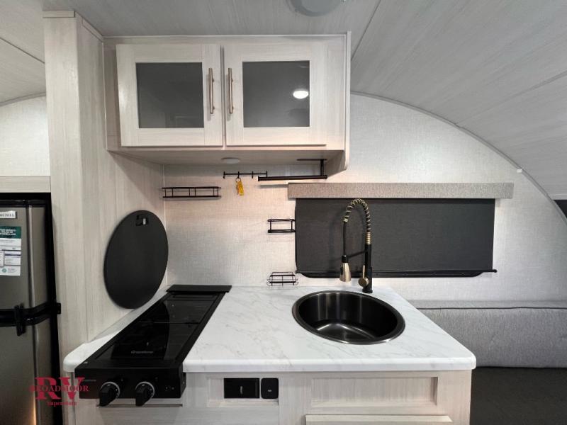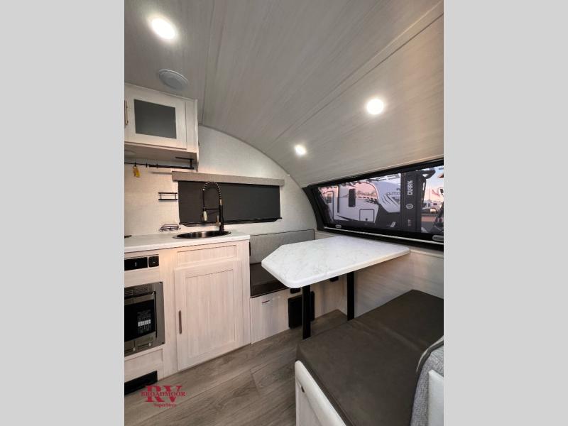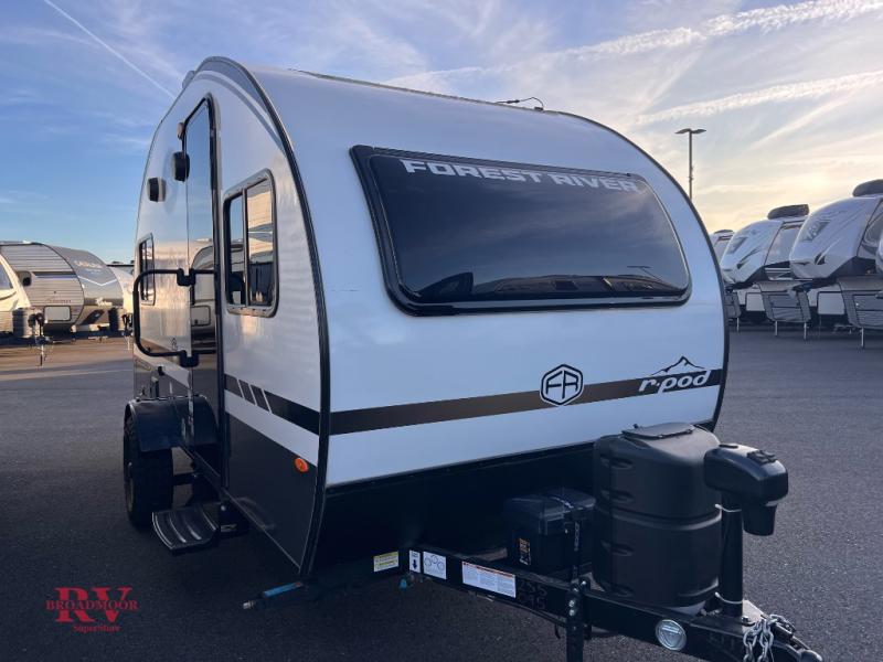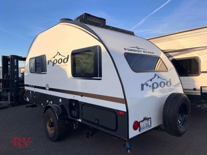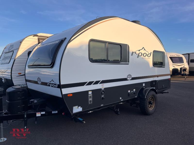 With any R-Pod travel trailer by Forest River, you will enjoy affordable luxury at the lowest tow weight in its class! There is a sealed underbelly with forced heat, a curved dual-pane acrylic front window with a bug screen and night shade, plus a large roof mounted solar panel for off-grid capabilities. The 15K A/C unit will keep you comfortable during the summer camping months, and the tankless water heater will provide endless hot showers after hiking, biking, swimming and more! Each model also includes a black glass friction hinge entrance door, roof ladder prep, exterior motion lighting, plus a hot and cold exterior spray port to wash off sand from the beach. Inside, you'll enjoy seamless Surf-X kitchen countertops, blackout roller shades, and a central vacuum system for hassle-free cleaning!
