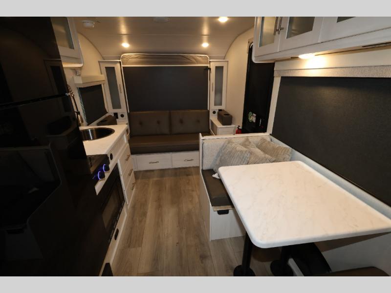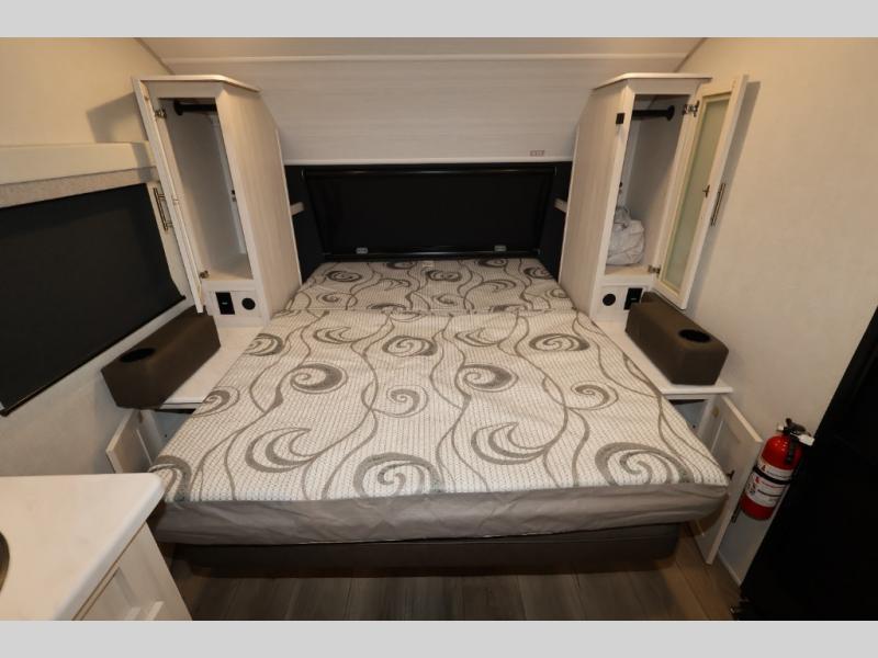 You're going to love all of the conveniences and versatility of this travel trailer! The front Murphy bed can fold away to reveal a sofa which gives you a comfortable place to sit during the day and to sleep at night too. The rear full bath features everything you will need to get squeaky clean each morning, as well as a large wardrobe for you to store your linens. After you have whipped up your best meal with the two-burner cooktop or convection microwave, you can head to the booth dinette and enjoy eating it there comfortably.