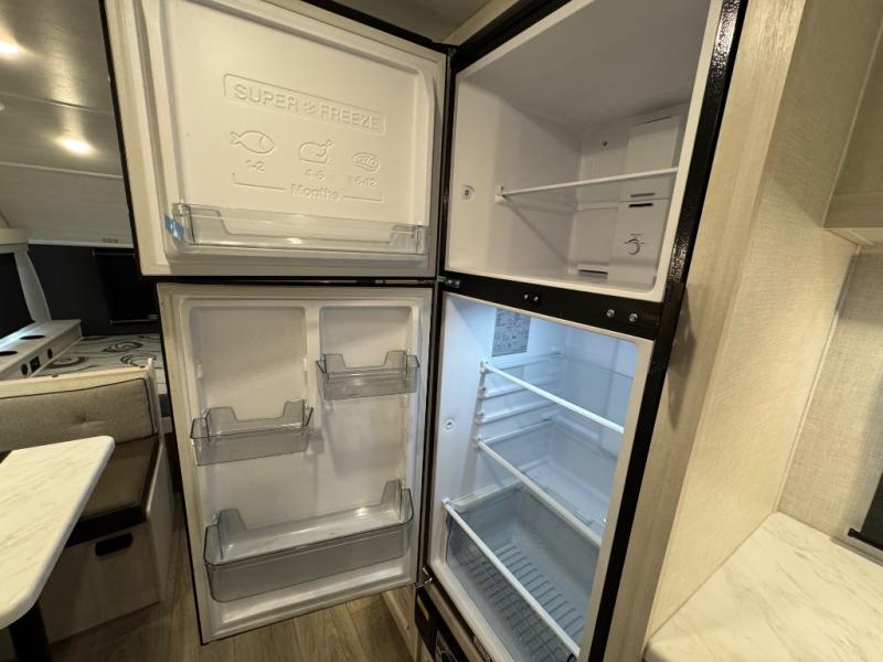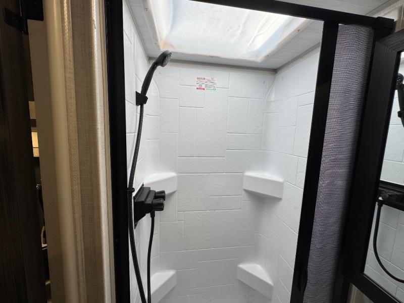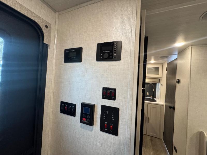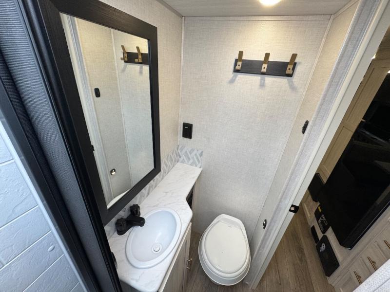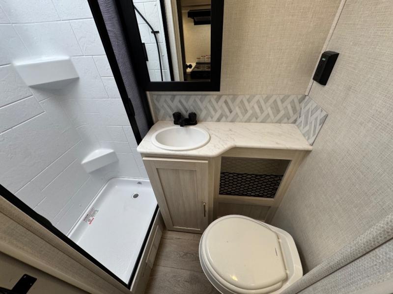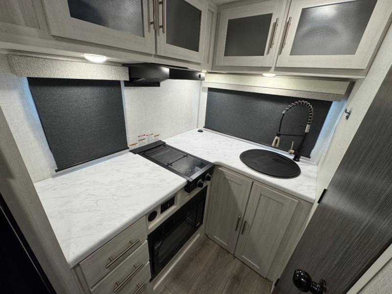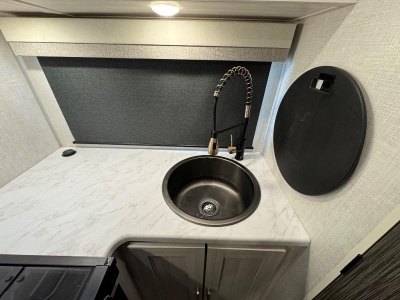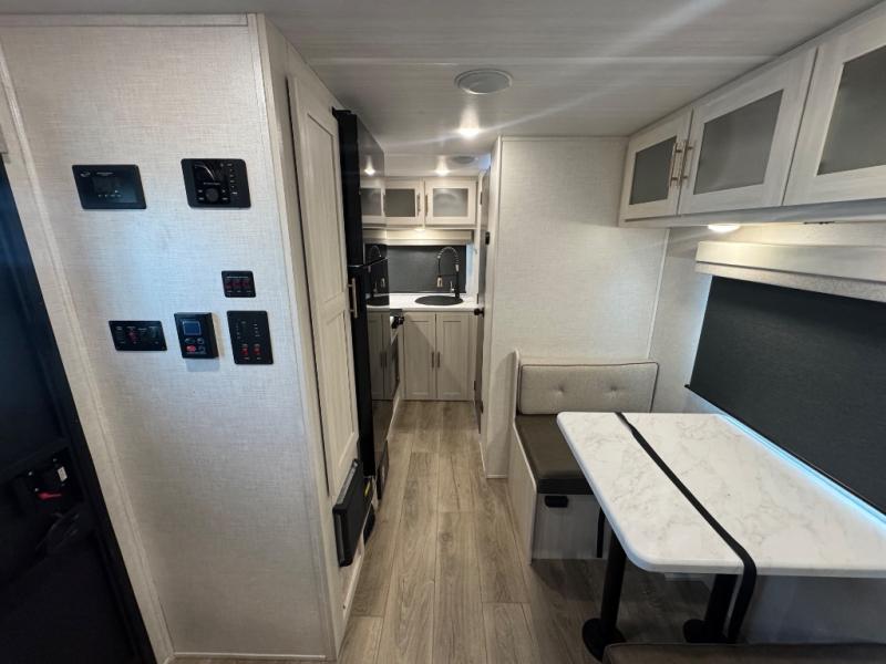 This travel trailer is the perfect couple's trailer with sleeping space for an overnight guest on the booth dinette. You will enjoy the front queen bed for a great night's rest, and there is a full bath on board to clean up each day. A two burner cooktop in the kitchen will let you cook meals inside instead of over a fire outside, and there is ample counter space to set out the meal. After dinner is cleaned up, head outdoors to relax under the 11' power awning!