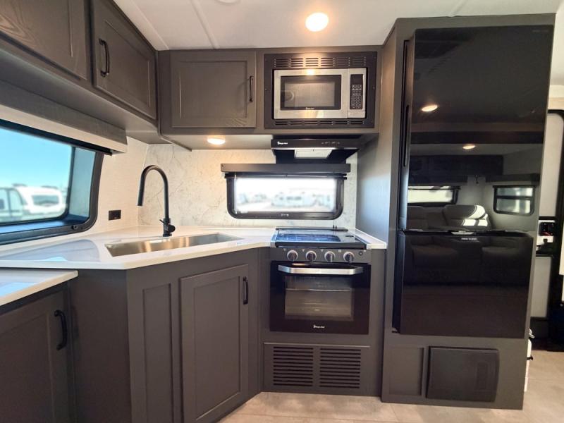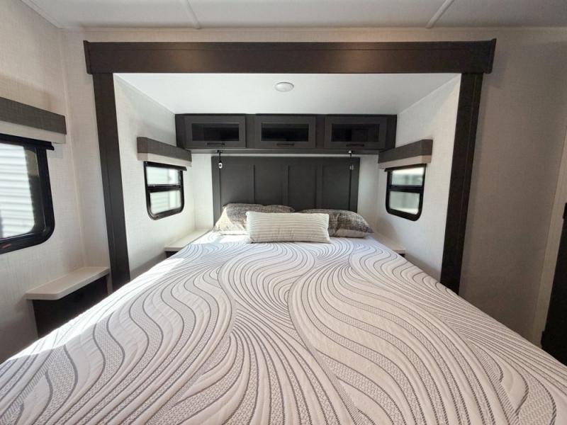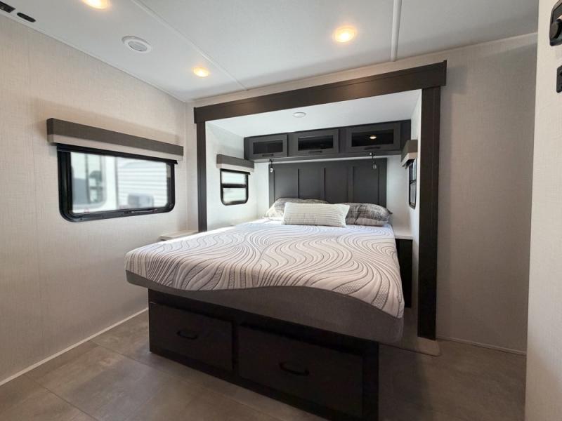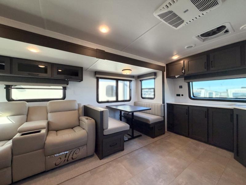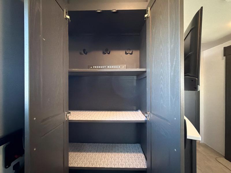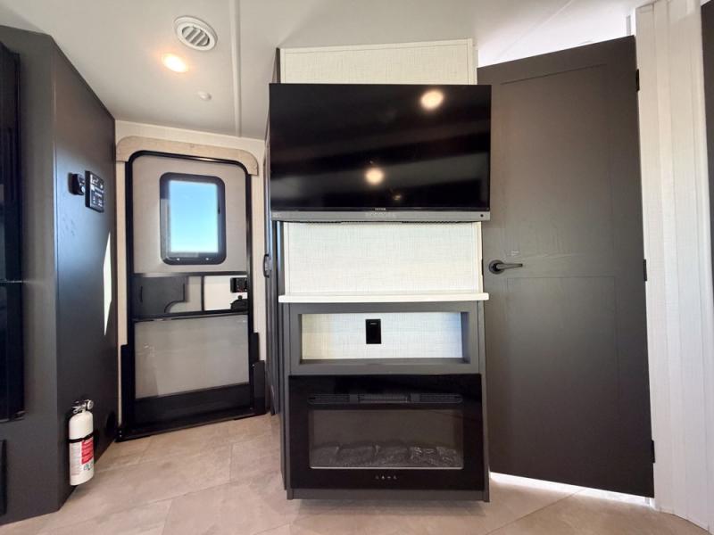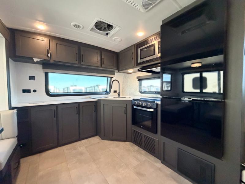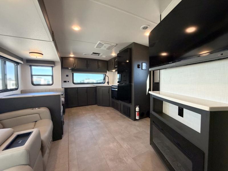 When you are outside this trailer you can enjoy the protection from the 21' power awning, and whip up a meal using the outside griddle. You will find exterior storage for your extra gear, and a ladder at the rear. You get to choose which entrance to step up into, be it the spacious rear bedroom with a queen bed slide and a wardrobe, or the main entry into the kitchen and living area. The furniture slide includes a booth dinette to eat your meals at, and theater seating to watch the Smart TV with a fireplace below. And the cook will love the front kitchen with extra counter space, a three burner range, plus a 12V refrigerator and pantry for food storage!
