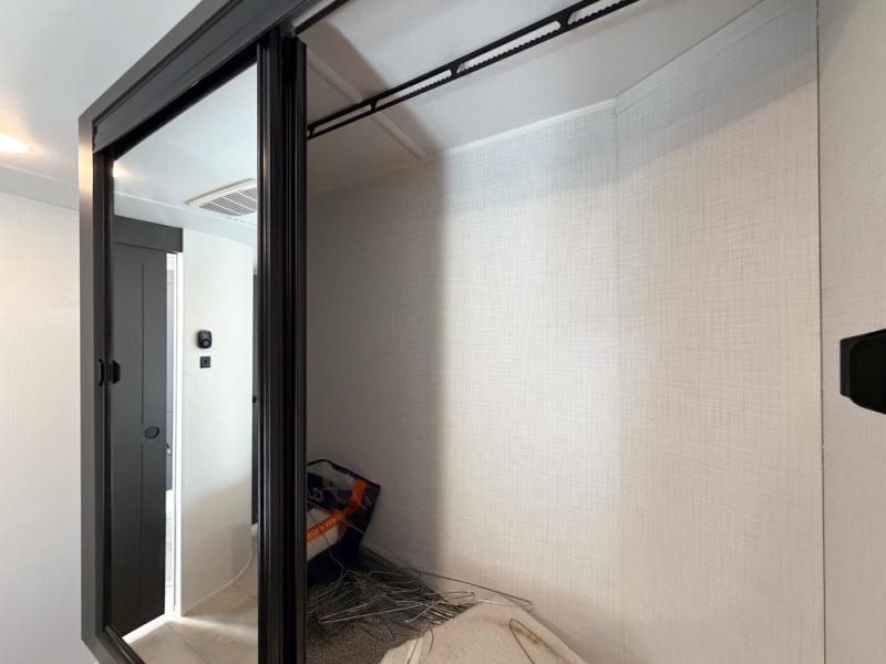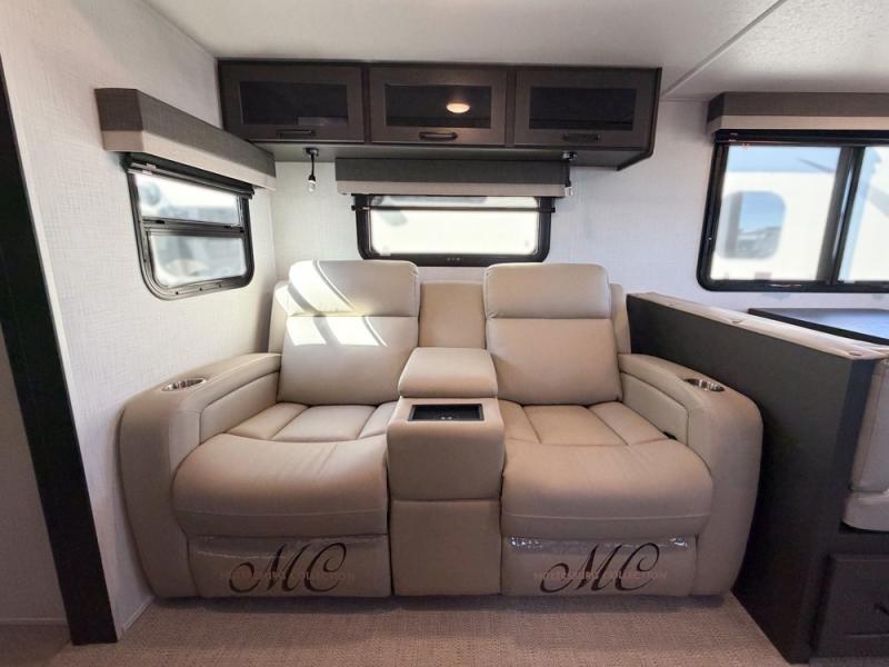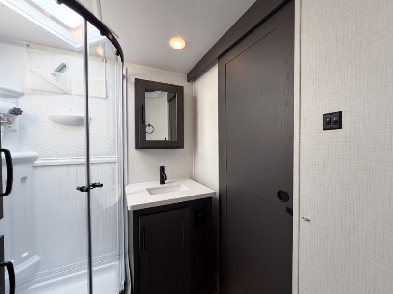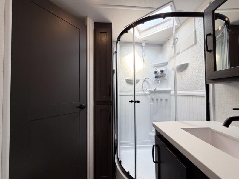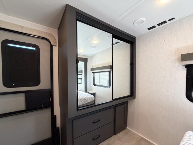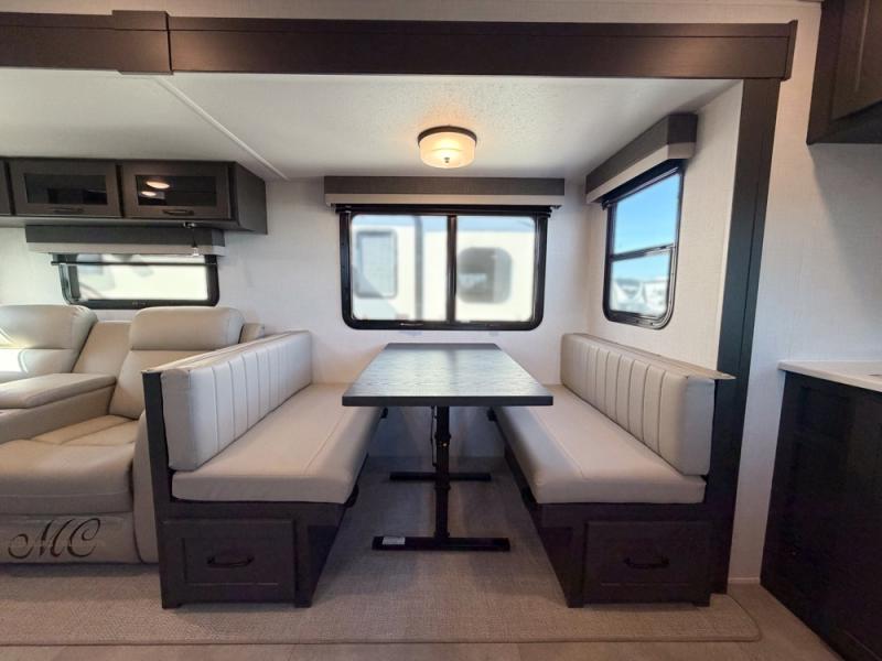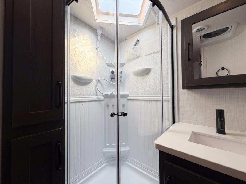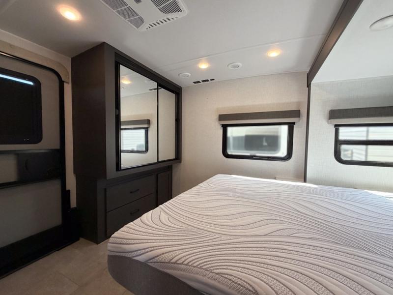 When you are outside this trailer you can enjoy the protection from the 21' power awning, and whip up a meal using the outside griddle. You will find exterior storage for your extra gear, and a ladder at the rear. You get to choose which entrance to step up into, be it the spacious rear bedroom with a queen bed slide and a wardrobe, or the main entry into the kitchen and living area. The furniture slide includes a booth dinette to eat your meals at, and theater seating to watch the Smart TV with a fireplace below. And the cook will love the front kitchen with extra counter space, a three burner range, plus a 12V refrigerator and pantry for food storage!
