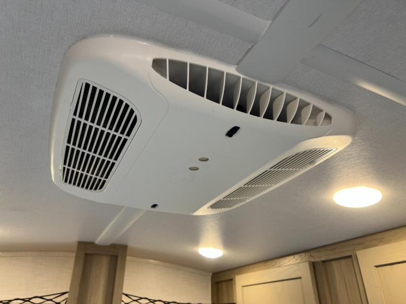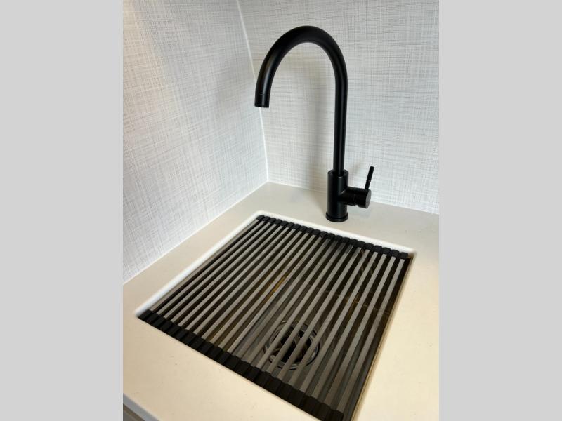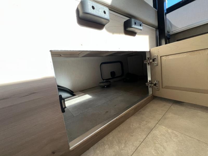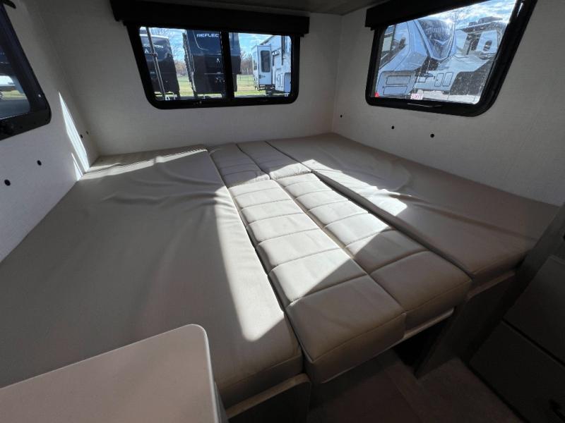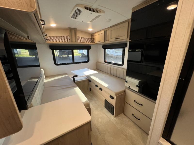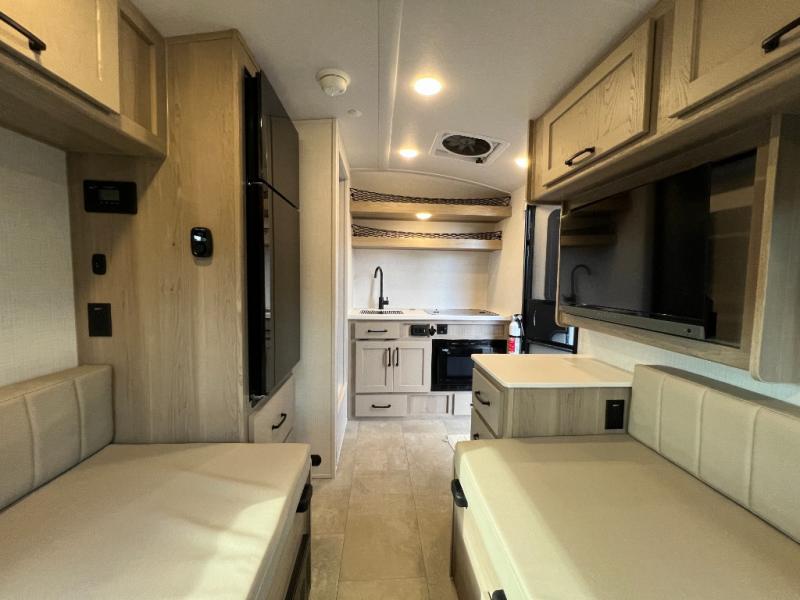 It won't be hard to find comfort in this travel trailer. It may be smaller on size, but it doesn't skim on features. The twin beds convert to a king-size bed for your comfort, and there is even a 32" 12V TV to enjoy in the evenings. The kitchen includes a three burner cooktop, a convection microwave, plus a 12V refrigerator for perishables. You'll find overhead compartments for your valuables and exterior storage for your hiking gear!