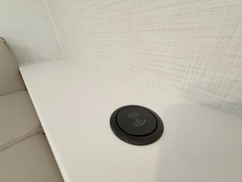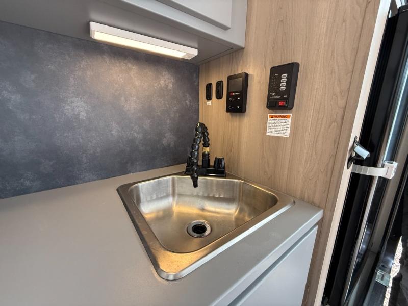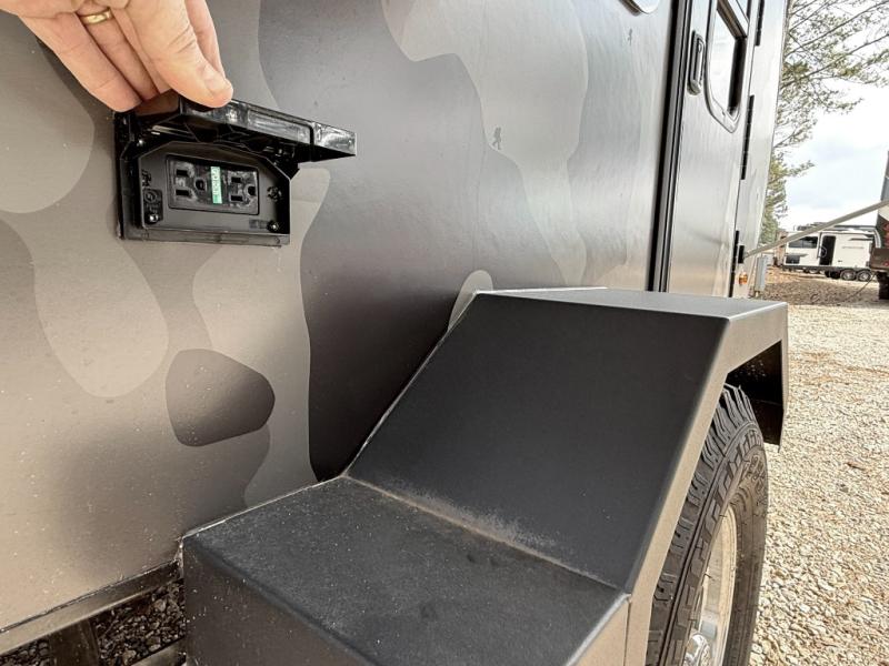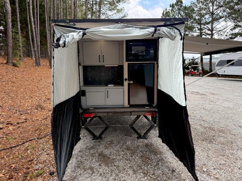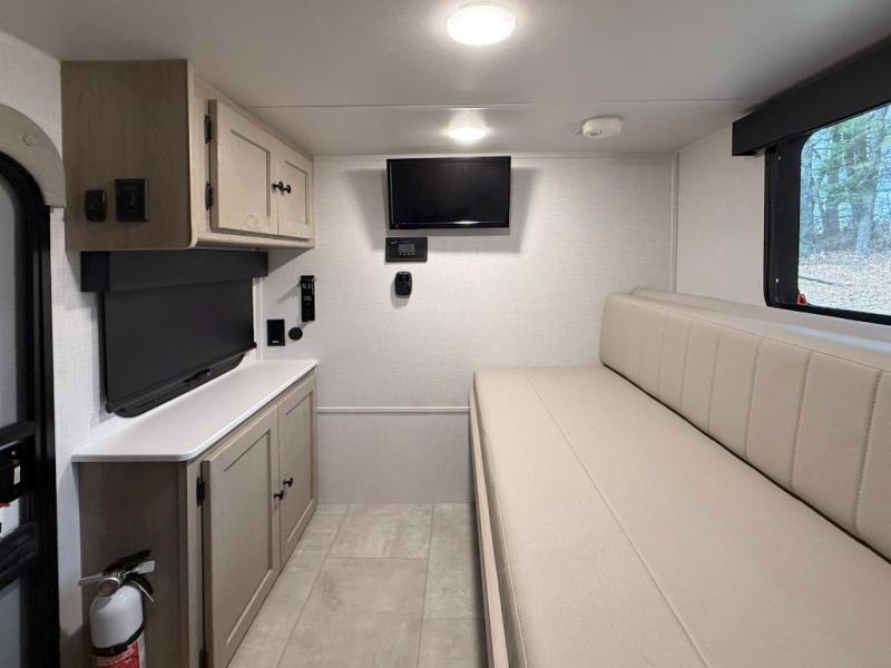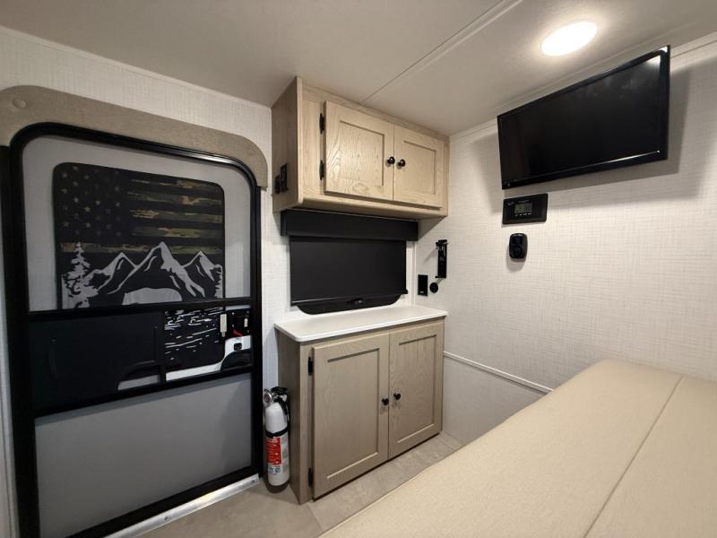 This is the perfect trailer to take on weekend trips to the lake! You'll enjoy a gaucho bed that can convert to your sleeping space at night, and there is a wardrobe to keep your clothes tidy. There is also a shelf here for more storage space! The outside kitchen includes a 12V refrigerator and a convection microwave, plus a griddle to cook meals on.