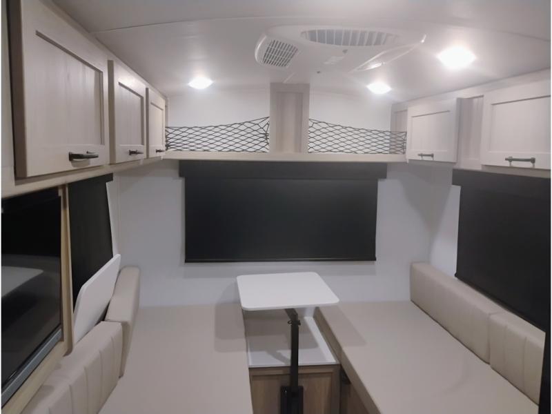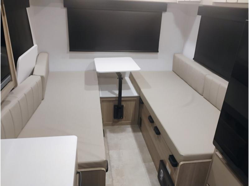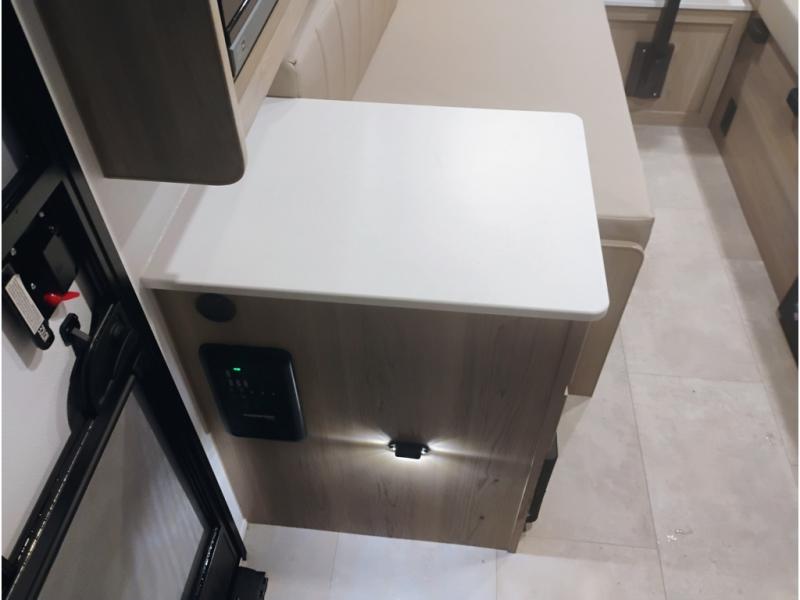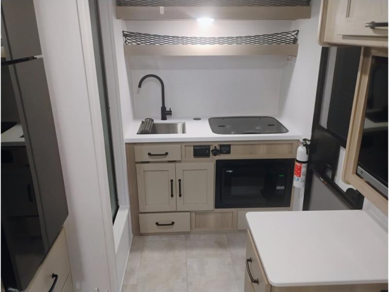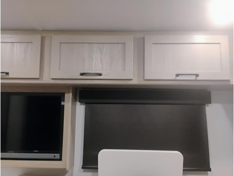 It won't be hard to find comfort in this travel trailer. It may be smaller on size, but it doesn't skim on features. The twin beds convert to a king-size bed for your comfort, and there is even a 32" 12V TV to enjoy in the evenings. The kitchen includes a three burner cooktop, a convection microwave, plus a 12V refrigerator for perishables. You'll find overhead compartments for your valuables and exterior storage for your hiking gear!