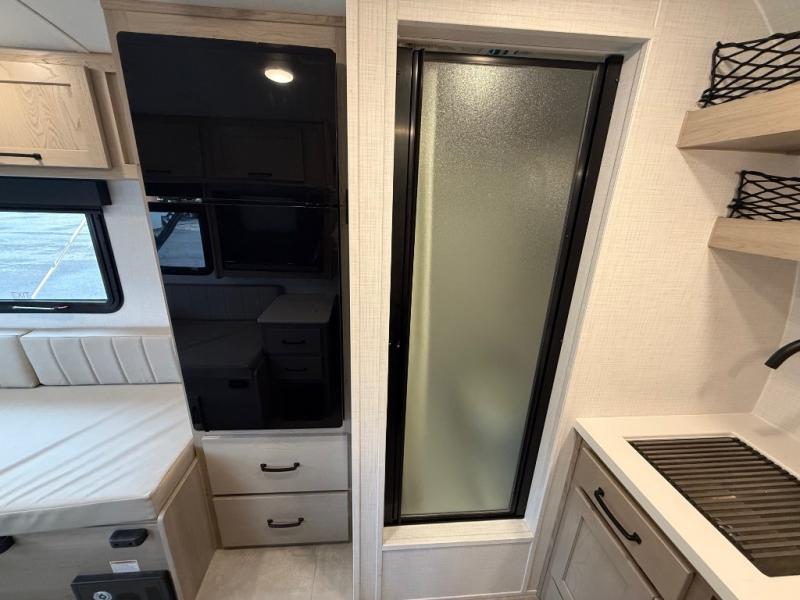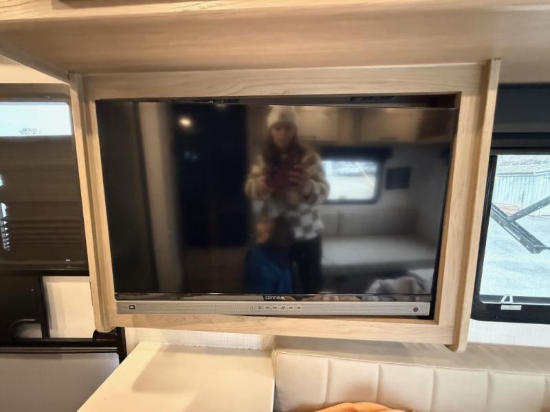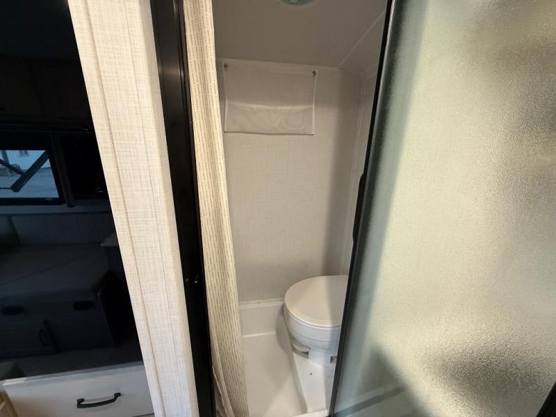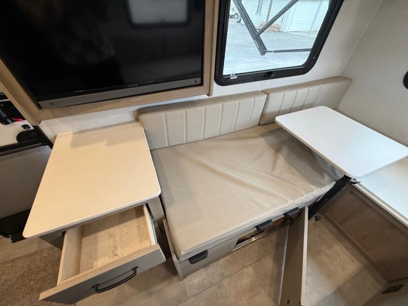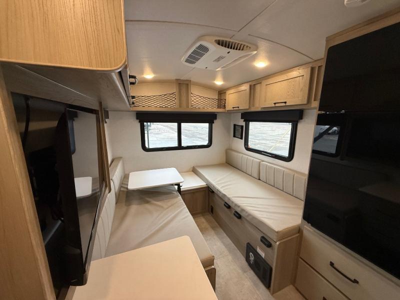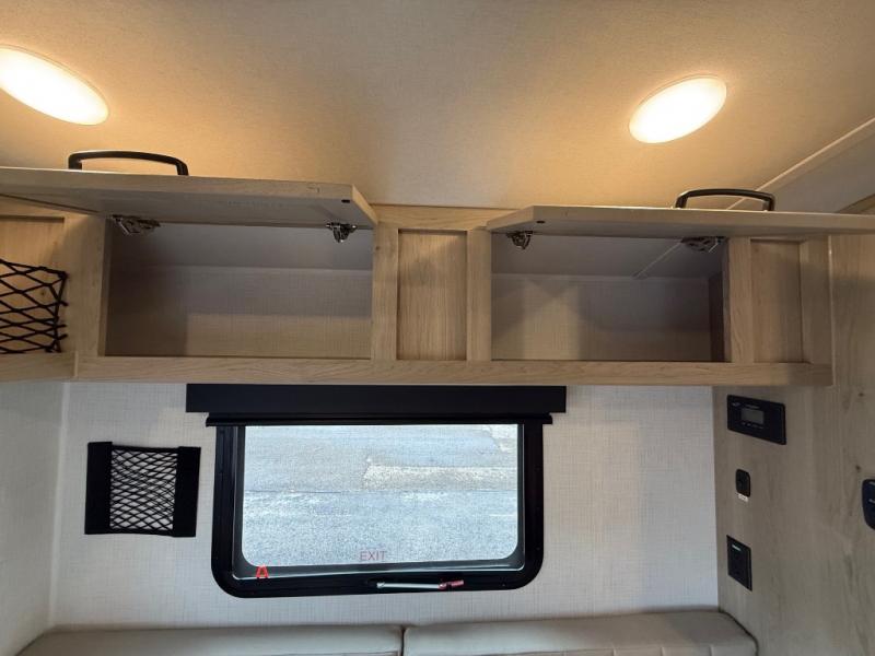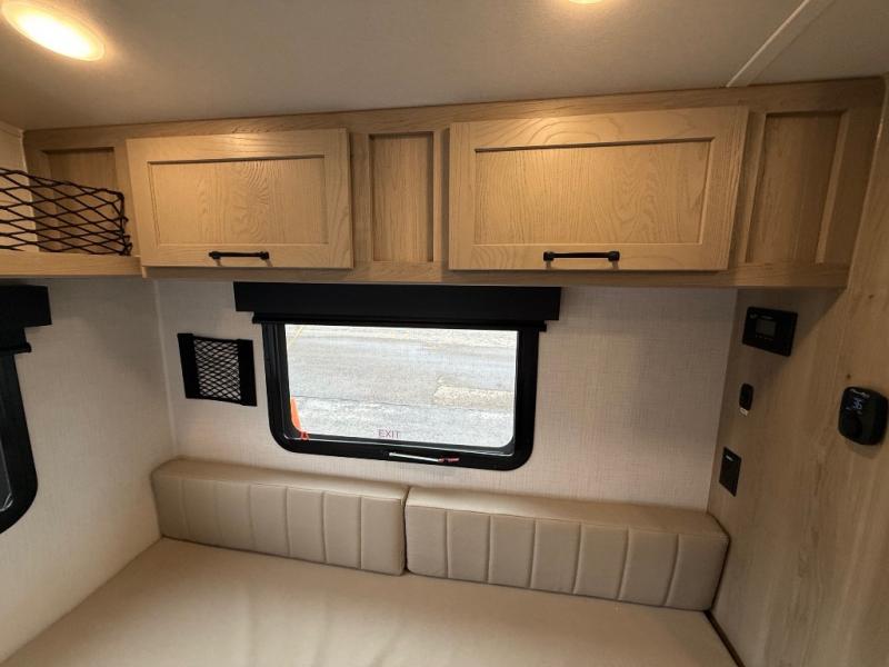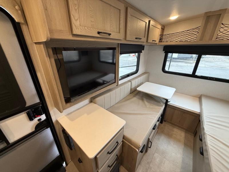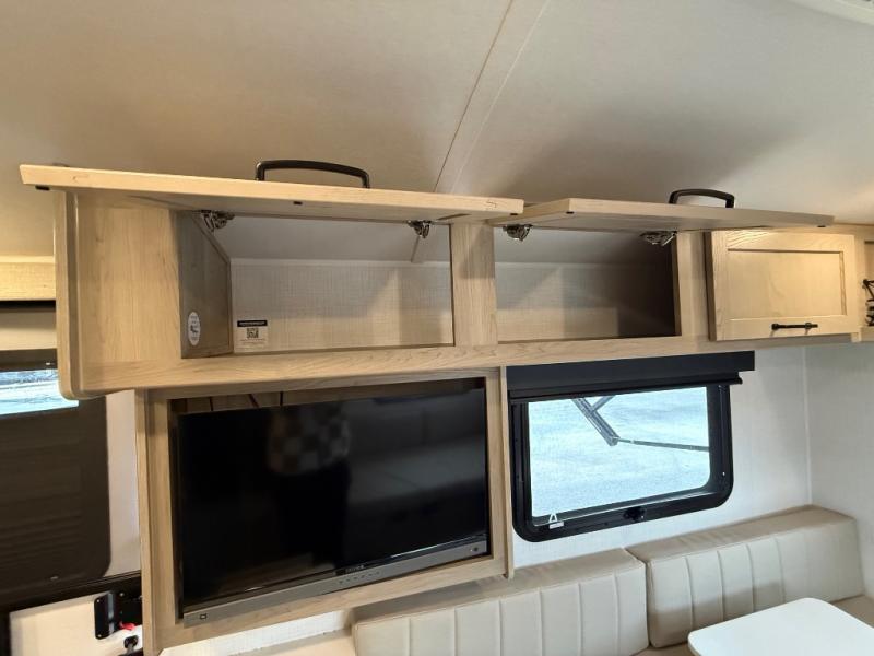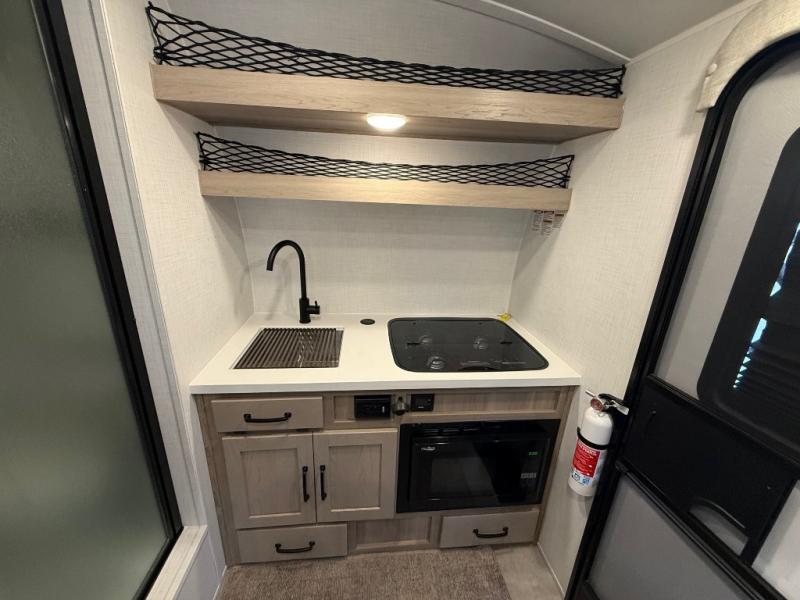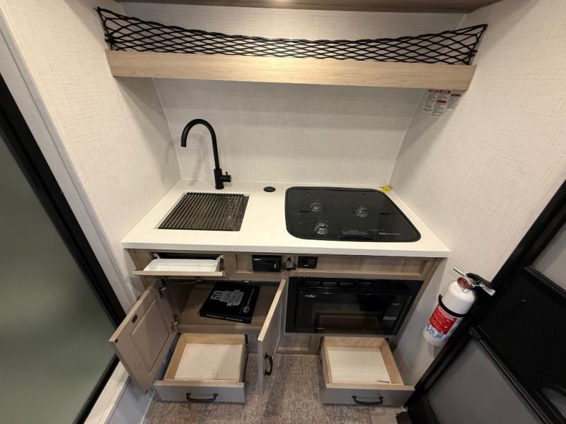 It won't be hard to find comfort in this travel trailer. It may be smaller on size, but it doesn't skim on features. The twin beds convert to a king-size bed for your comfort, and there is even a 32" 12V TV to enjoy in the evenings. The kitchen includes a three burner cooktop, a convection microwave, plus a 12V refrigerator for perishables. You'll find overhead compartments for your valuables and exterior storage for your hiking gear!
