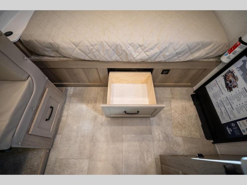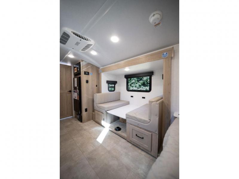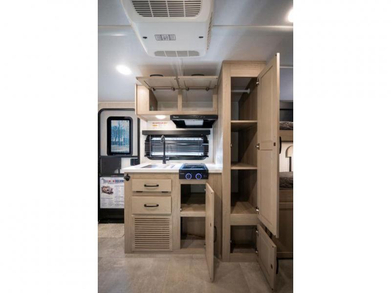 You're going to love camping with your family or friends in this spacious bunk model! The bunk beds will be perfect for little ones, while you take the front full-size bed. There is also a 44" booth dinette within the slide out for additional sleeping and seating space. The kitchen includes everything the chef will need to prepare meals each day, including a recessed cooktop, microwave oven, and a 12V refrigerator for perishables. If the weather is nice, you may just find the chef outdoors cooking on the outside griddle under the 14' power awning. And check out the exterior bike door that will be perfect for bikes, luggage, or extra camp gear. The optional Power Package available on this model includes three 200W solar panels, a 460 Ah Mastervolt MLI lithium-ion battery, two smart remotes, and more off-grid features!