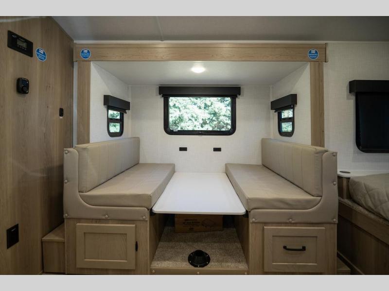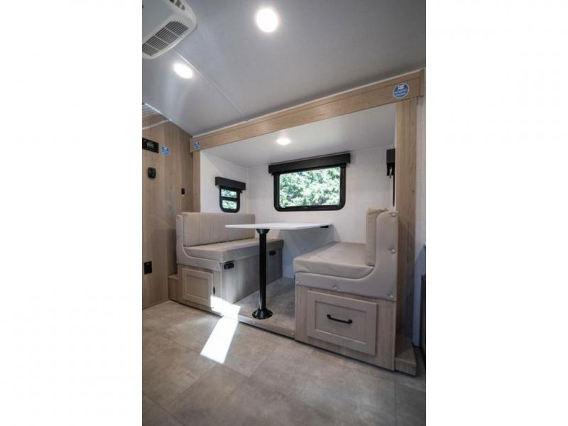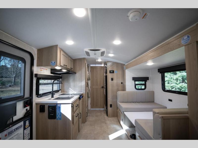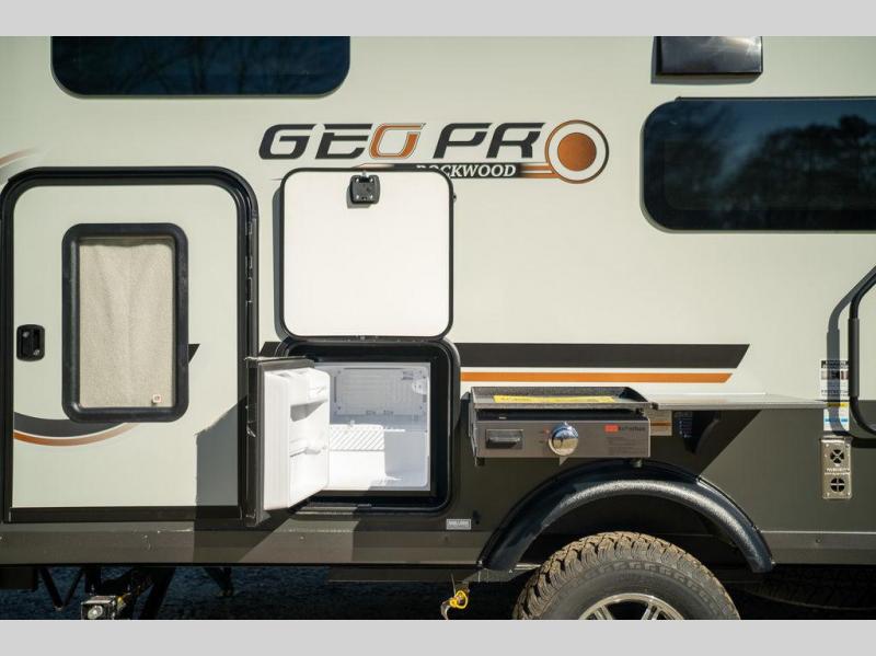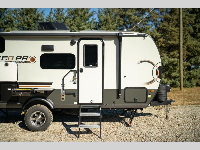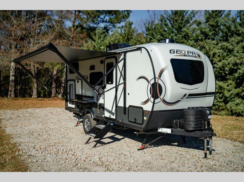 With any Rockwood GEO Pro travel trailer by Forest River you will enjoy easy towing, durable construction, and off-road capabilities with larger 15" tires and a lift kit! Each model is constructed with complete composite wall construction for added strength and durability, and the torsion axle, Rubber-Ryde suspension will make towing easier than ever. Inside, you'll find sleek roller shades for added privacy, a 12V refrigerator and a microwave, plus a 20,000 BTU furnace to keep you warm during the colder camping months.