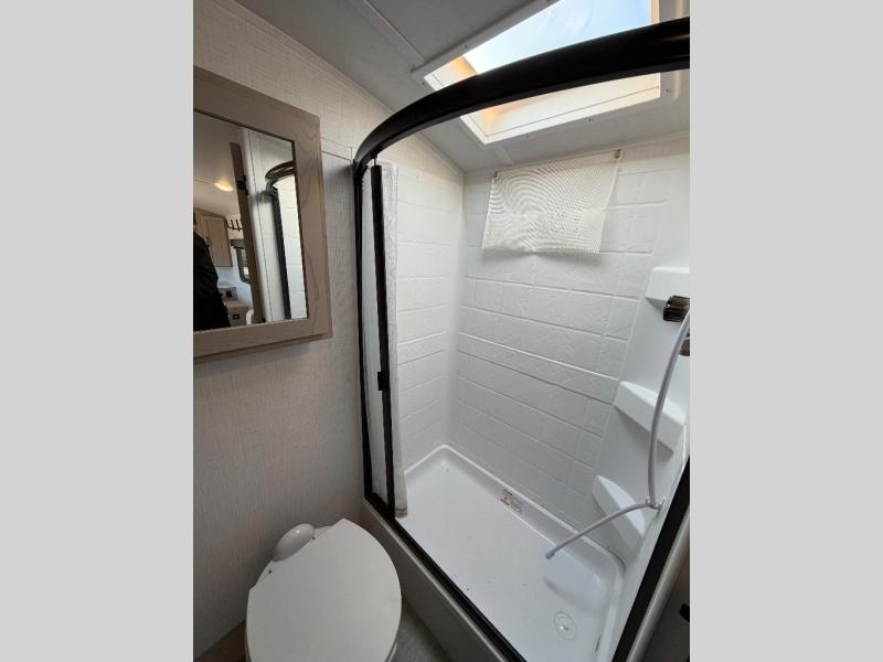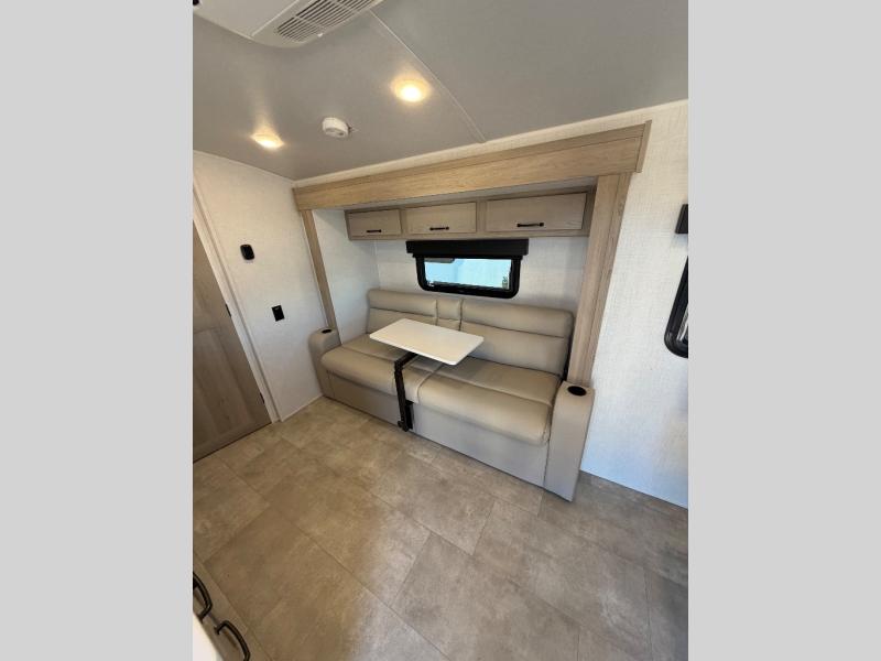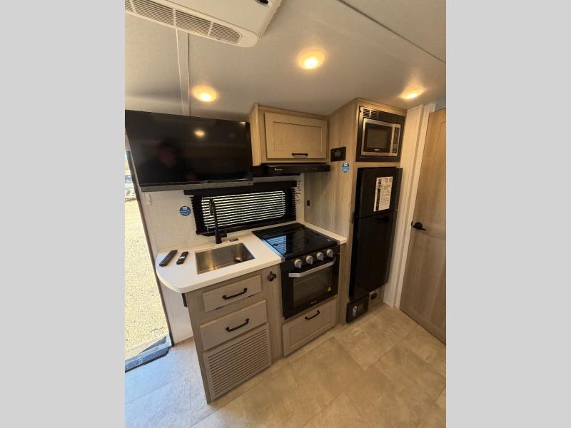 This travel trailer will feel more like home with its front bedroom and walk-around full-size bed. You'll enjoy the 32" 12V TV as you relax on the 72" sofa with a table and cupholders. The full rear bath includes a spacious shower to clean up in each day and there is a linen closet for clean towels. When you're ready to prepare dinner you'll have a three burner cooktop and microwave oven indoors, and a griddle outdoors! And don't forget the exterior storage allows you to bring along beach toys and tackle boxes. The optional Power Package available on this model includes three 200W solar panels, a side solar plug-in, a 3kW 160A inverter, and more off-grid features!