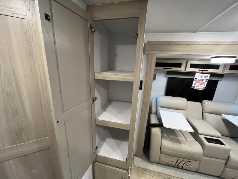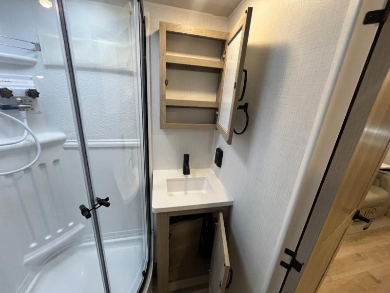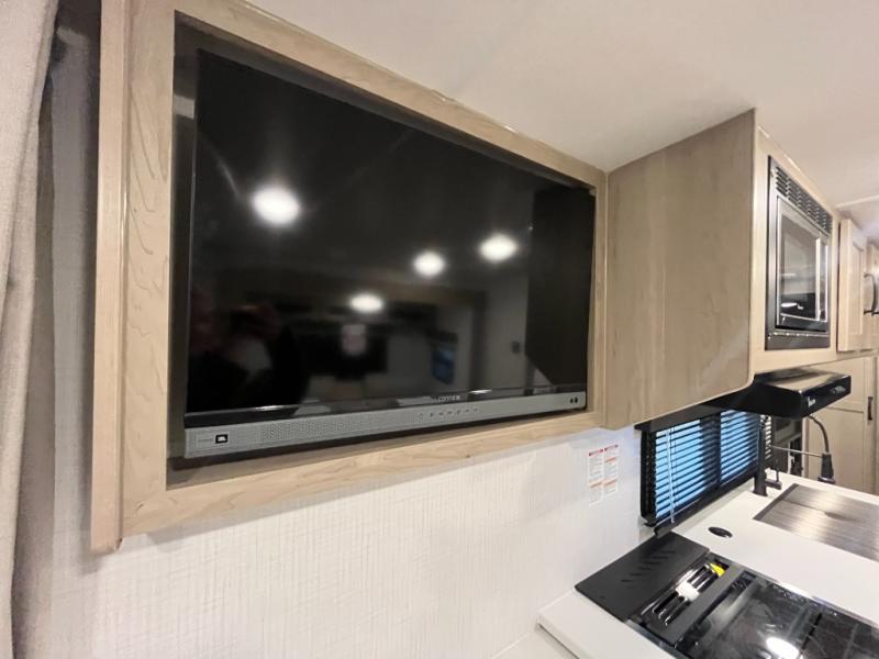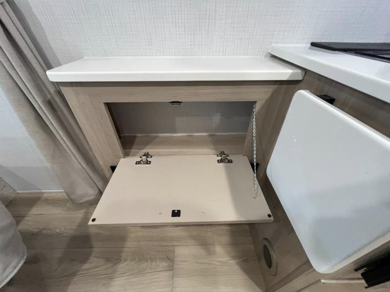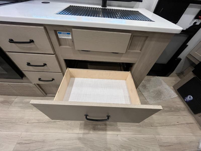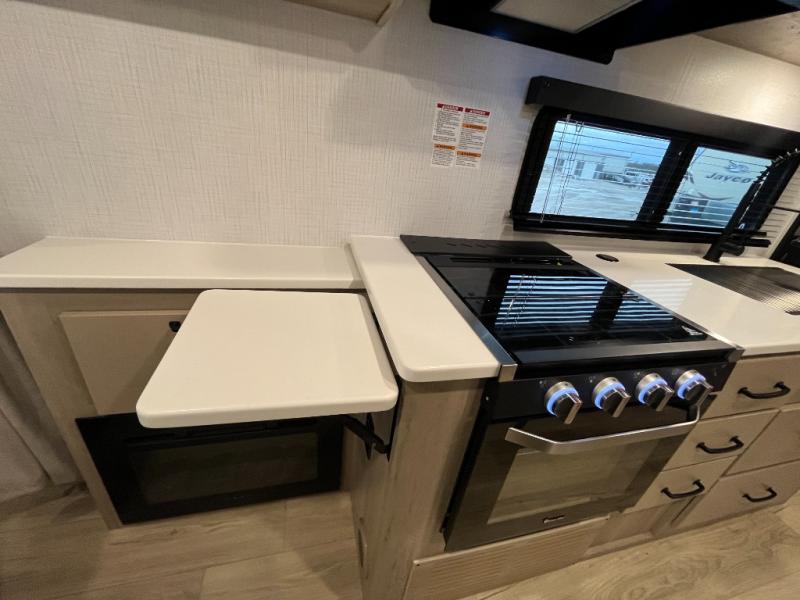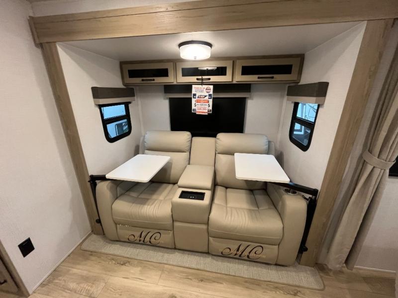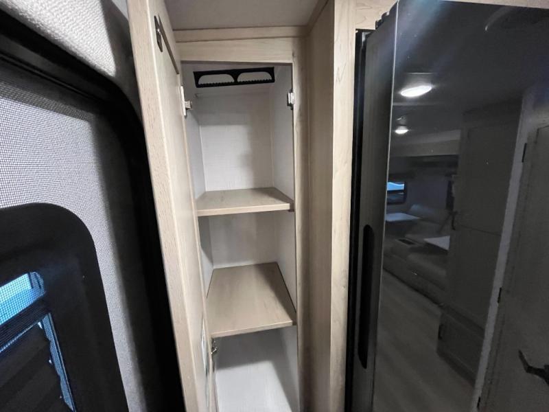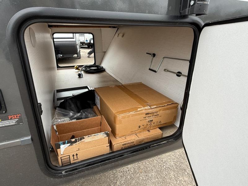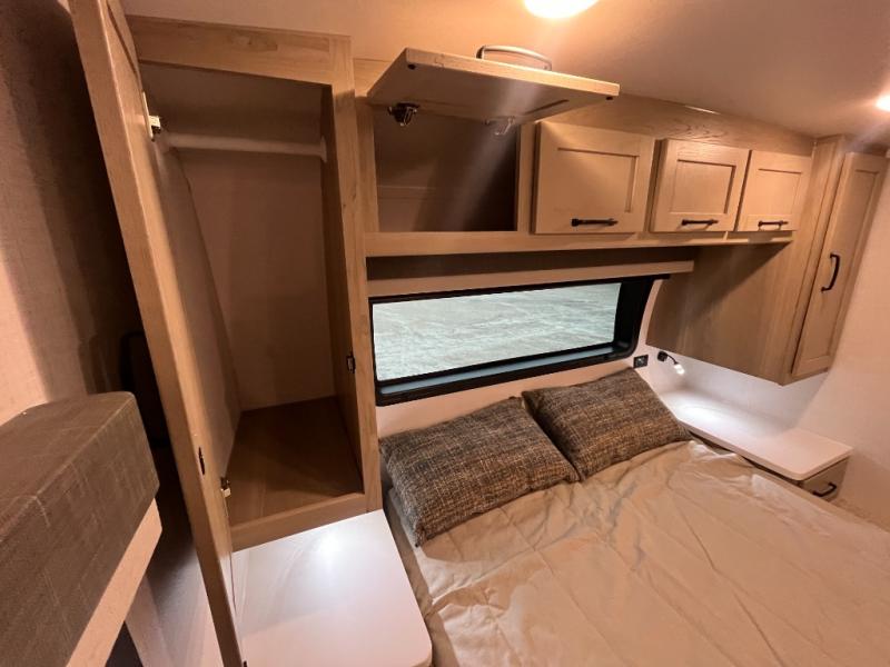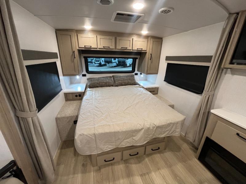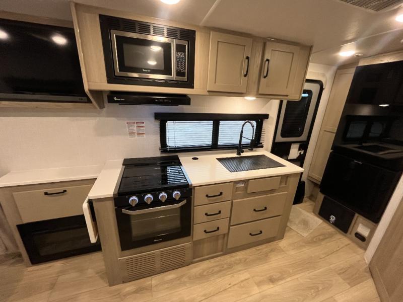 Enjoy the camping season with your spouse, friend, or significant other in this cozy travel trailer for two. Each morning, you can have your coffee on the 67" theater seats with a table within the slide out, then head outdoors to make pancakes on the outdoor griddle with an LP hookup. The interior kitchen includes a three burner cooktop, a microwave oven, plus a 12 volt refrigerator for perishables. An entertainment center with a fireplace will make your space feel more like home, and what's better than sleeping on your own queen bed with dual bedroom wardrobes for your clothes!?