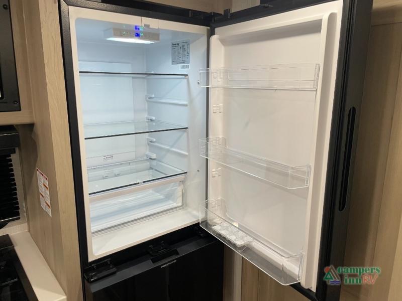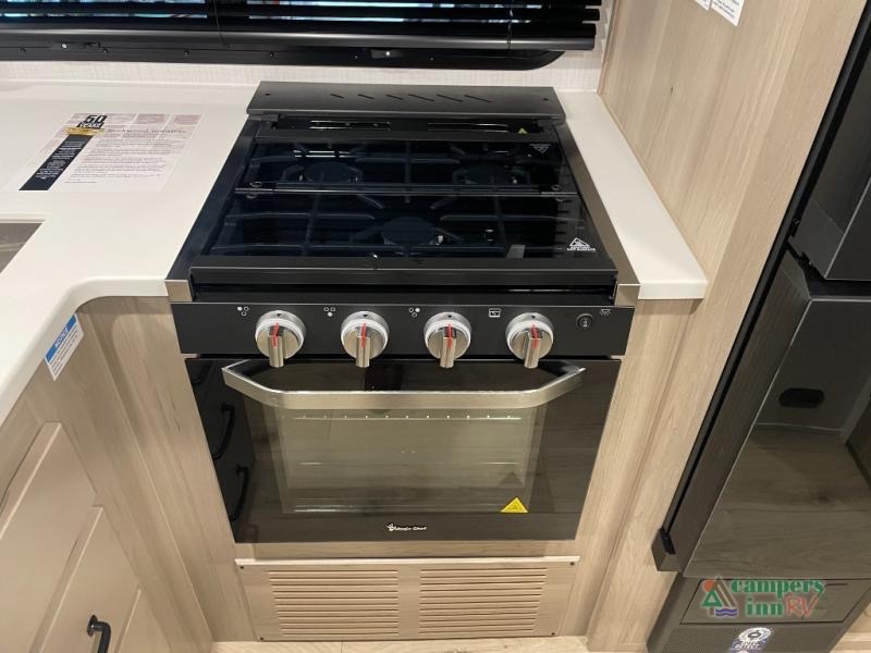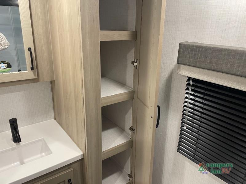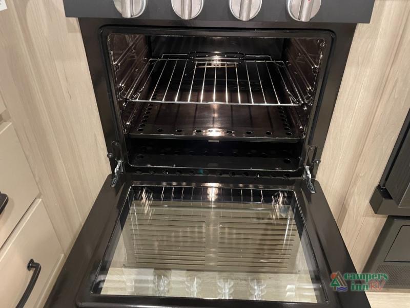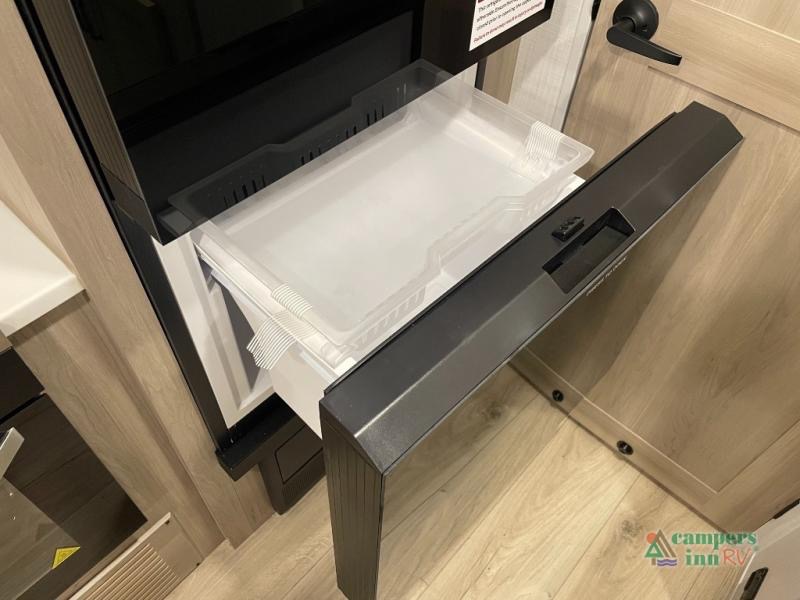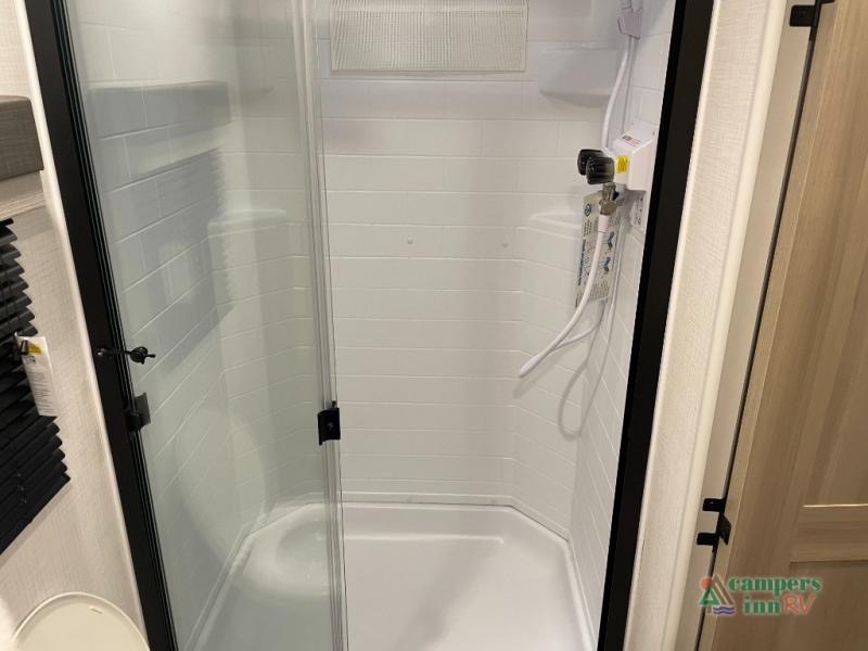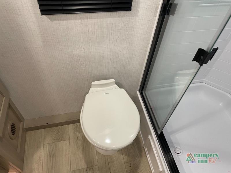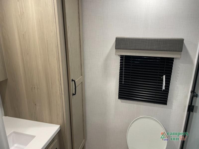 The spacious dinette slide offers room to dine, work, or lounge, while easily converting into an additional sleeping area when guests come along. The well-equipped kitchen features ample counter space, reliable appliances, and a layout that lets you prep meals without crowding. Up front, the dedicated bed area delivers a comfortable and private retreat after a long day on the road. The bathroom is designed with full functionality in mind, ensuring you have all the conveniences you need without giving up precious floor space.