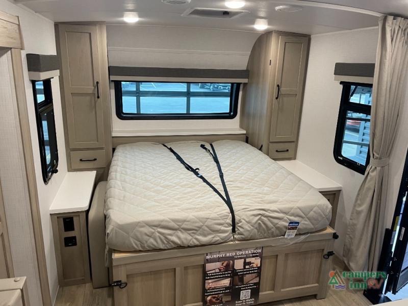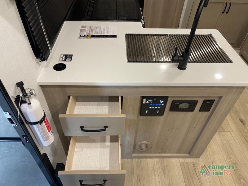 This floorplan is especially popular because it strikes a rare balance between livability and lightweight versatility. The slide-out opens up your main living area so you can move around freely, cook comfortably, and relax without feeling confined. Rockwood’s signature build quality enhances that experience with solid-surface countertops, high-end cabinetry, durable flooring, and cleverly placed storage throughout the trailer. From the first step inside, it simply feels like a space designed for real travelers, not just occasional use.