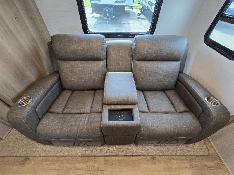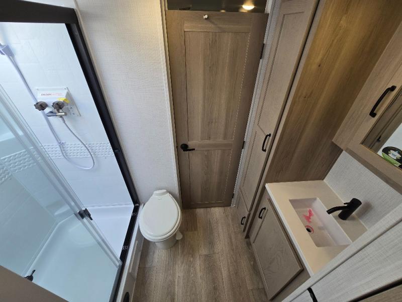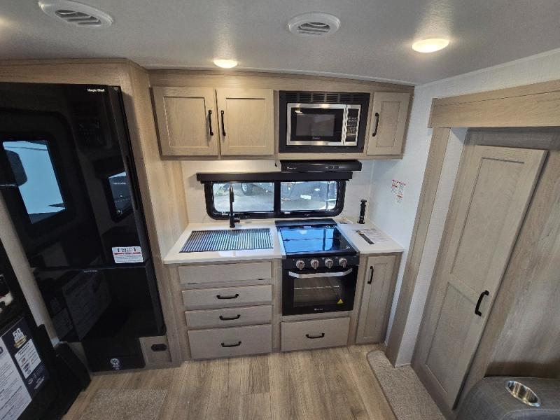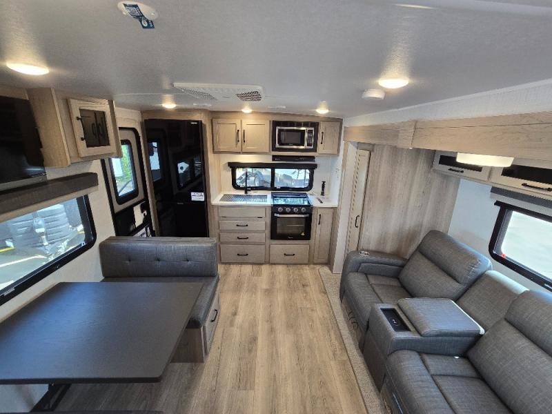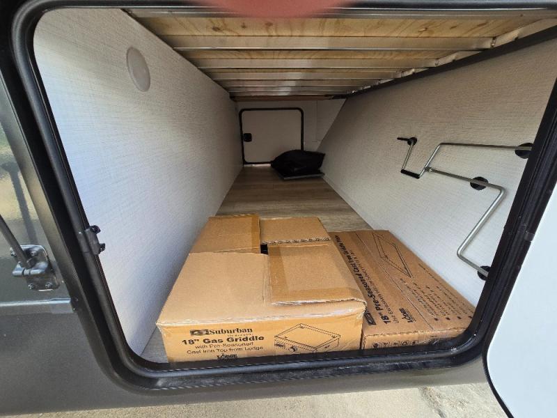 You and your spouse will have a great time camping in this travel trailer! You will have your own RV queen bed to sleep on in the front private bedroom, and an optional TV can be added if you enjoy the morning news in bed. Breakfast can be made on the three burner cooktop in the rear kitchen, or head outdoors to cook on the outside griddle. The 67" theater seating with cupholders will provide a place to relax and dine together, and the spacious walk-through bath will allow you to clean up before you head out for the day. This model includes plenty of storage space, including a pantry for your snacks, a wardrobe slide out in the bedroom, plus a drop-frame pass-through storage for larger camp gear!