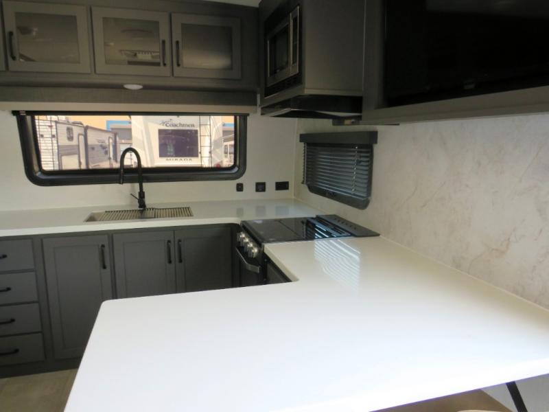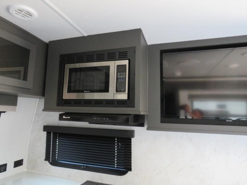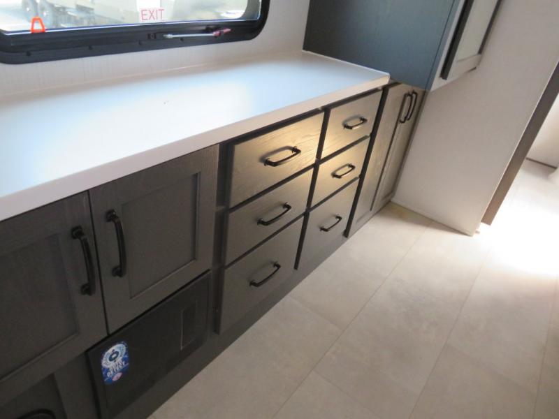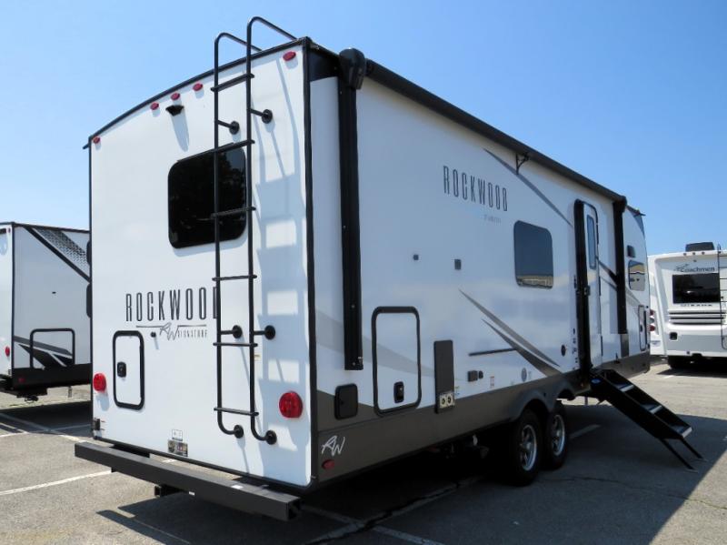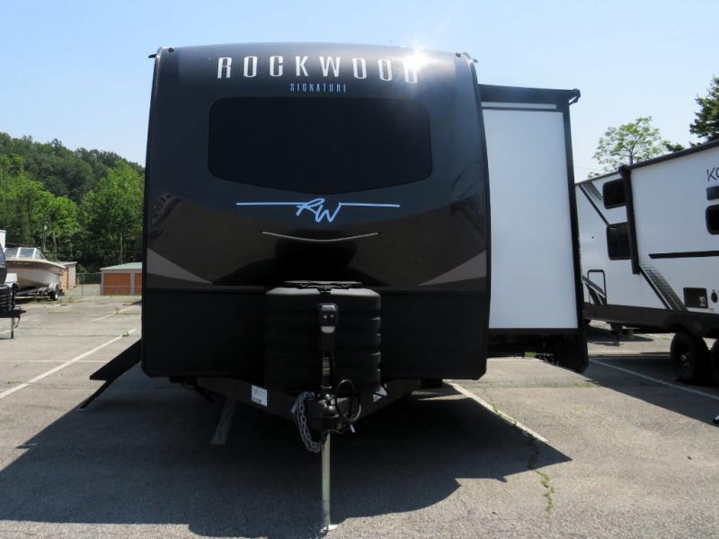 With any Rockwood Signature fifth wheel or travel trailer by Forest River RV, you will enjoy superior construction that includes laminated white fiberglass sidewalls, a radius roof with vaulted interior ceilings, plus radiant foil insulation and an enclosed underbelly for use in all types of weather. Some convenient exterior features include Keyed Alike locks, a rear ladder, a 200W solar panel, and a tire pressure monitor system with a monitor for added safety. The interior offers a One Touch OneControl panel with WeRV app control, for lights, awning, slides, water heater and more, and the Air 360+ omnidirectional antenna with WiFi prep lets you work while away from home if needed. You will also appreciate the interior vaulted ceilings, residential soft close doors and drawers, solid surface kitchen countertops, and designer kitchen backsplash!