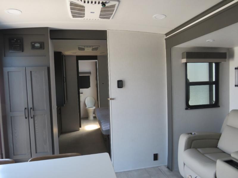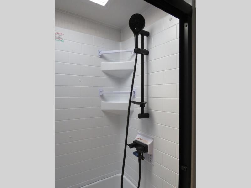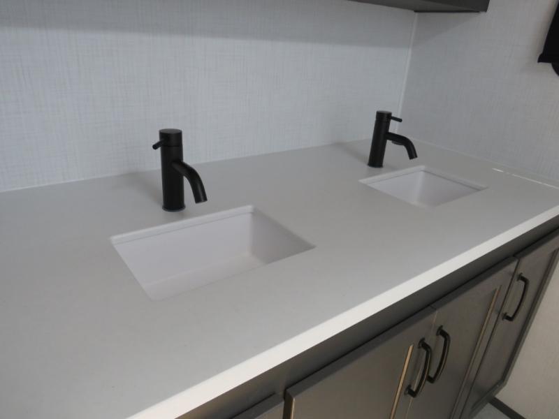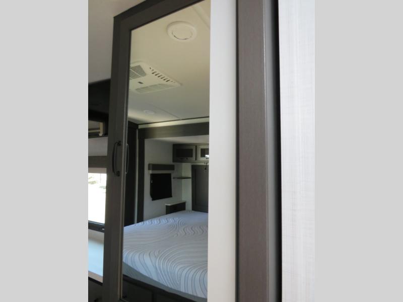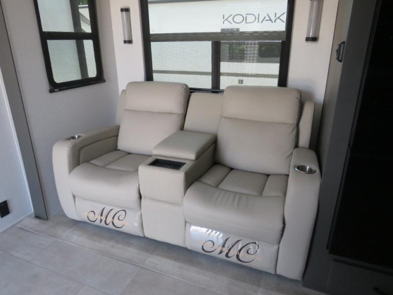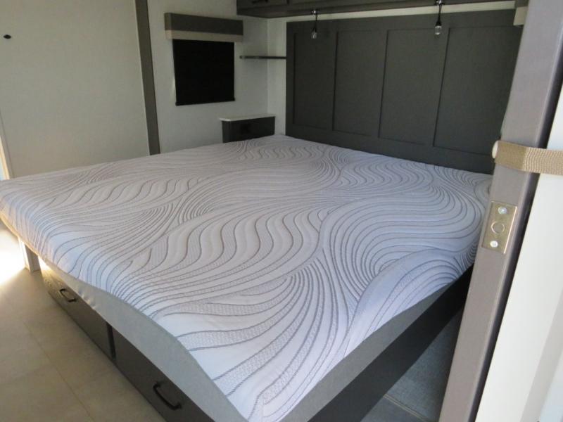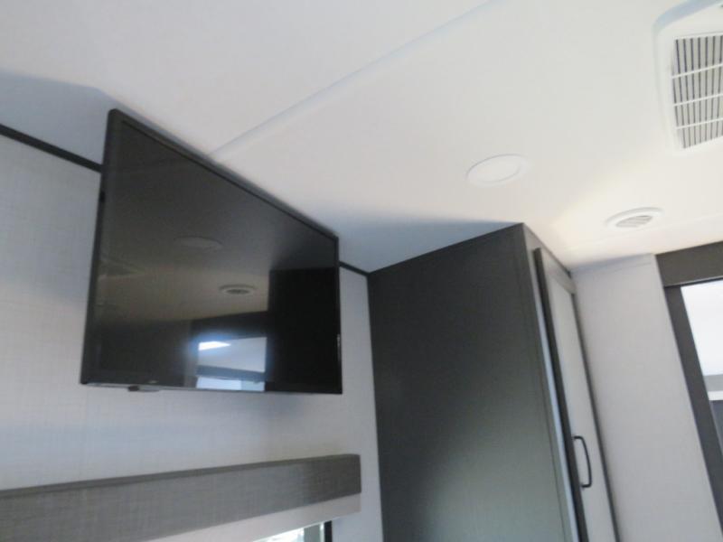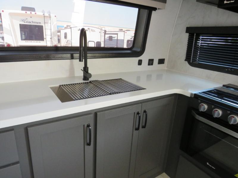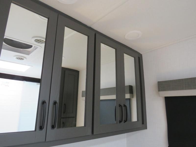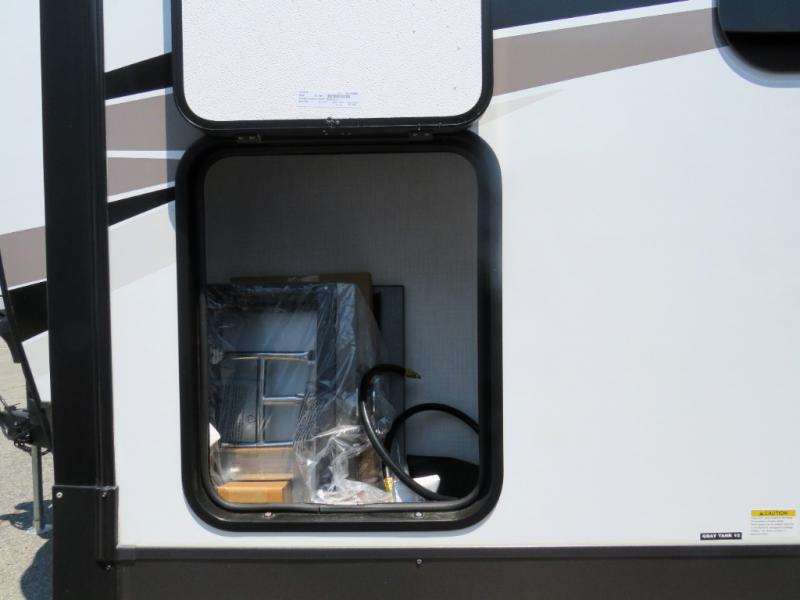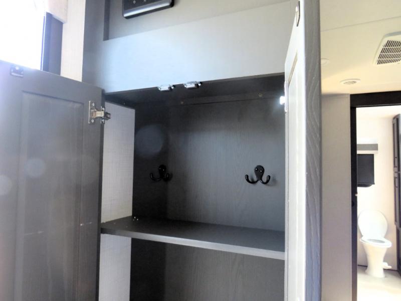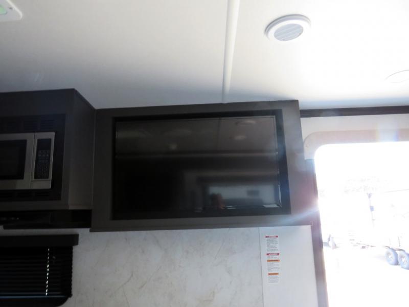 This front kitchen, couple's trailer is ready for adventure when you are! Once you arrive at your destination, prepare a quick lunch on the outside griddle, and enjoy the shade provided by the 19' power awning. You can eat outside, or inside at the counter with stools. The theatre seat will make this travel trailer feel more like home, and the double slides provide more space to stretch out. Within the master bedroom you'll find a king bed, a large wardrobe and a dresser, plus an optional TV. And check out the full rear bath with dual bath sinks and a shower with a seat! Now, that's what I call comfort!