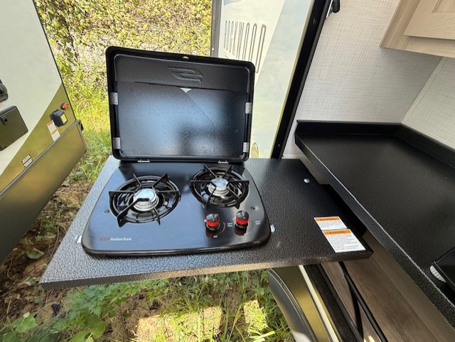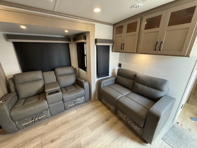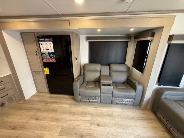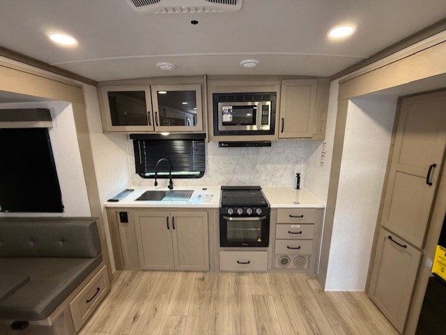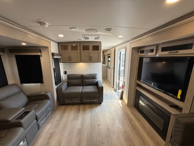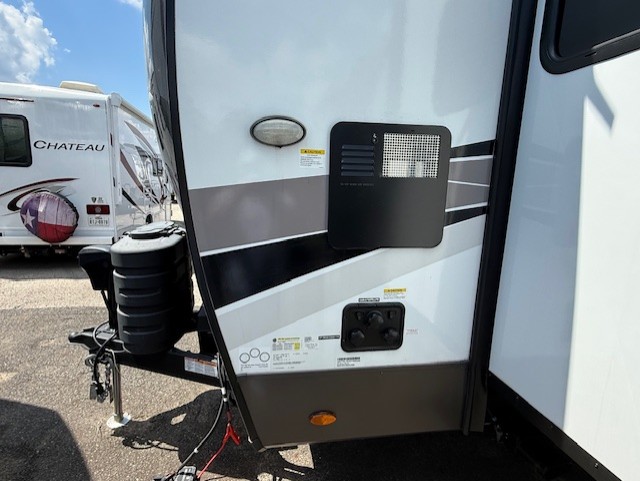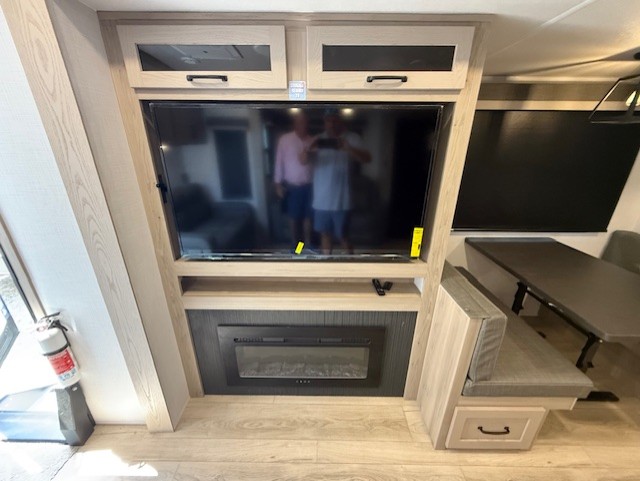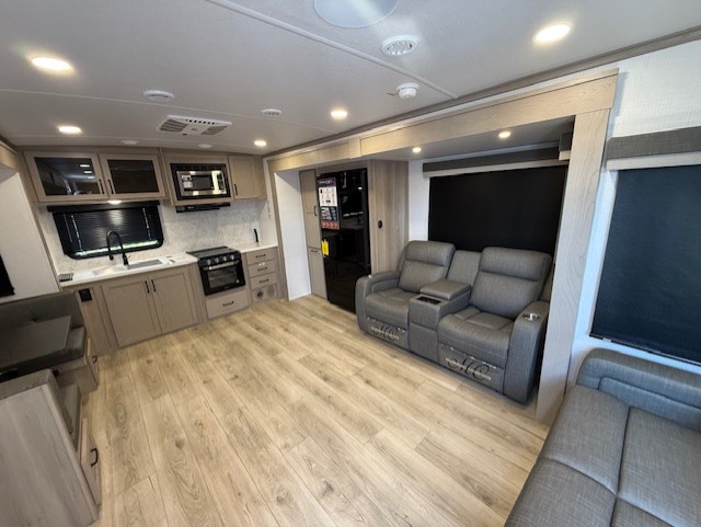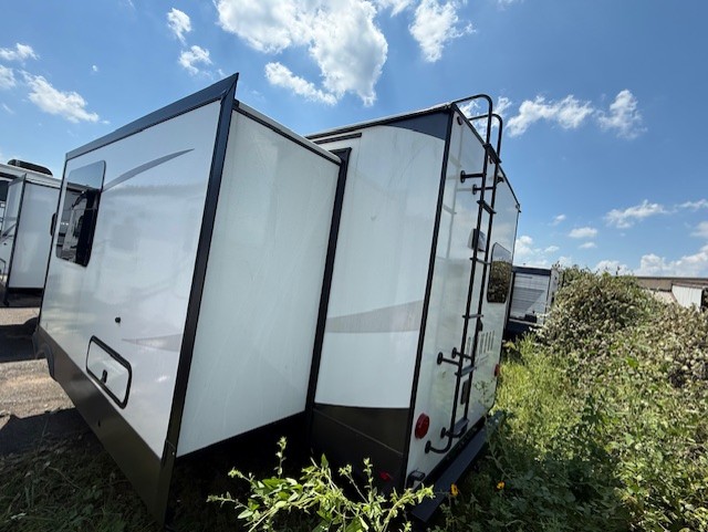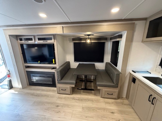 One step inside this rear kitchen travel trailer and you'll be sold! The dual opposing slides create an open floorplan you are sure to love, and you'll find plenty of seating spaces on the theater seat, the hide-a-bed sofa, and at the booth dinette. There is an entertainment center here with a Smart TV, plus a fireplace for those cooler nights. The full bath includes a shower with a seat, and the front private bedroom includes a queen bed slide out for more floor space. You can easily store your items in the large front wardrobe, plus there is a dresser and additional storage with washer and dryer prep. And check out the exterior with two power awnings, an outside kitchen, plus exterior storage for all your gear!