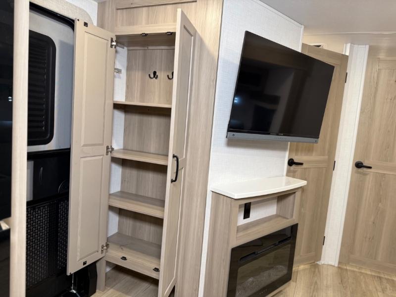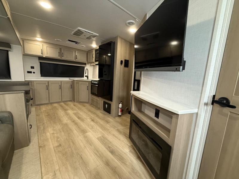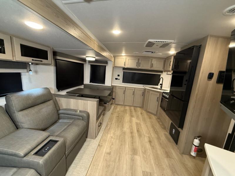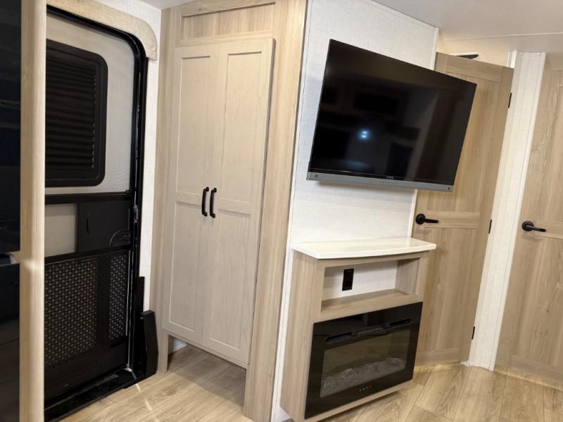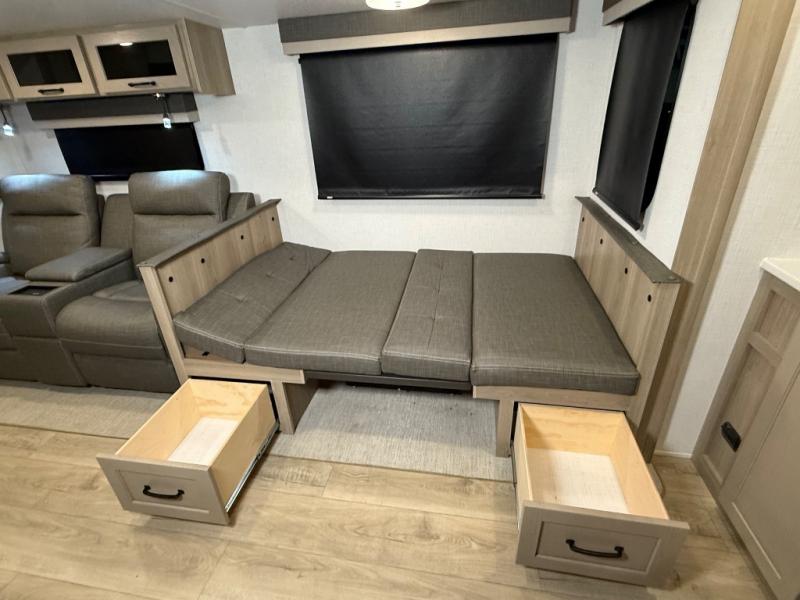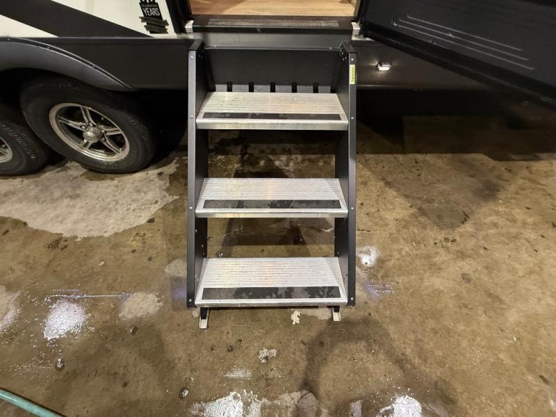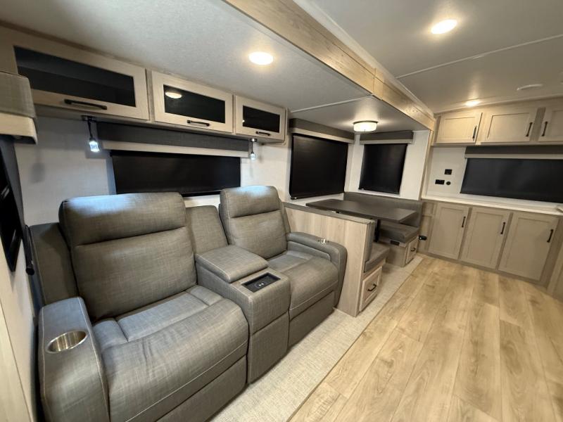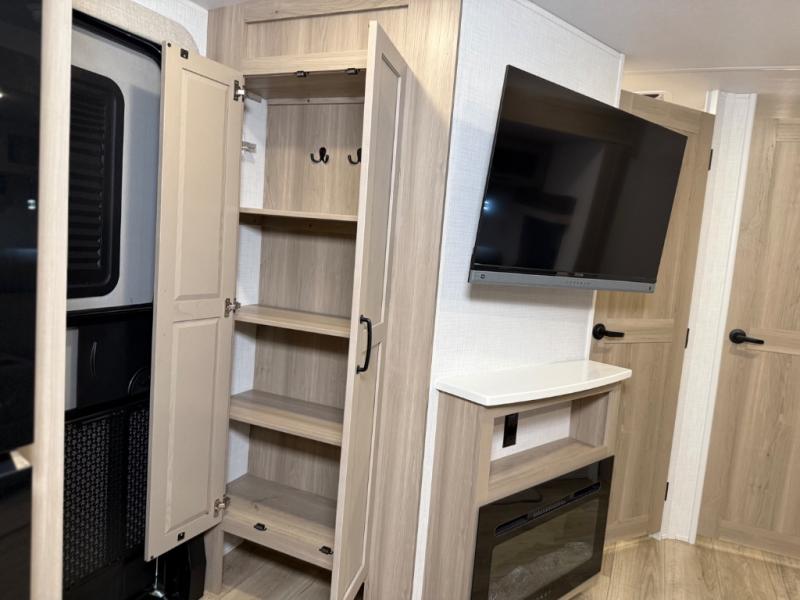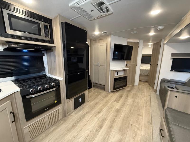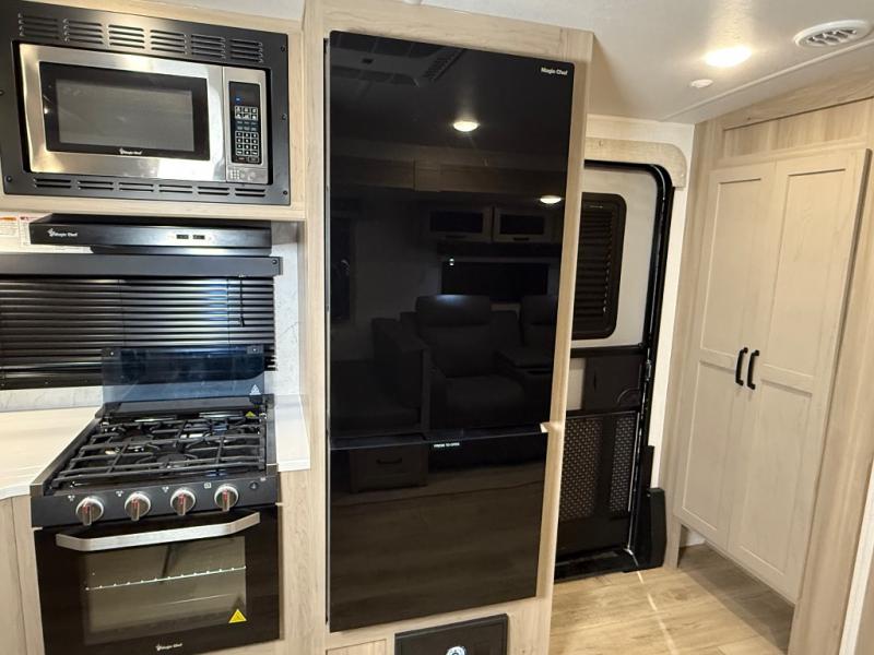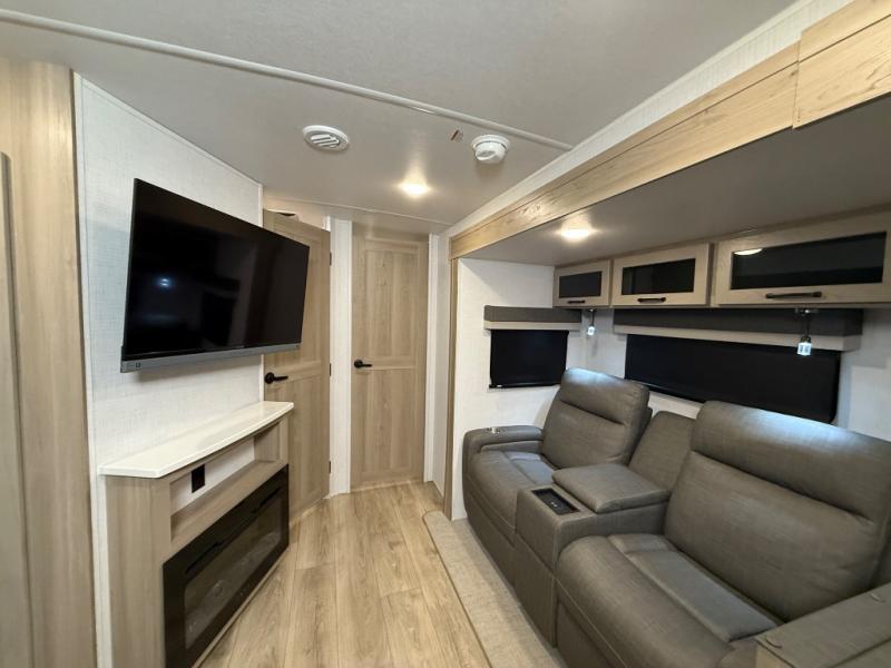 When you are outside this trailer you can enjoy the protection from the 21' power awning, and whip up a meal using the outside griddle. You will find exterior storage for your extra gear, and a ladder at the rear. You get to choose which entrance to step up into, be it the spacious rear bedroom with a queen bed slide and a wardrobe, or the main entry into the kitchen and living area. The furniture slide includes a booth dinette to eat your meals at, and theater seating to watch the Smart TV with a fireplace below. And the cook will love the front kitchen with extra counter space, a three burner range, plus a 12V refrigerator and pantry for food storage!
