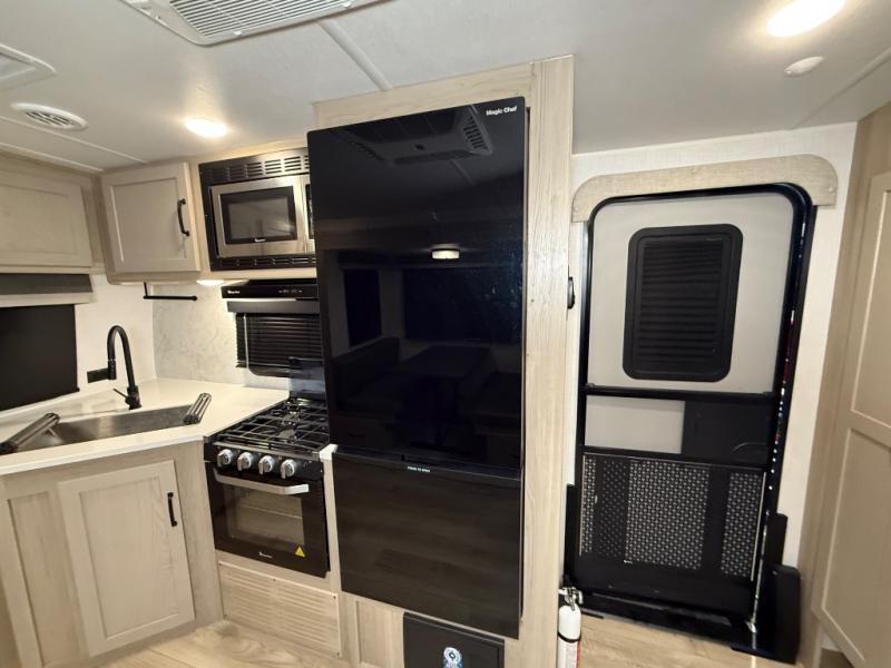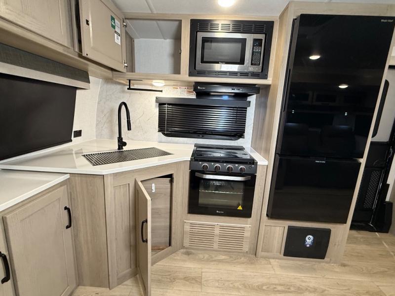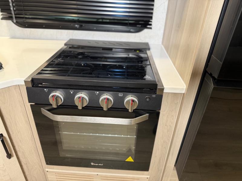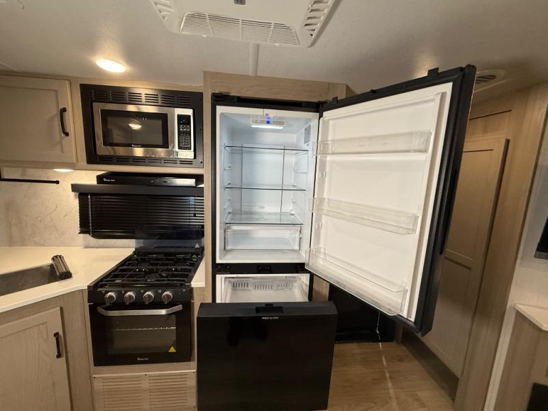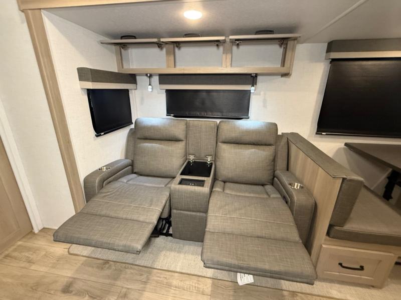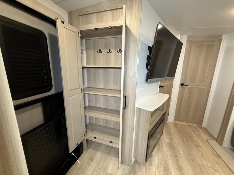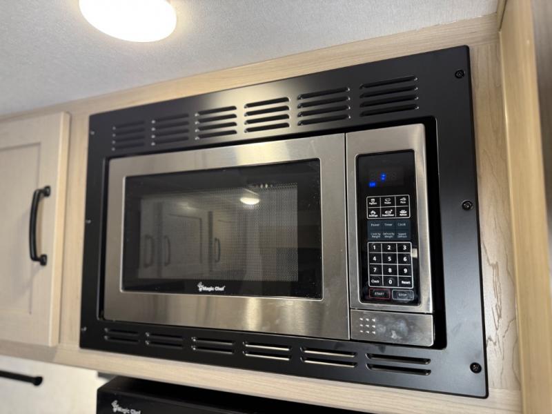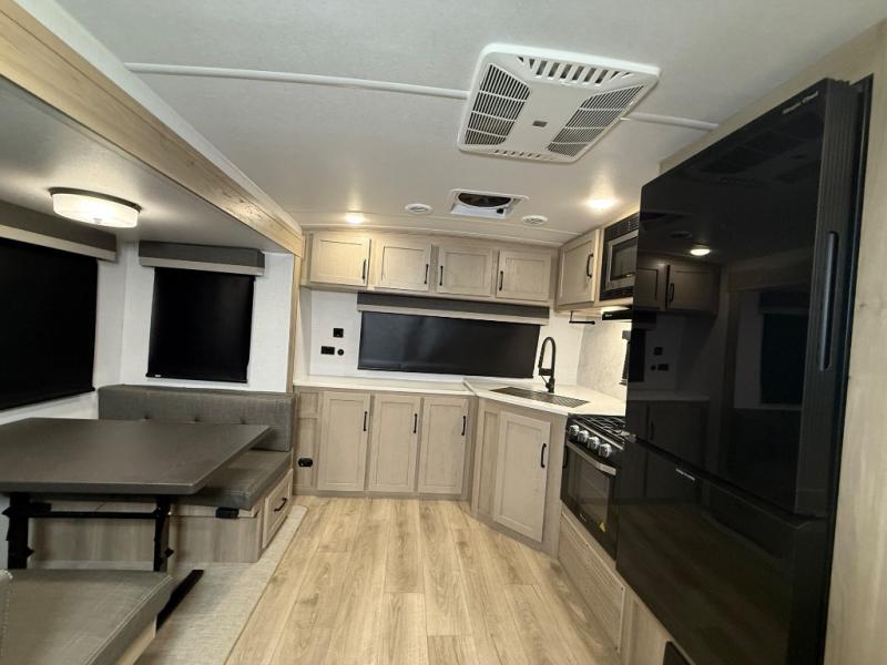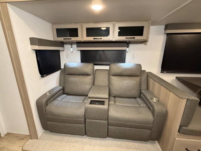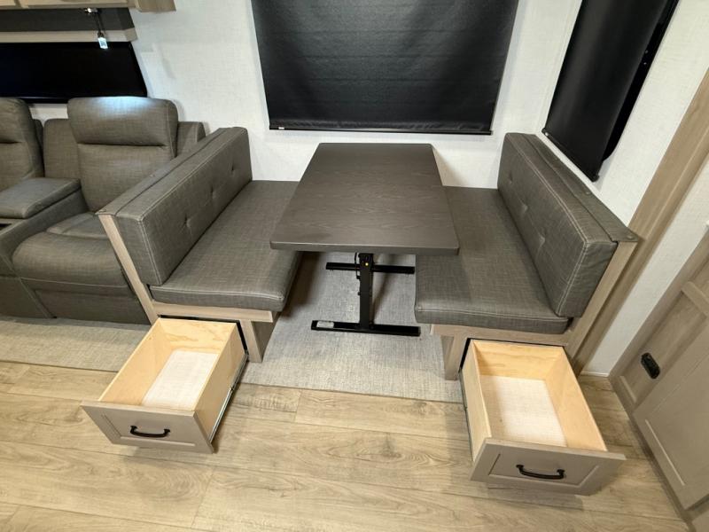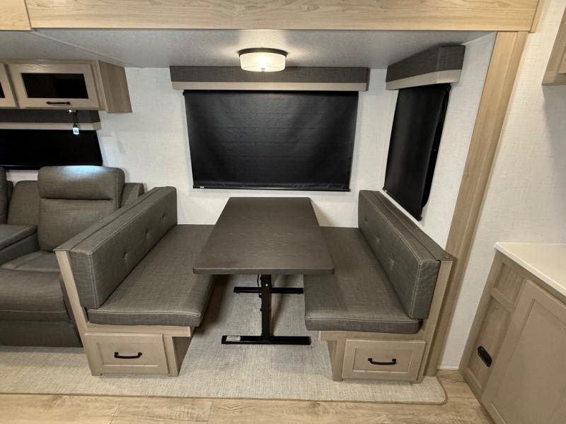 When you are outside this trailer you can enjoy the protection from the 21' power awning, and whip up a meal using the outside griddle. You will find exterior storage for your extra gear, and a ladder at the rear. You get to choose which entrance to step up into, be it the spacious rear bedroom with a queen bed slide and a wardrobe, or the main entry into the kitchen and living area. The furniture slide includes a booth dinette to eat your meals at, and theater seating to watch the Smart TV with a fireplace below. And the cook will love the front kitchen with extra counter space, a three burner range, plus a 12V refrigerator and pantry for food storage!