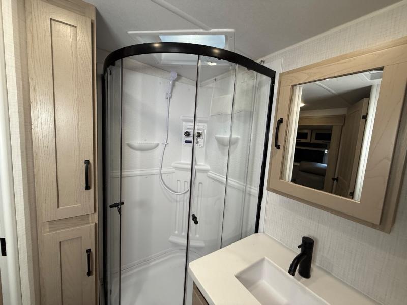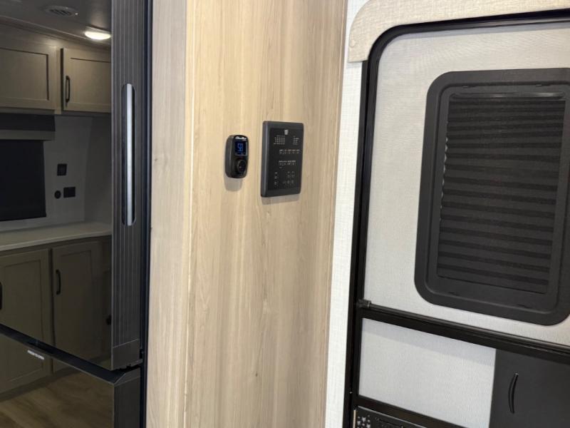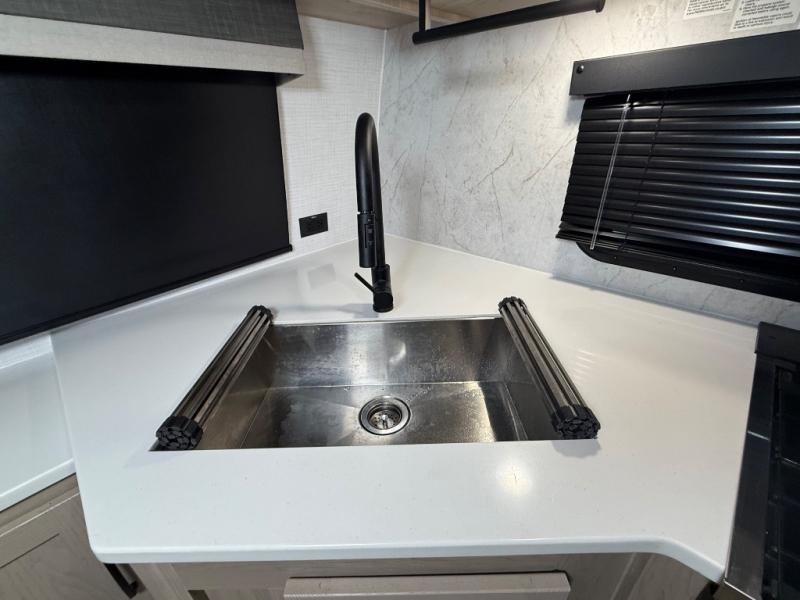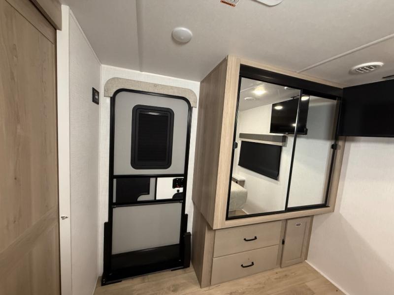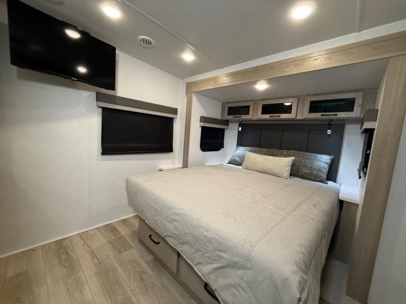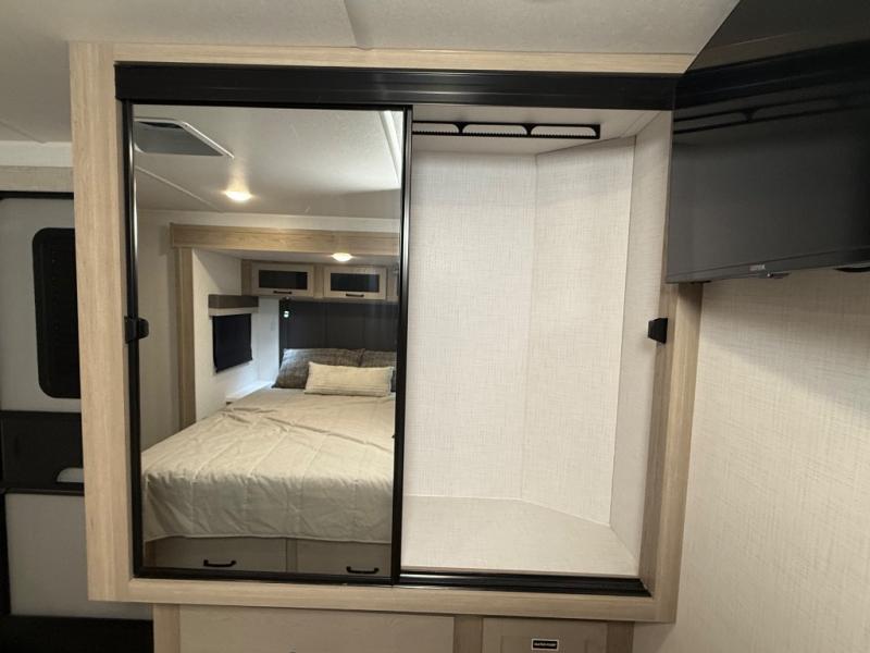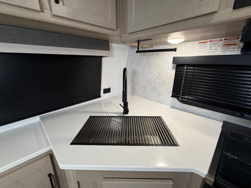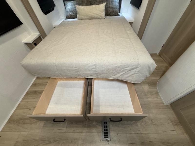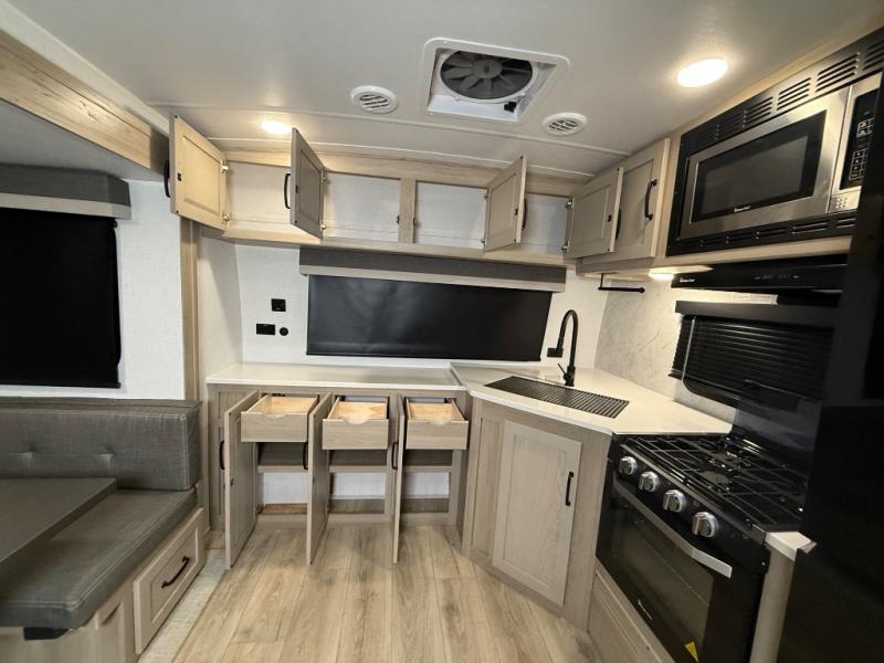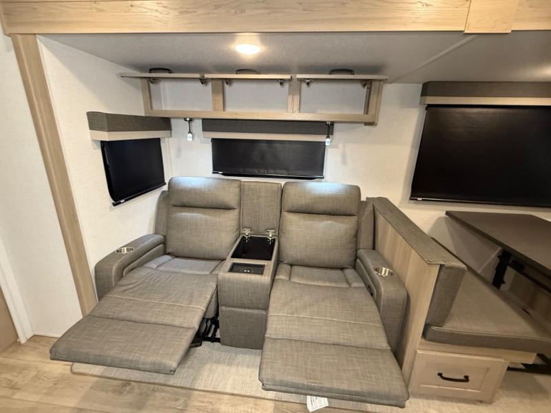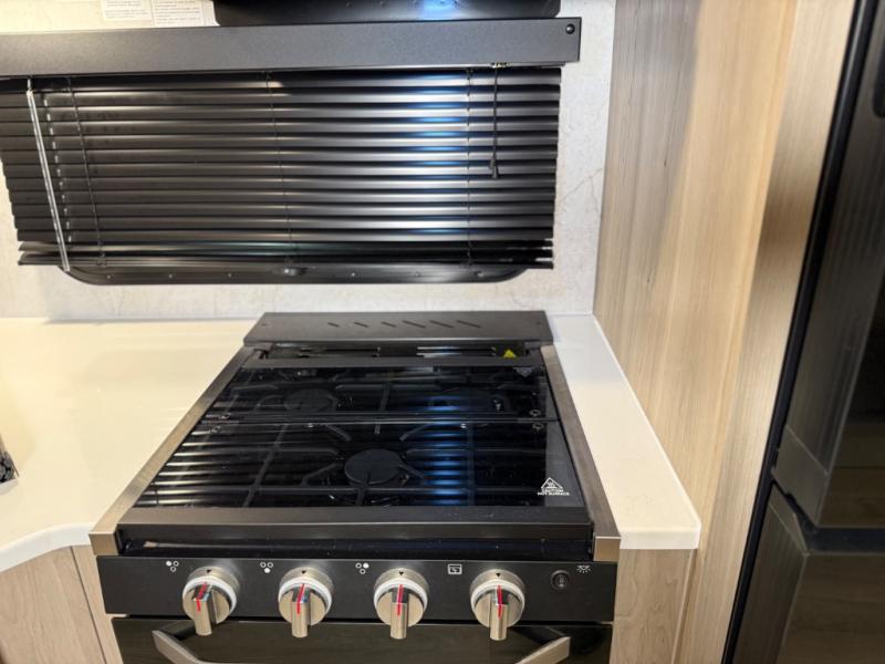 When you are outside this trailer you can enjoy the protection from the 21' power awning, and whip up a meal using the outside griddle. You will find exterior storage for your extra gear, and a ladder at the rear. You get to choose which entrance to step up into, be it the spacious rear bedroom with a queen bed slide and a wardrobe, or the main entry into the kitchen and living area. The furniture slide includes a booth dinette to eat your meals at, and theater seating to watch the Smart TV with a fireplace below. And the cook will love the front kitchen with extra counter space, a three burner range, plus a 12V refrigerator and pantry for food storage!